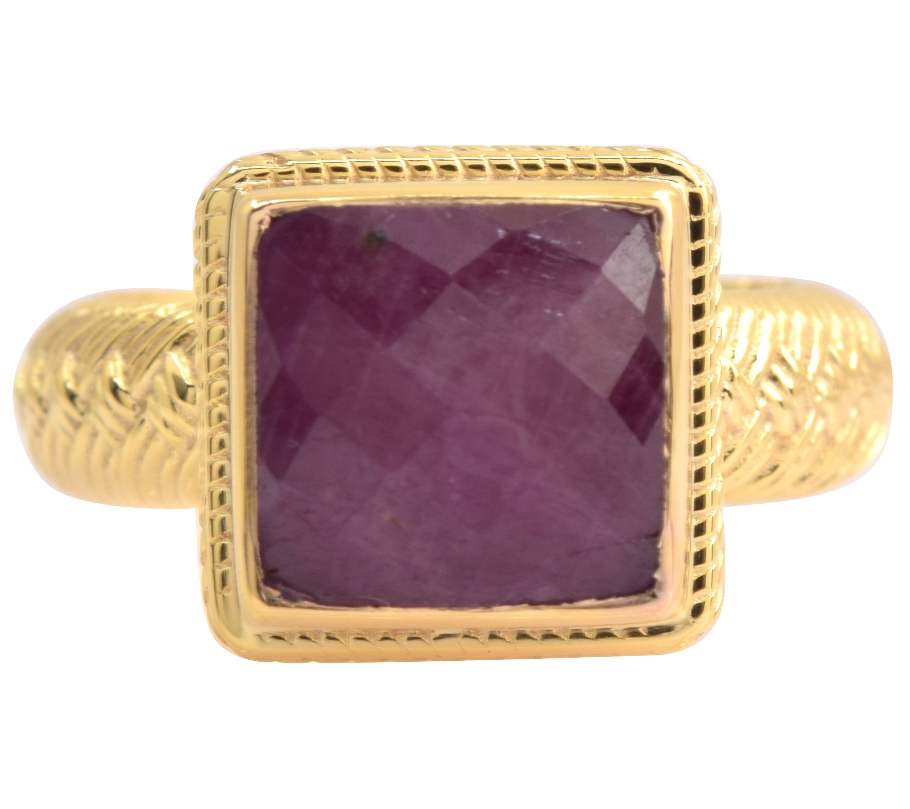 • Square-cut, bezel-set Indian ruby with a checkerboard cut on top and a textured setting