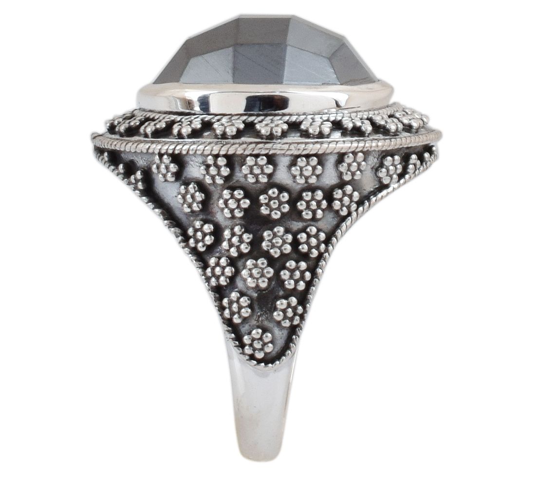 Bold, earthy, and full of shimmer, this sterling silver ring is adorned with a stunning hematite center stone to captivate attention. From Artisan Crafted.