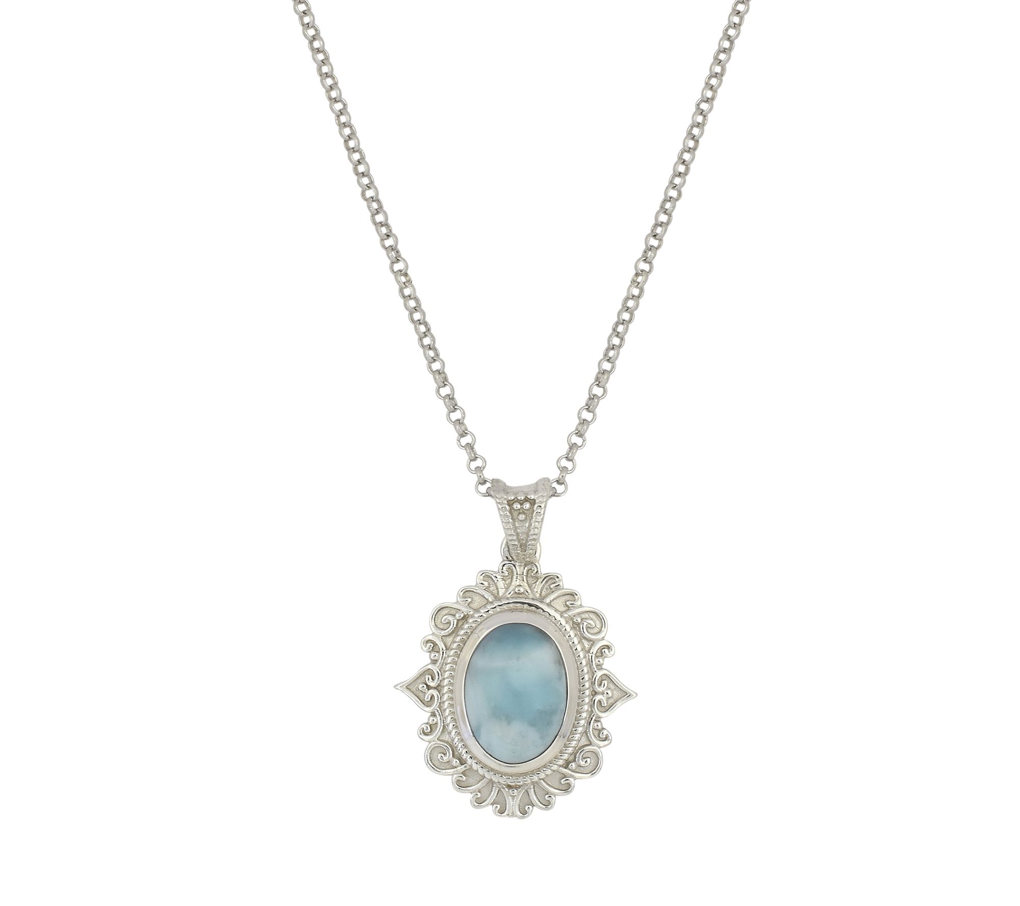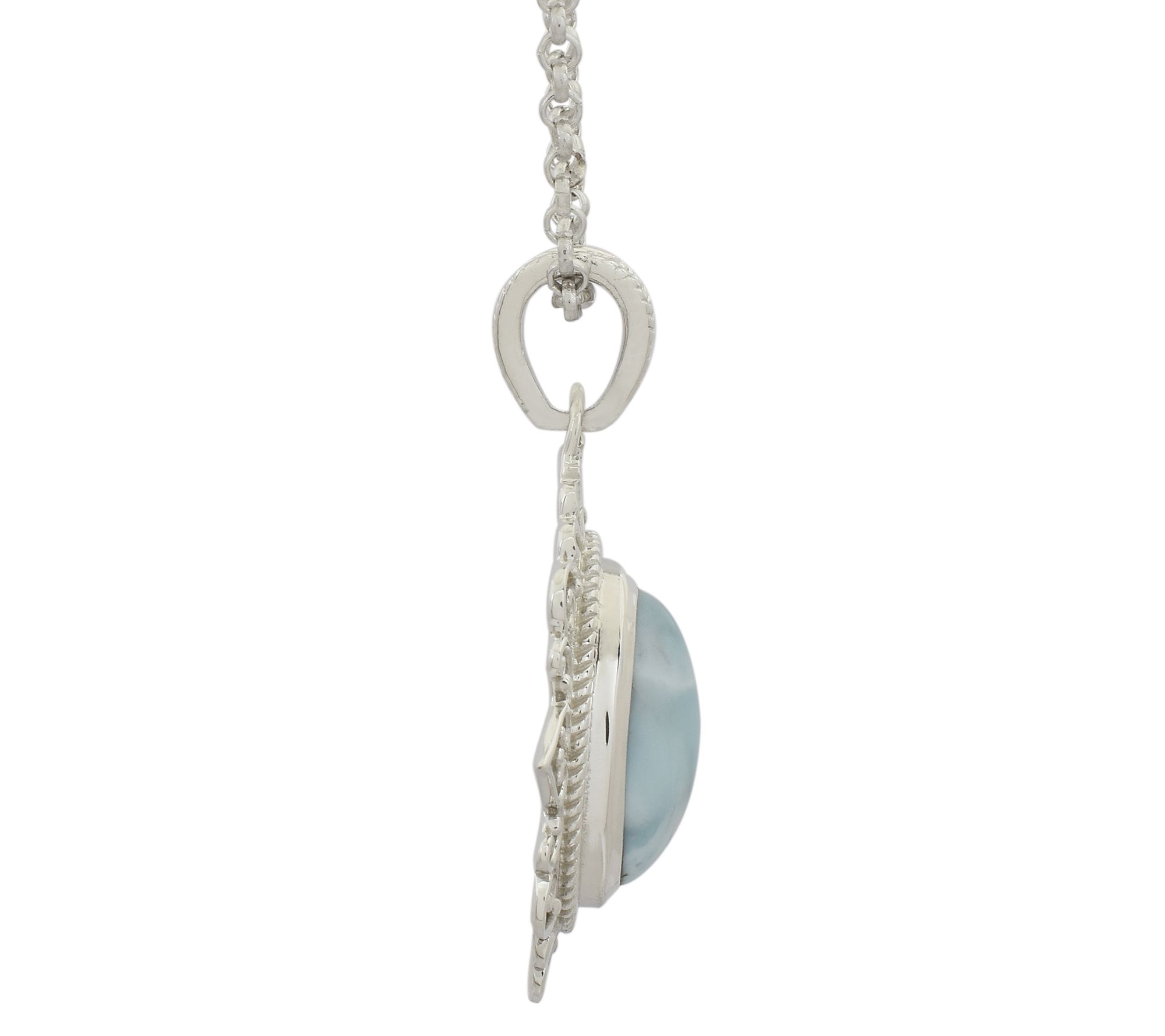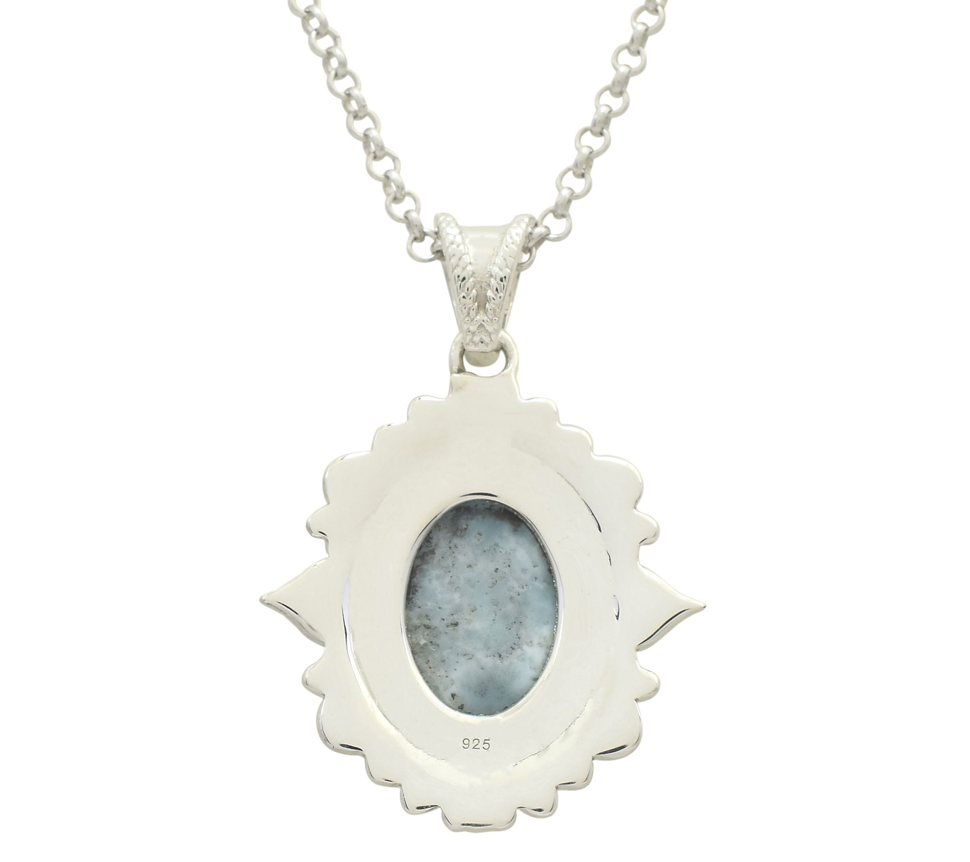 Embrace the elegance of this artisan-crafted pendant featuring a stunning larimar stone. The bezel-set oval cabochon radiates a calming blue hue.