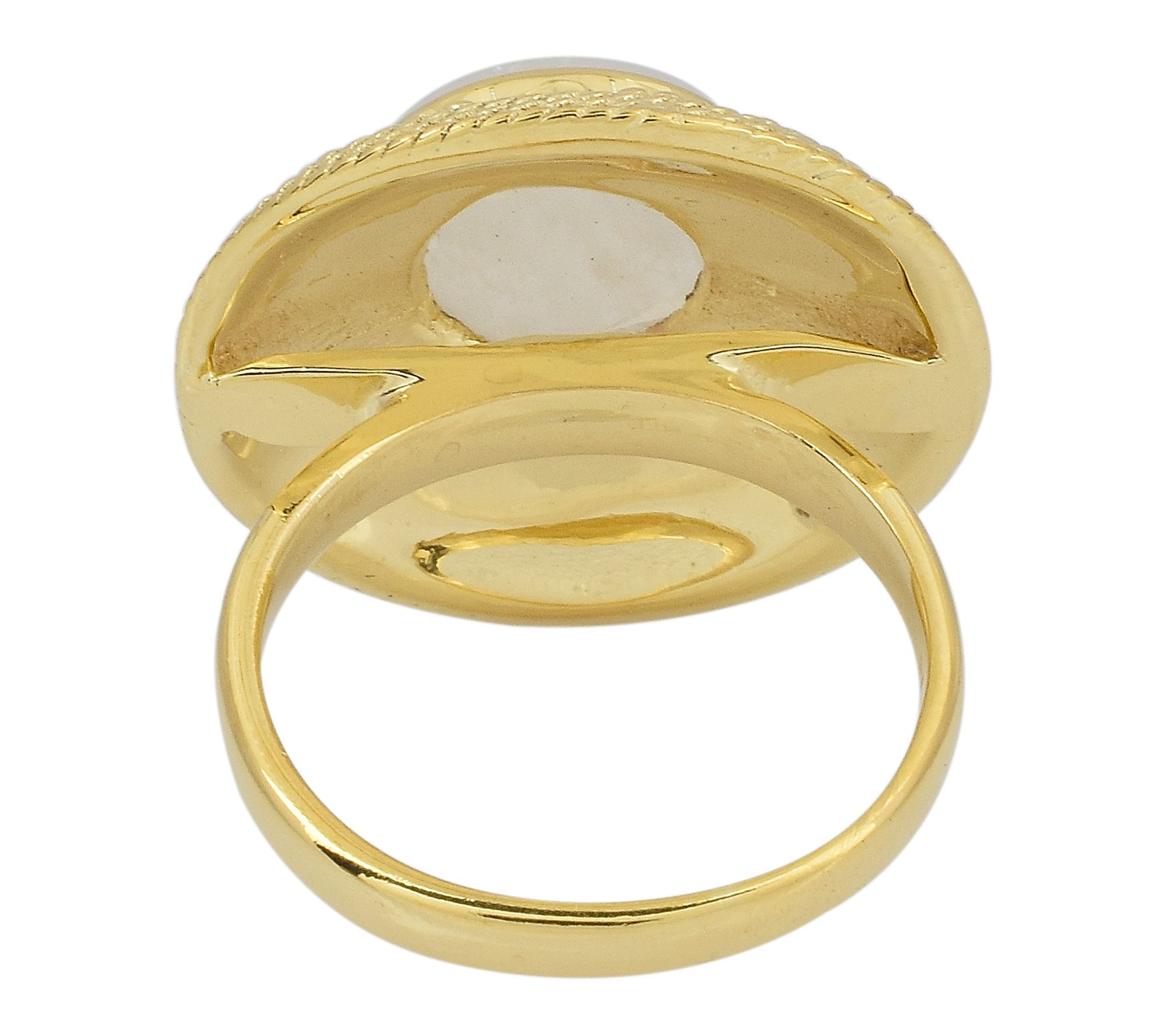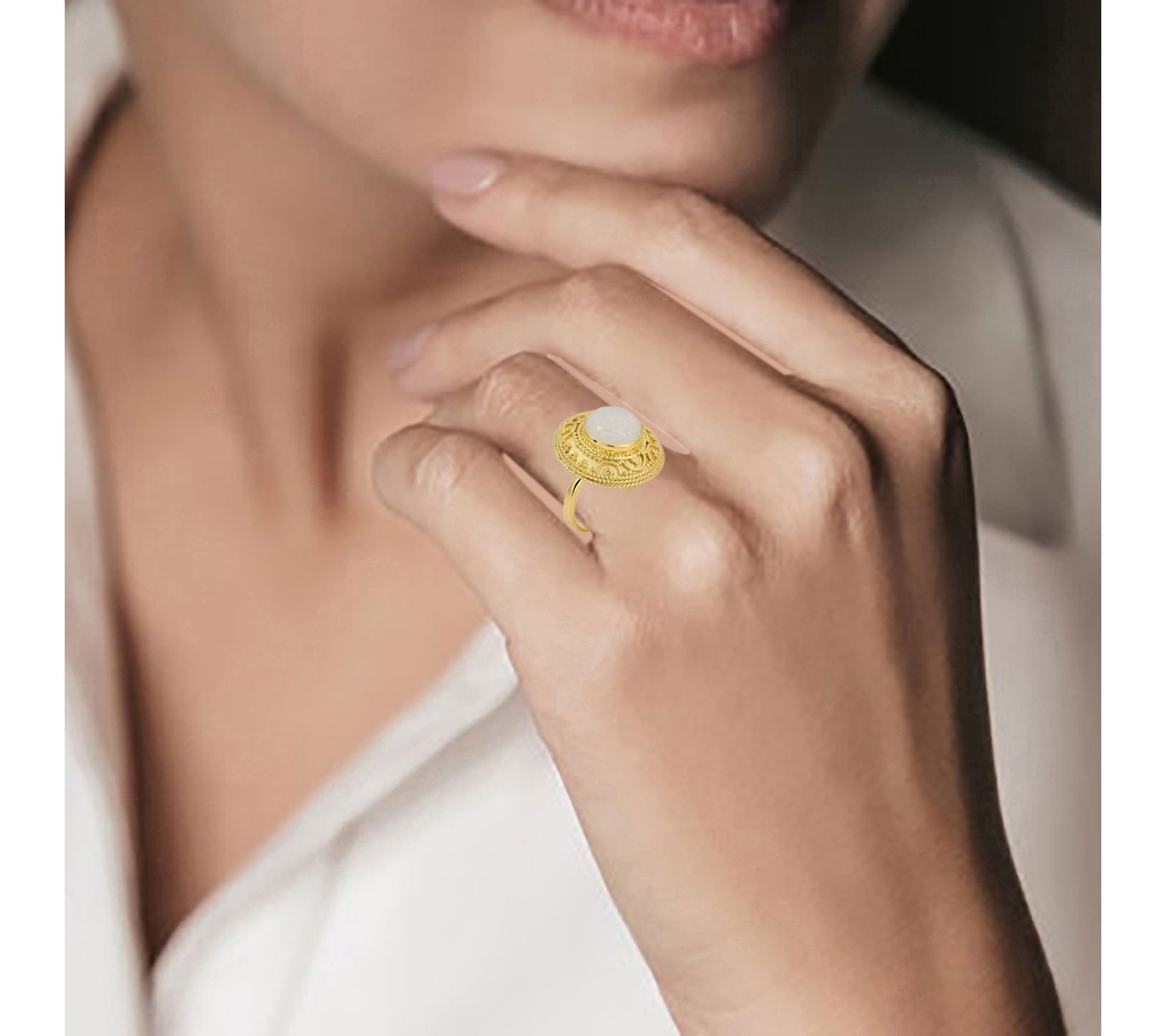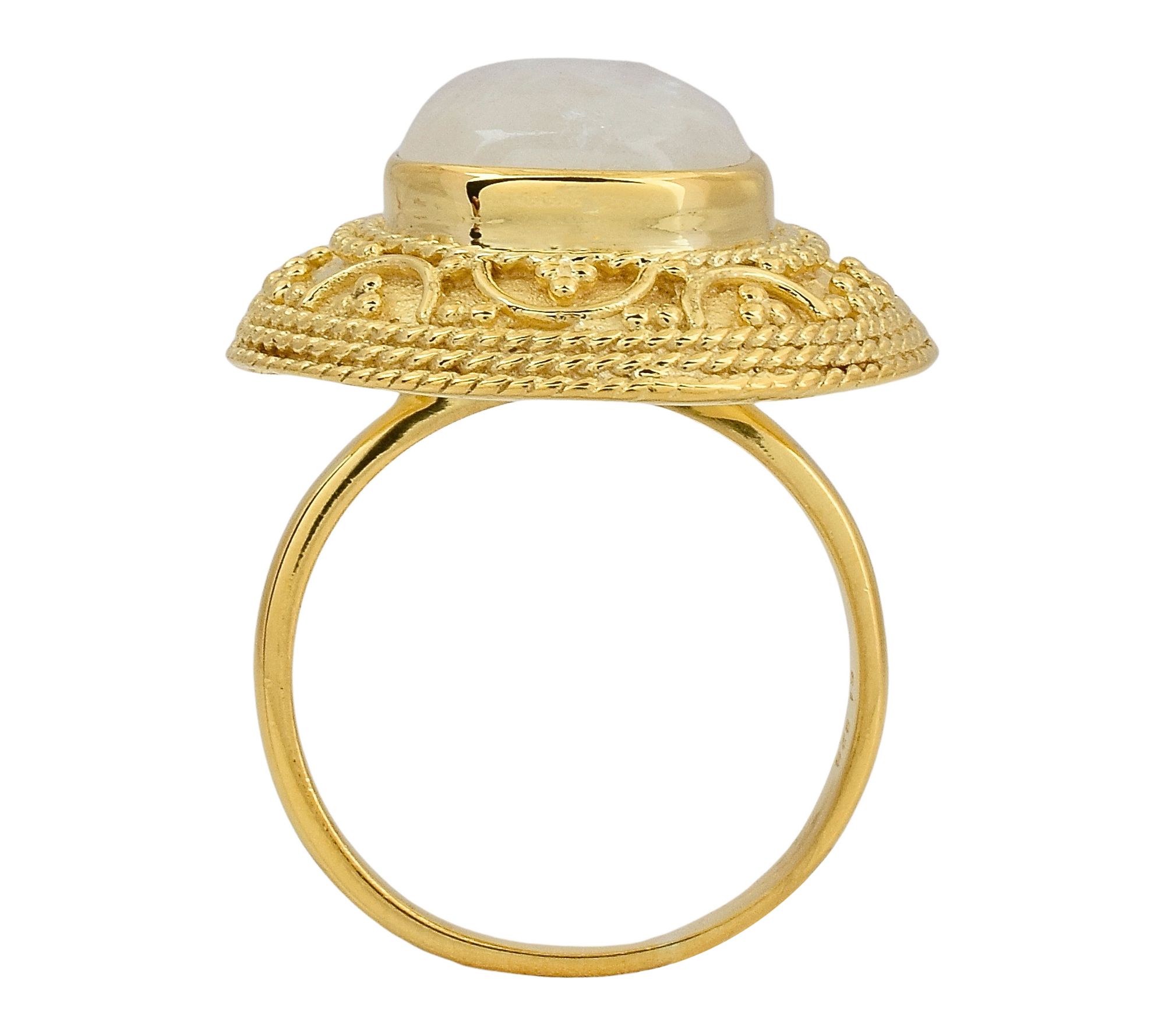 Make every occasion shine a little brighter with this artisan cocktail ring, graced by a glowing round rainbow moonstone cabochon in a bold bezel setting. Delicate wire and bead detailing, paired with 14K gold-plated accents over sterling silver, create a striking statement piece that's ready to catch the light at a dinner party or elevate your everyday style. From Artisan Crafted.
