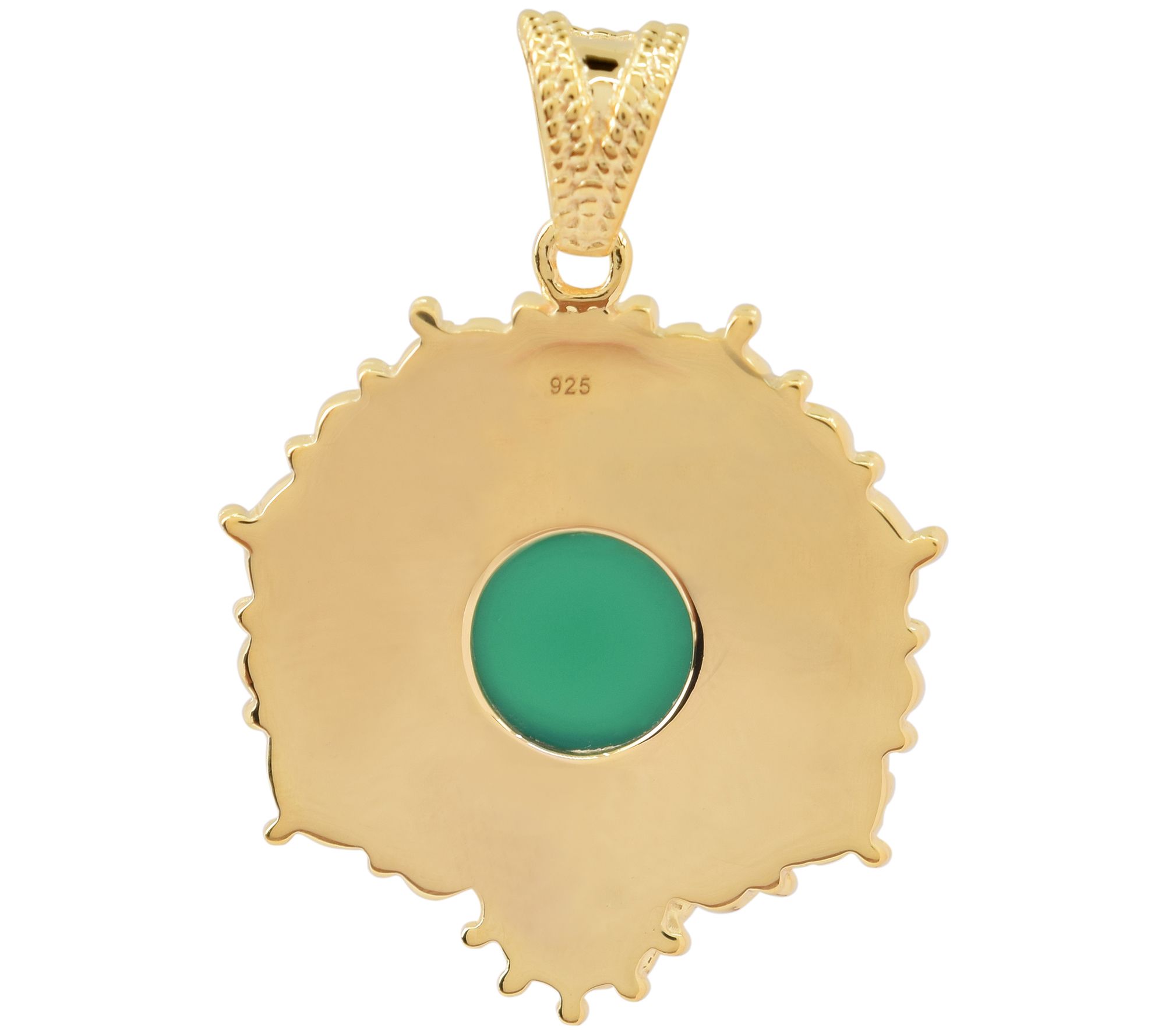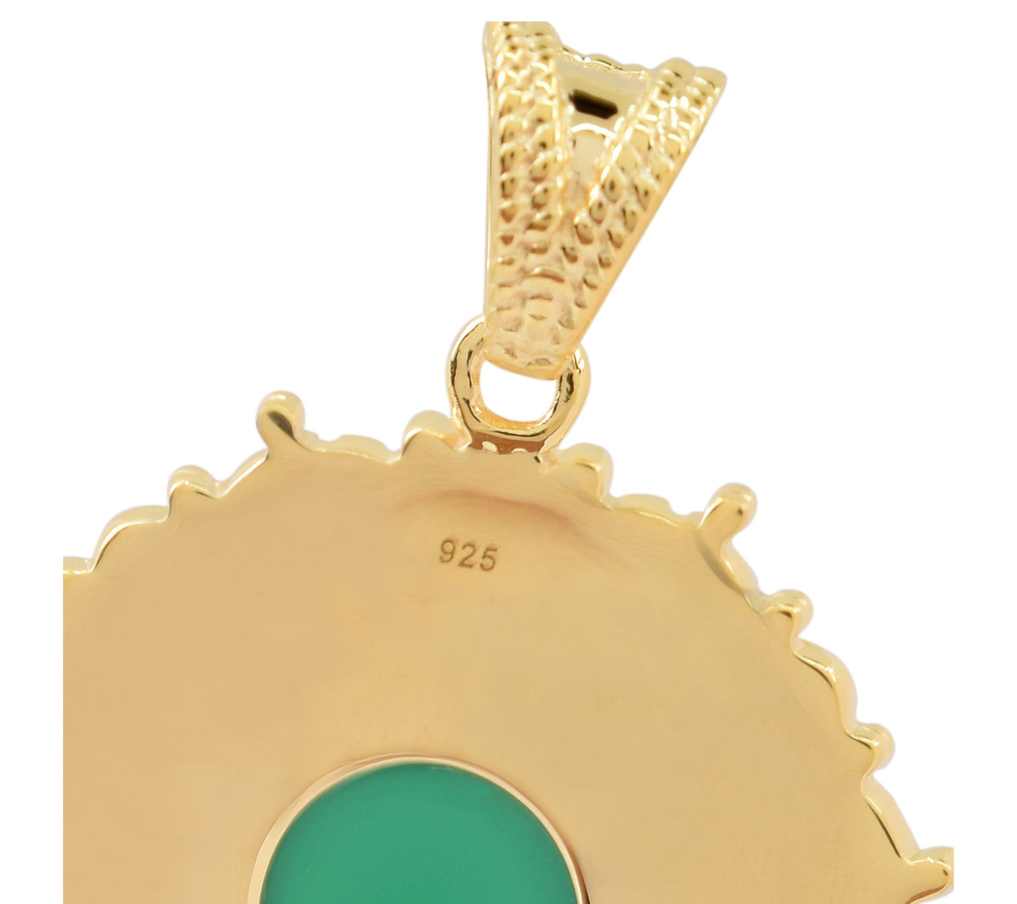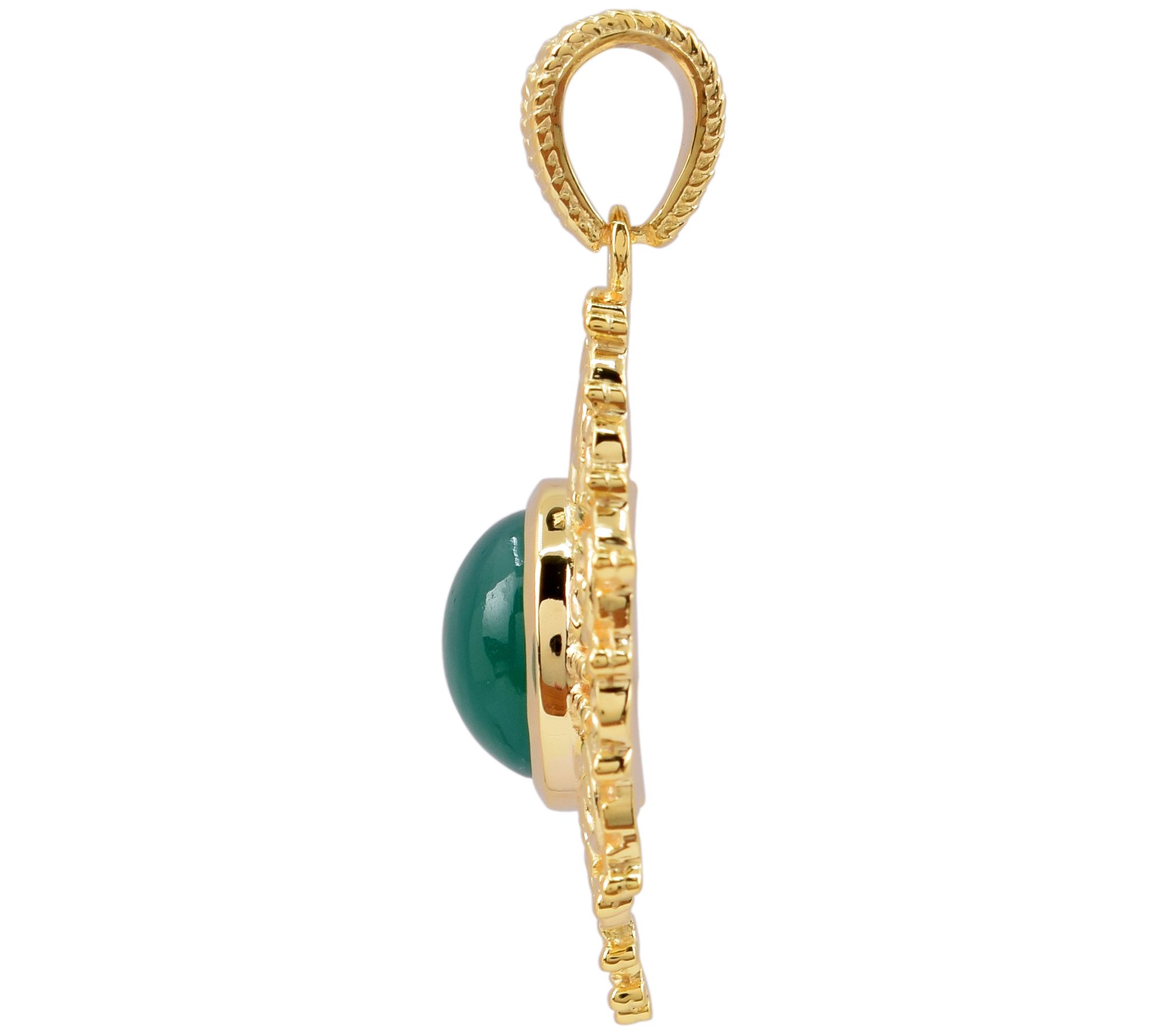 • Bezel-set, round-cut emerald chalcedony with detailed textures around and on bail