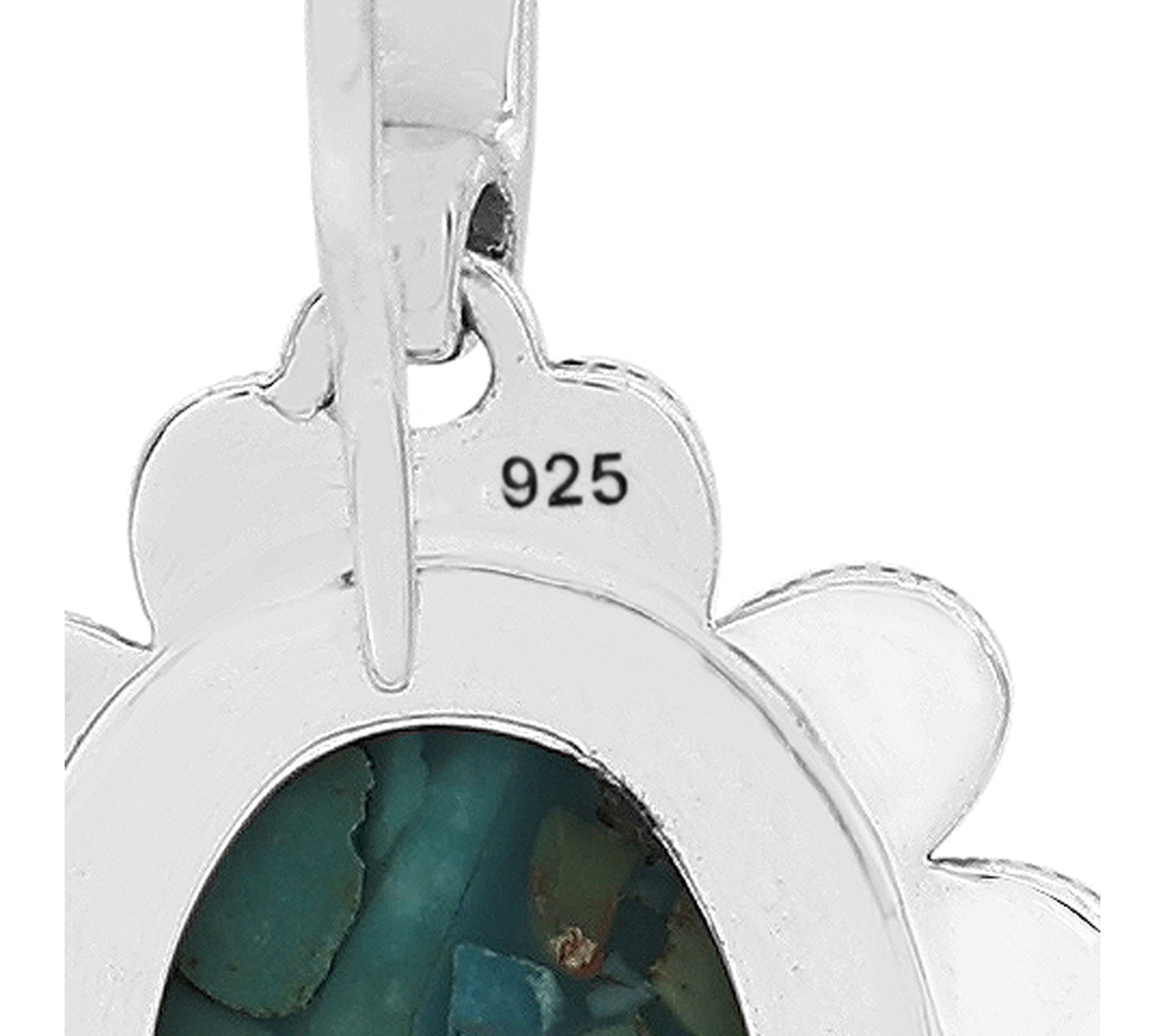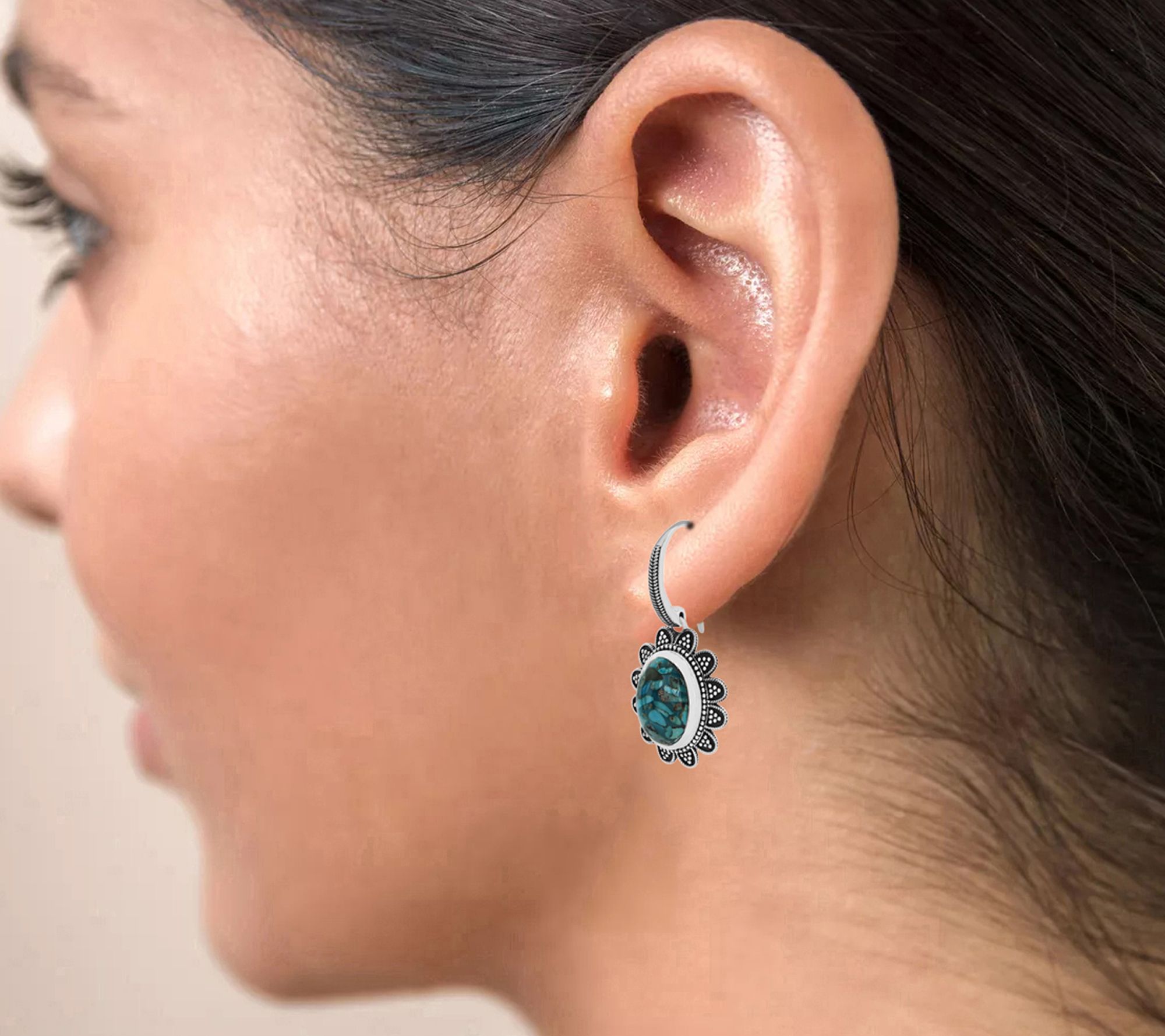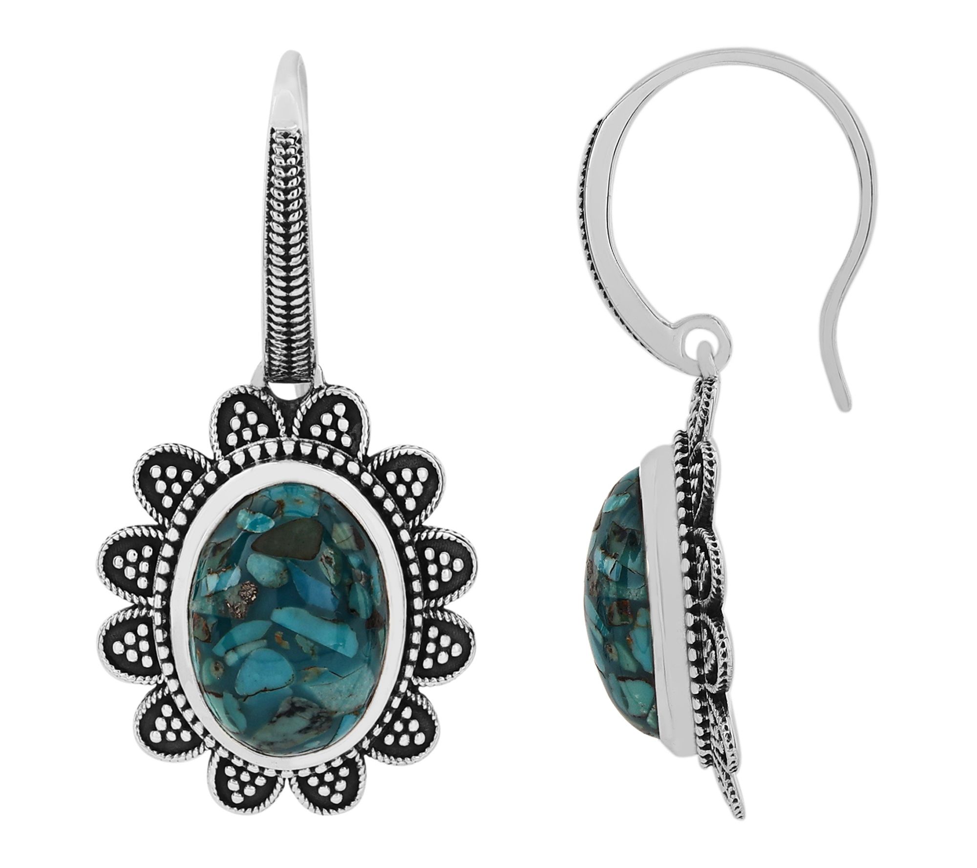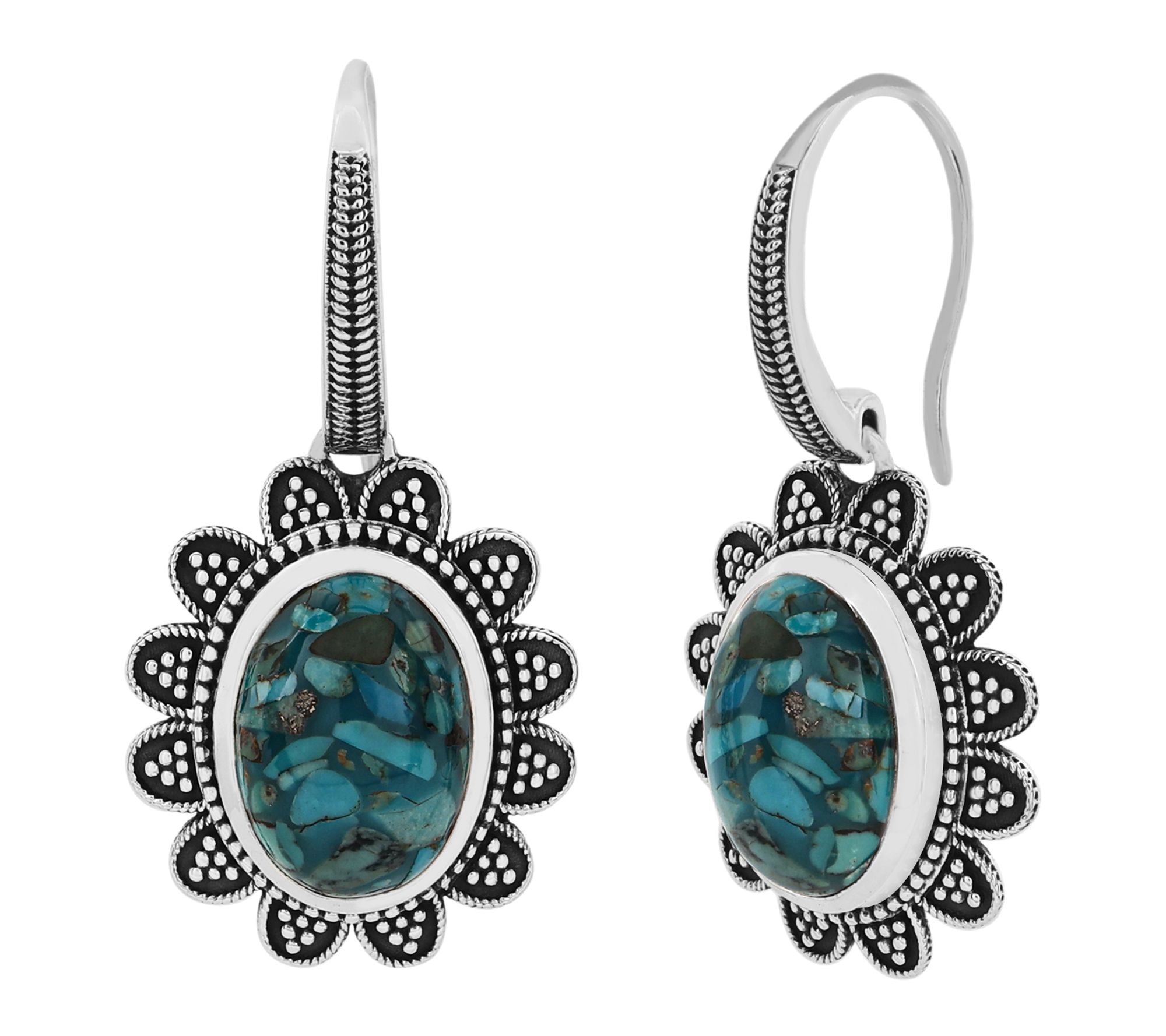 Oval, bezel-set blue composite turquoise cabochons; oxidized finish; dangle style