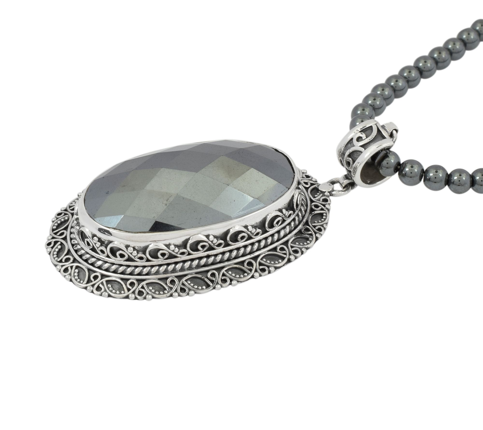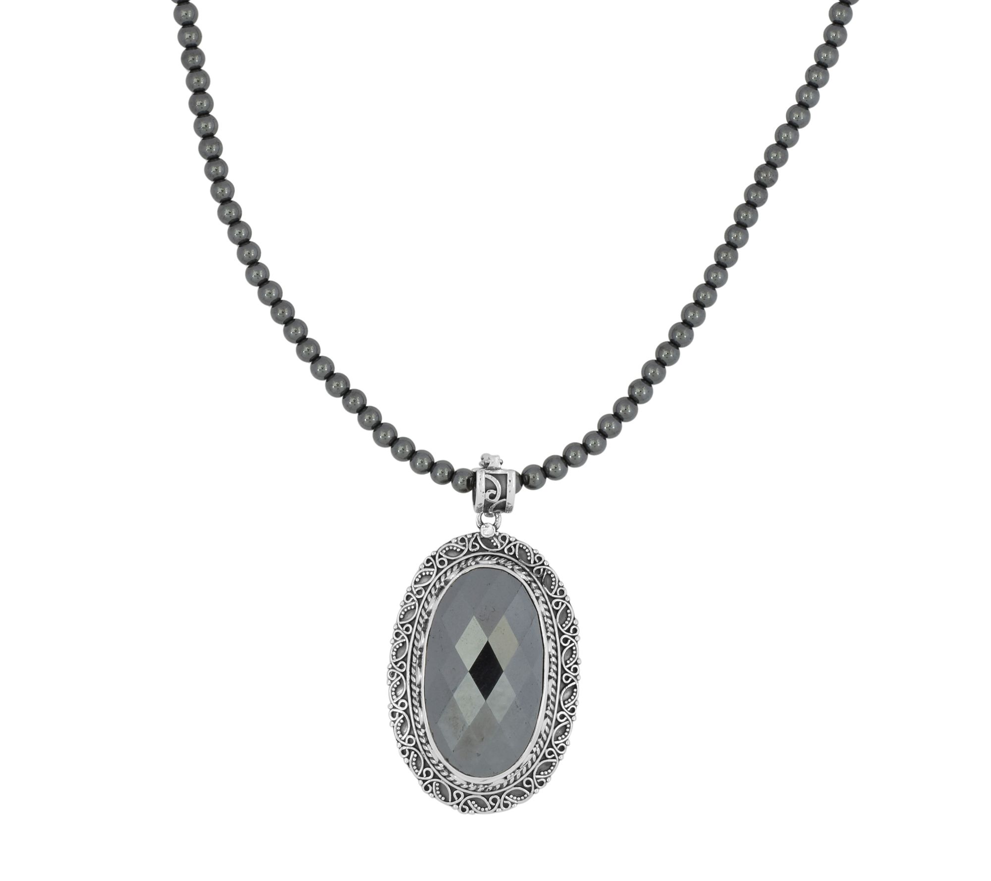 Elevate your ensemble with this Artisan Crafted hematite pendant necklace. The distinctive combination of oval checkerboard-cut hematite and plain round beads adds an intriguing touch to any outfit.