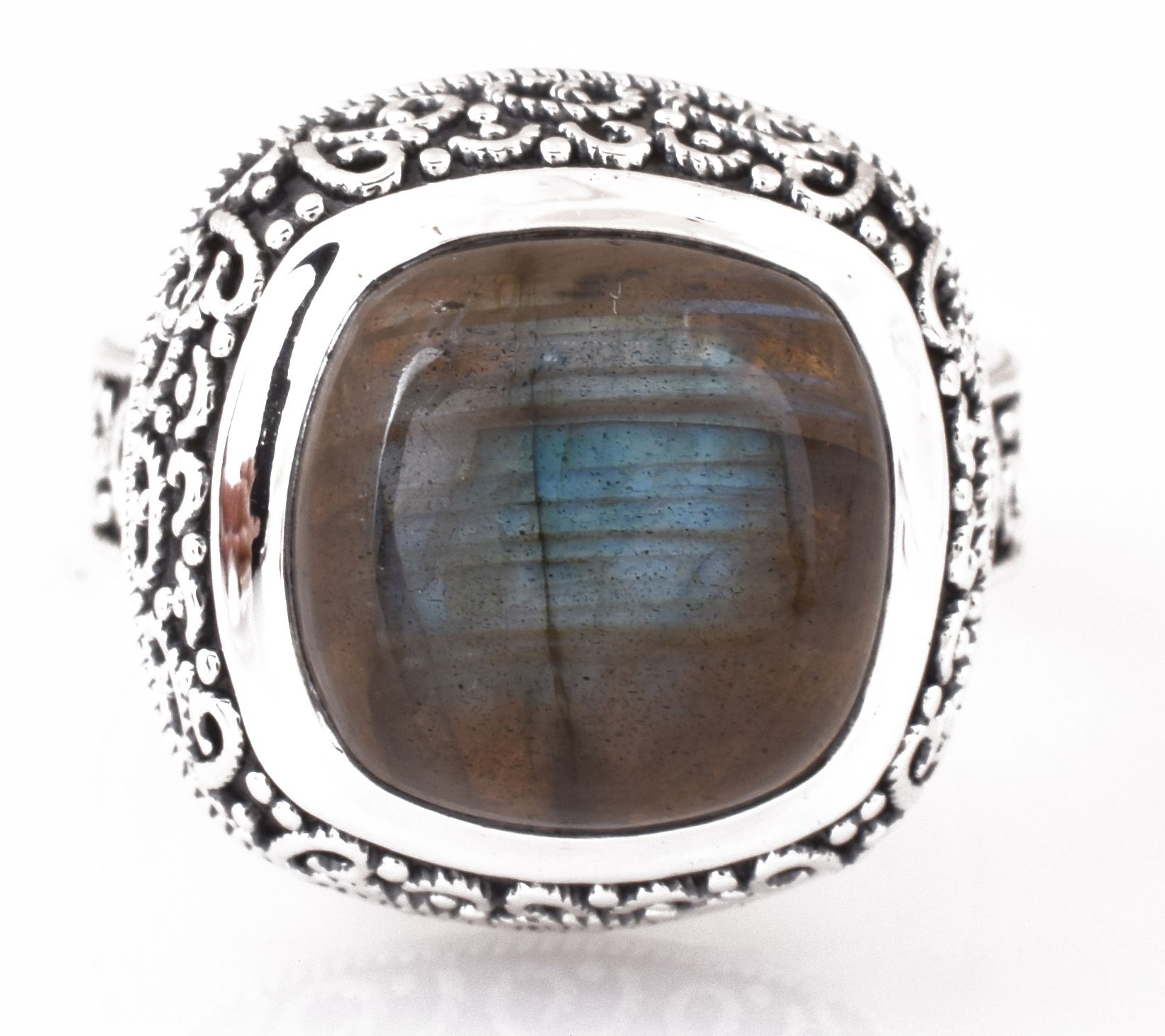 Solitaire ring with cushion-cut, bezel-set labradorite