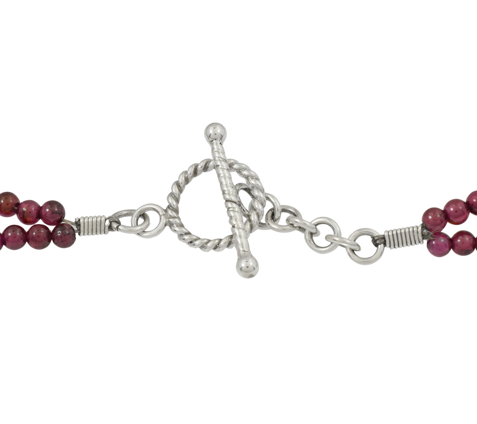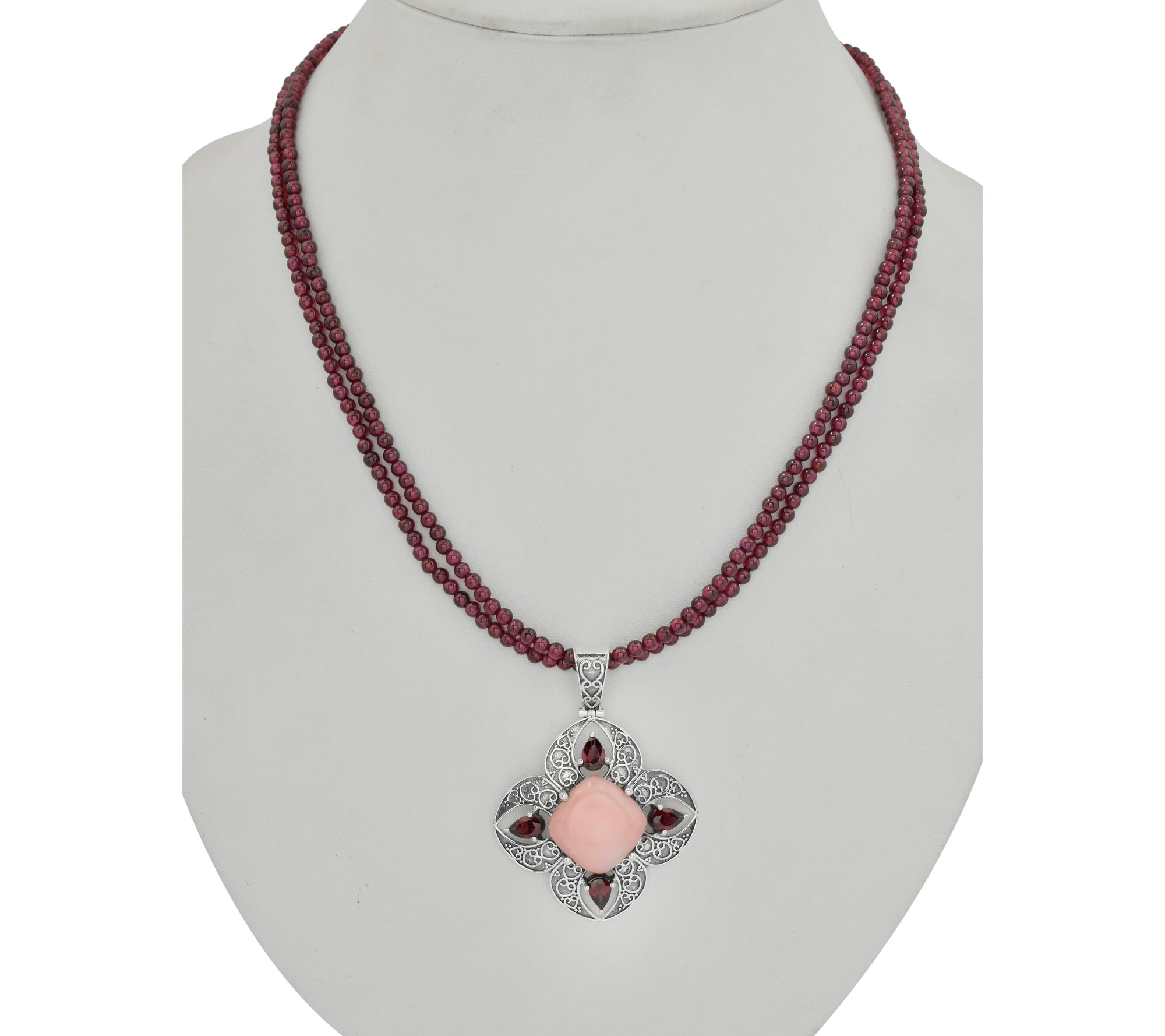 Enhance your jewelry collection with an exquisite Artisan Crafted multi-gemstone pendant. The captivating pink opal cushion cabochon pairs beautifully with rhodolite pear cuts and garnet round beads.