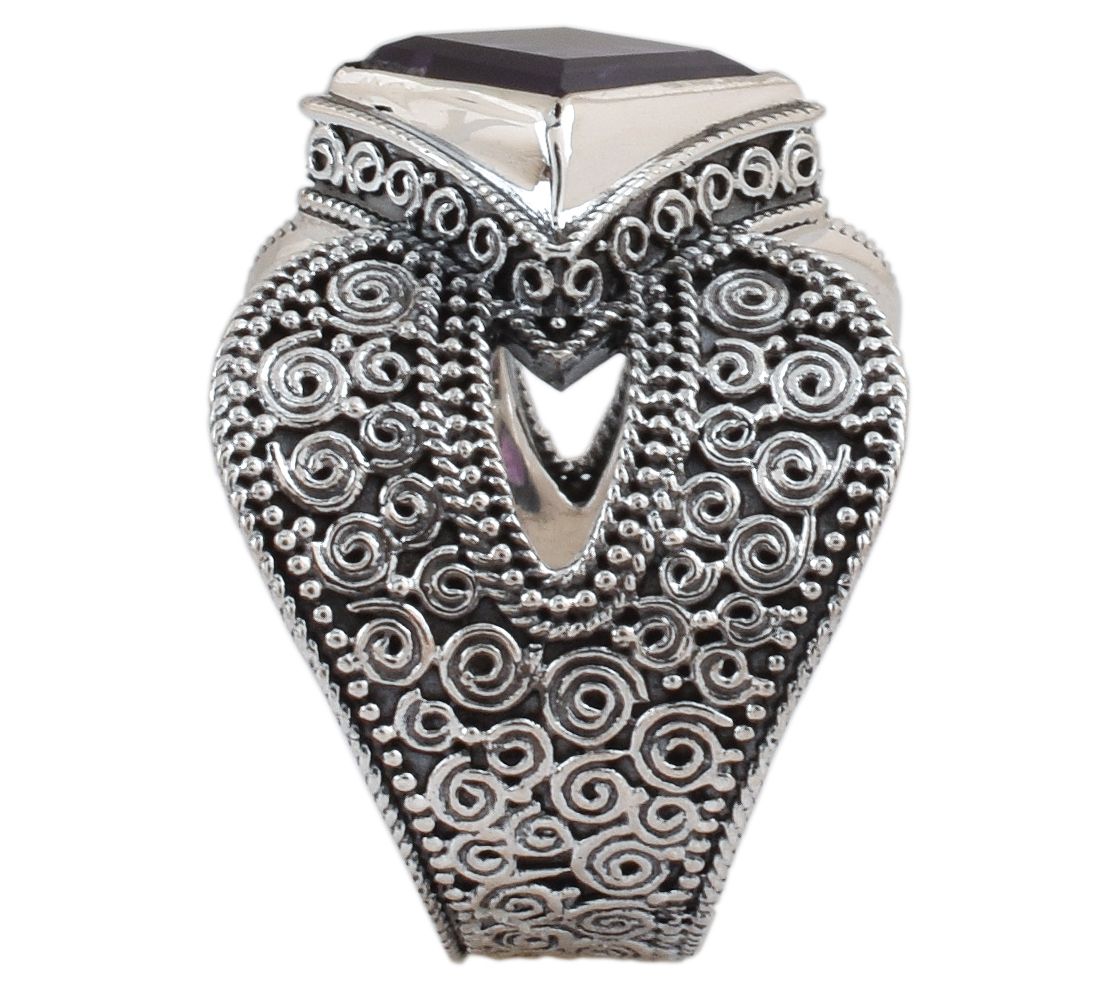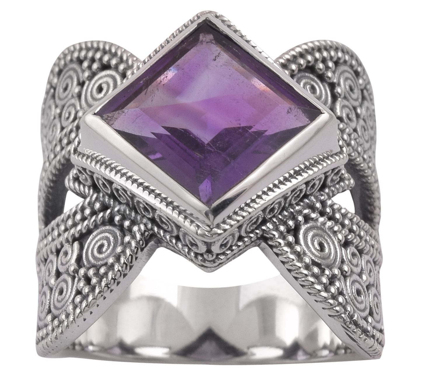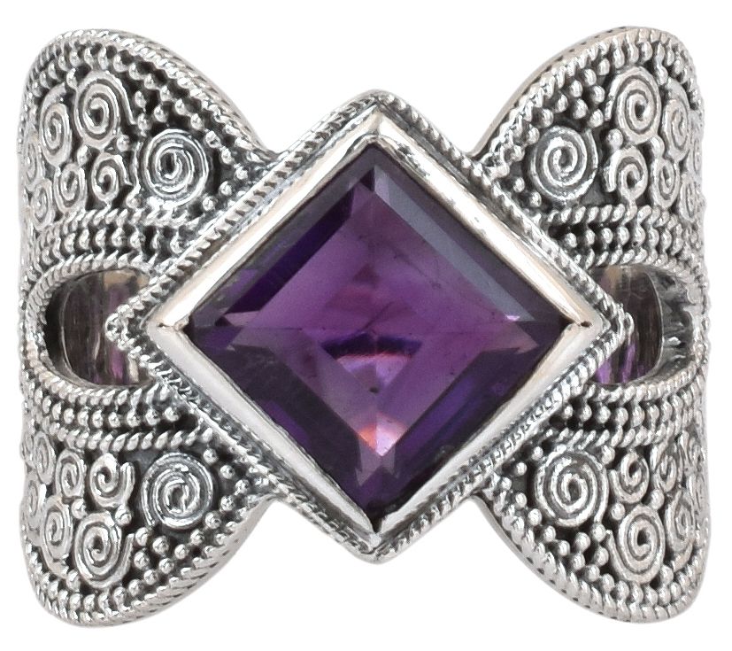 Oxidized scrollwork ring with square-cut, bezel-set amethyst
