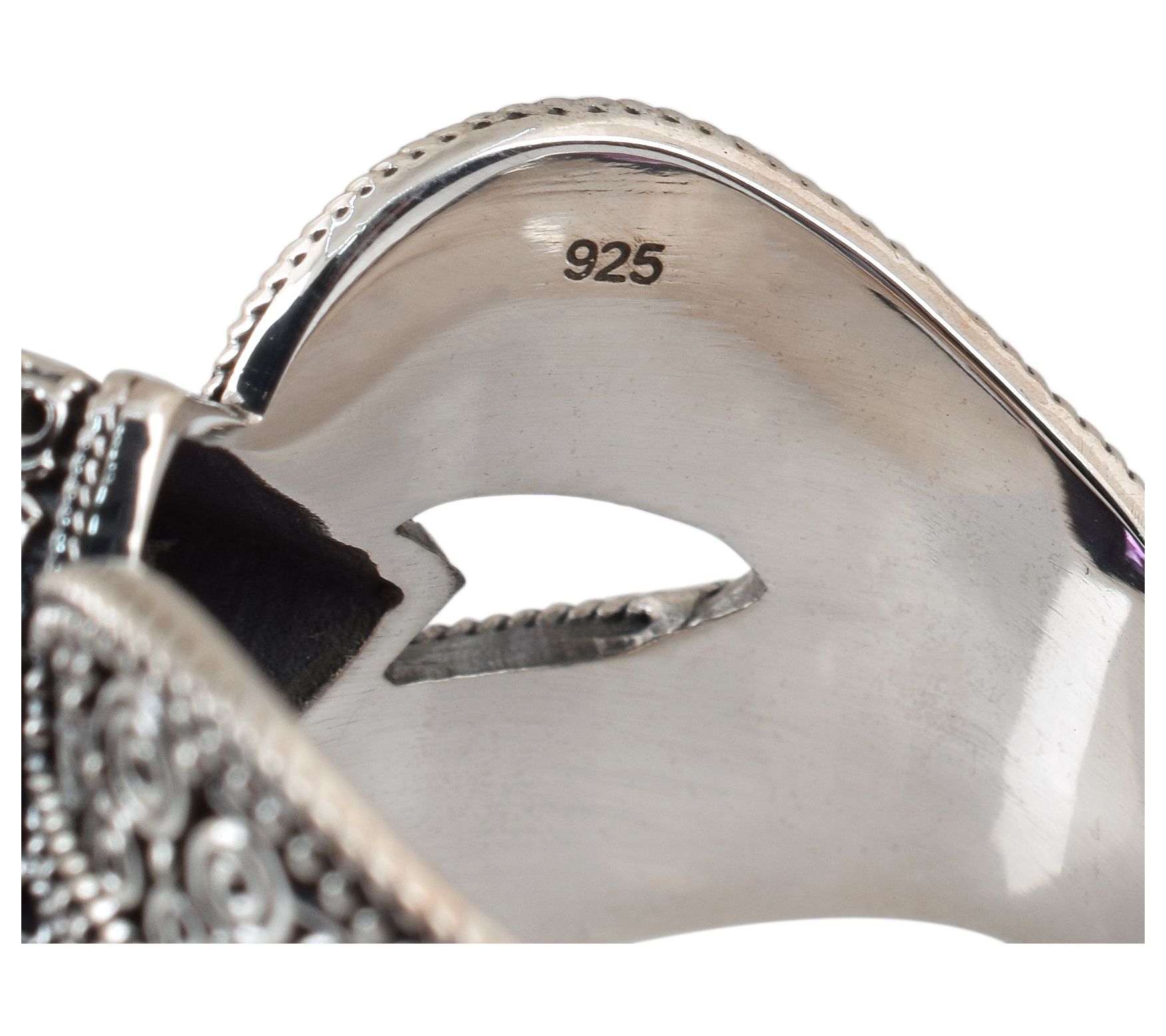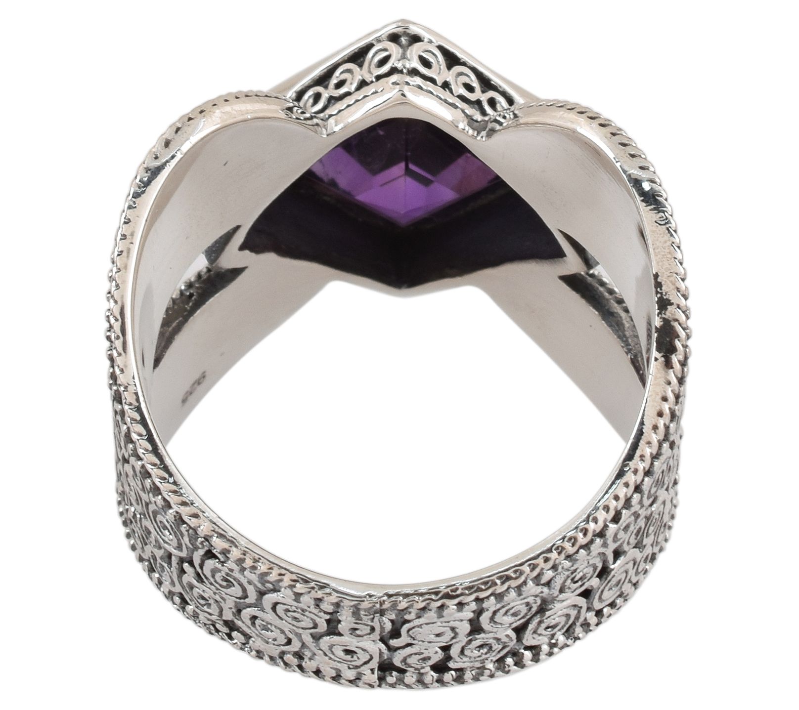 Stand out from the crowd! This sterling silver stunner is designed with intricate scrollwork details and a breathtaking bezel-set amethyst to glitter brightly on any finger. From Artisan Crafted.