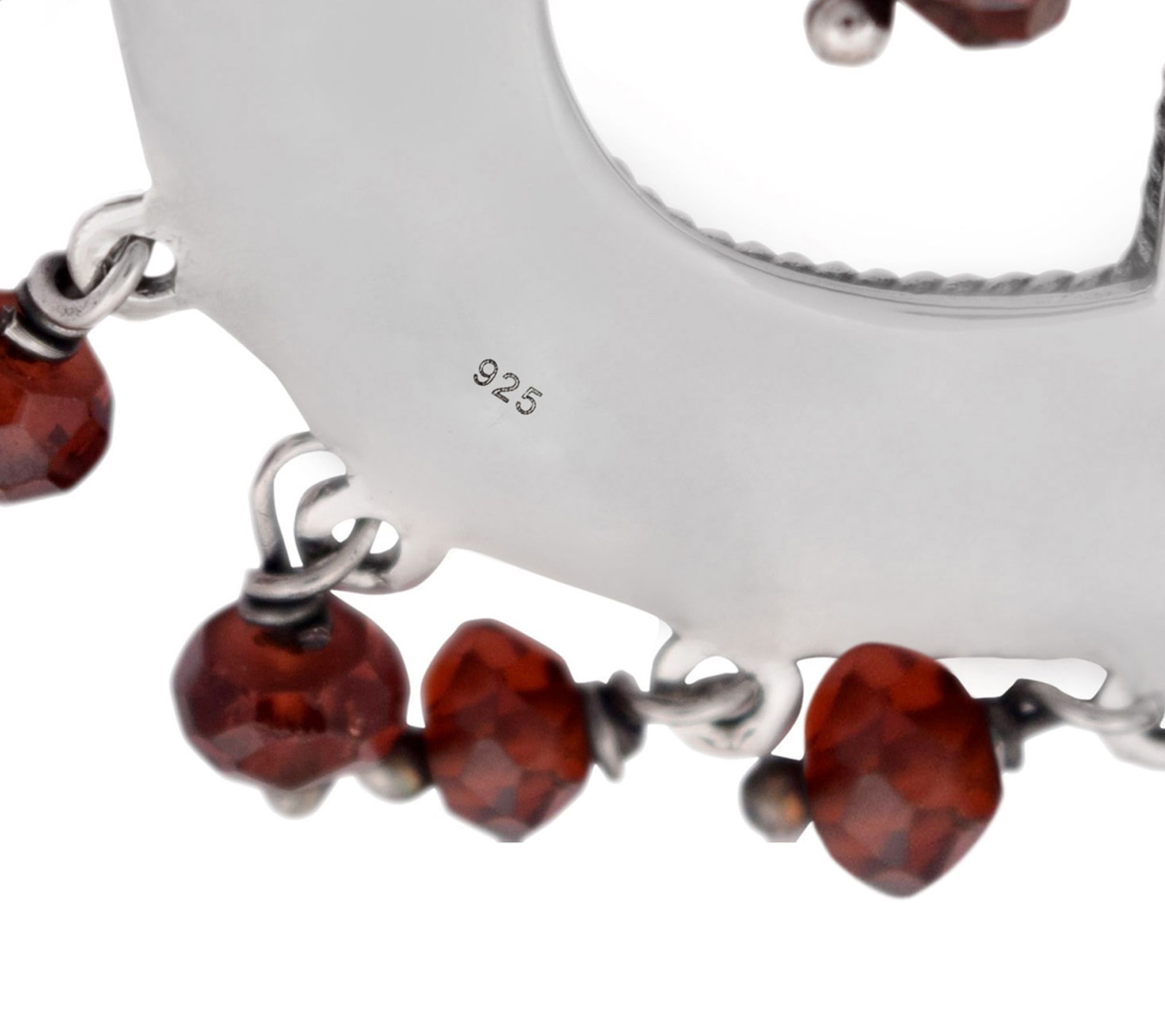 - Fan-shaped sterling silver chandelier; cutout center; fringed edge with faceted garnet beads; oxidized finish