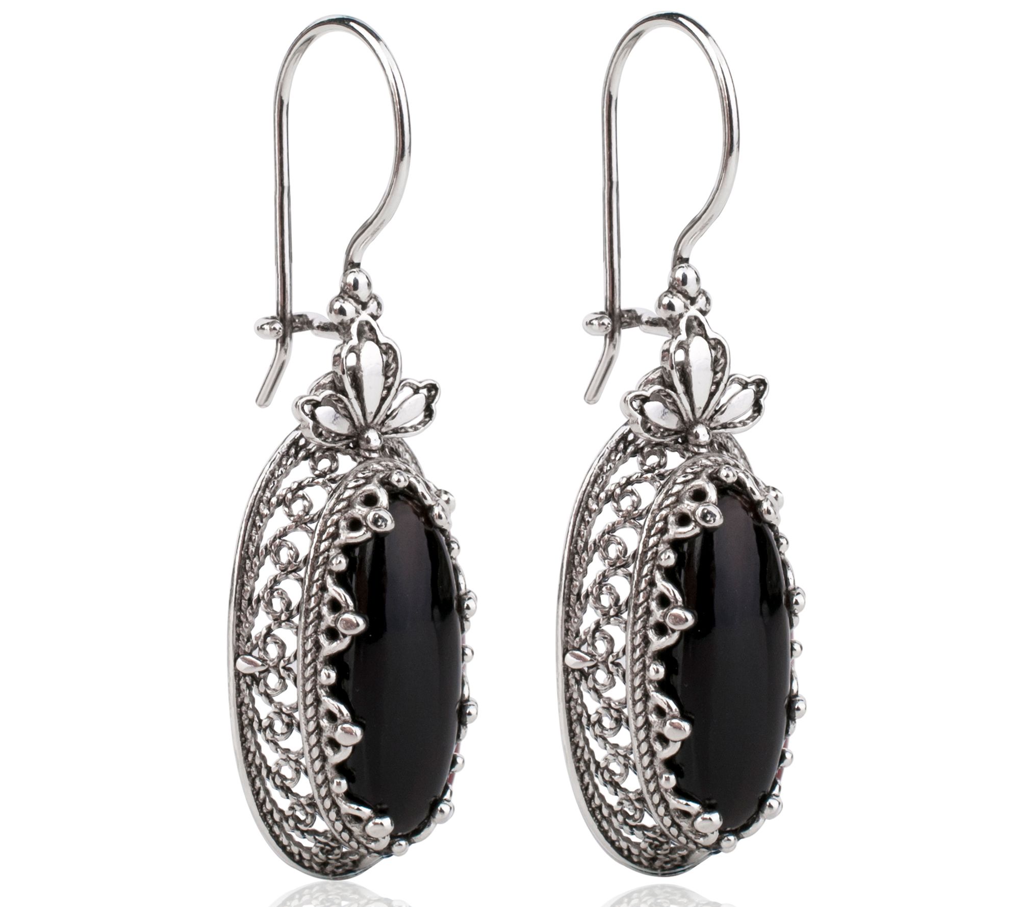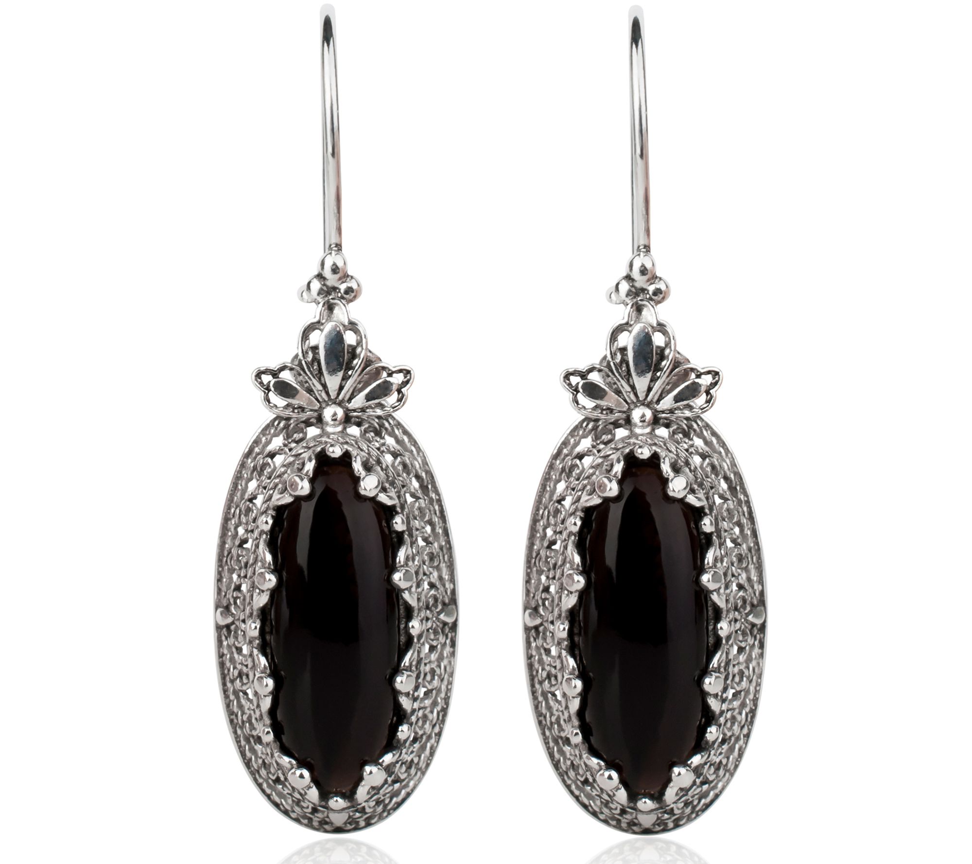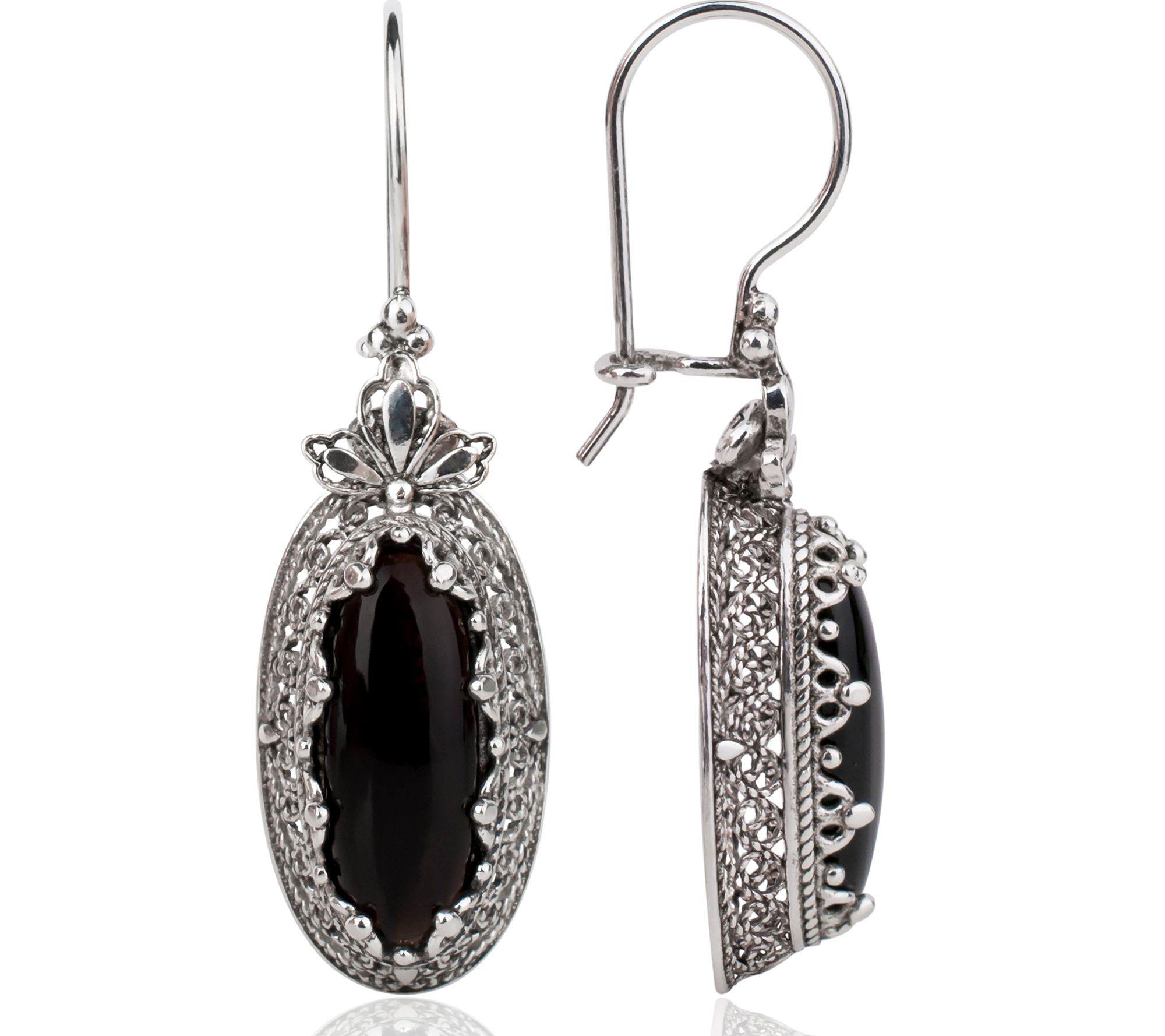 • Elongated drop design; opaque gemstone; filigree openwork