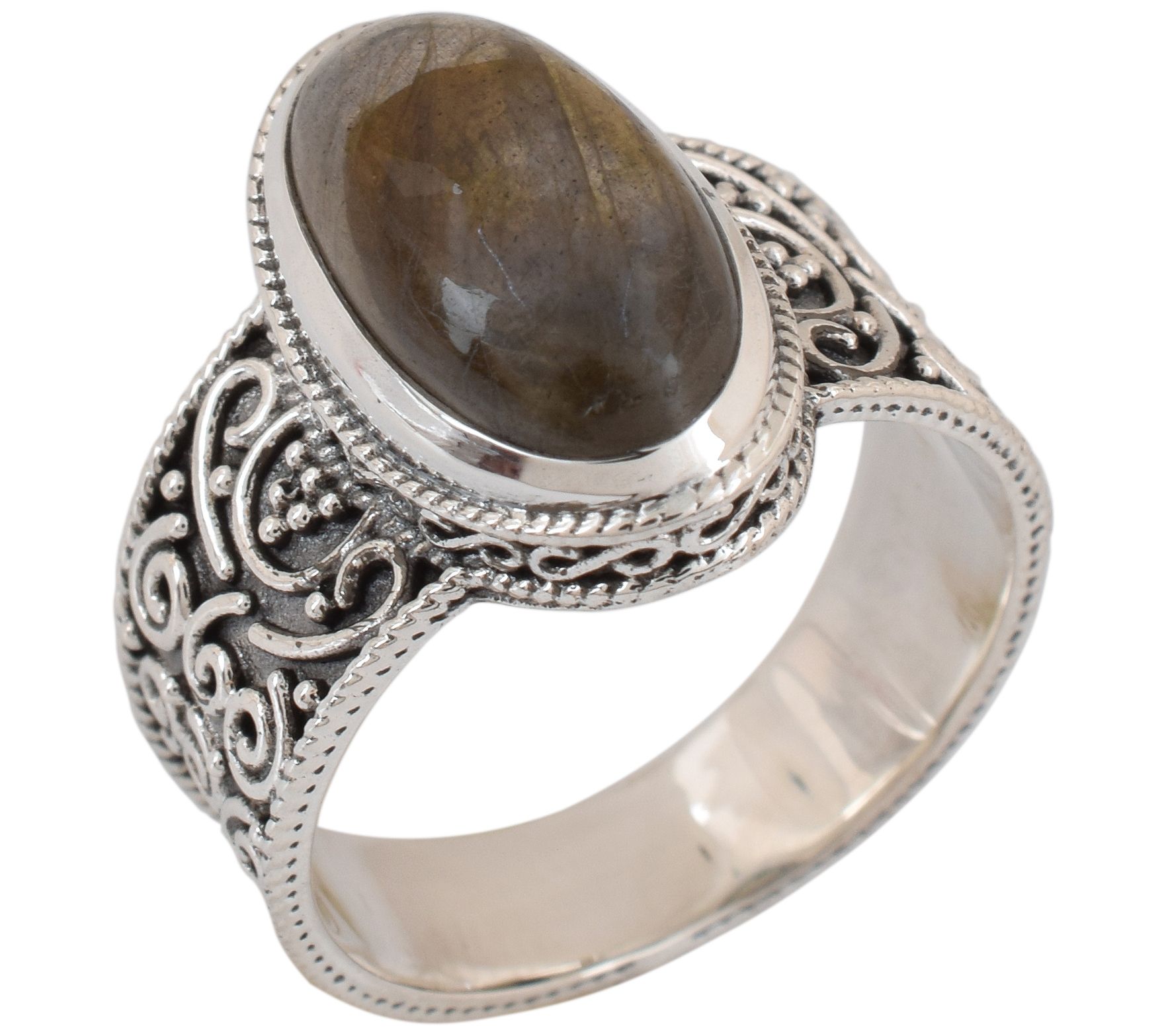 Wrap your finger in the mystical allure of this sterling silver and labradorite ring. This unique piece showcases a captivating labradorite oval cabochon, artfully set in a bezel setting, which is complemented by an exquisite oxidized finish for a vintage-inspired appeal. From Artisan Crafted.