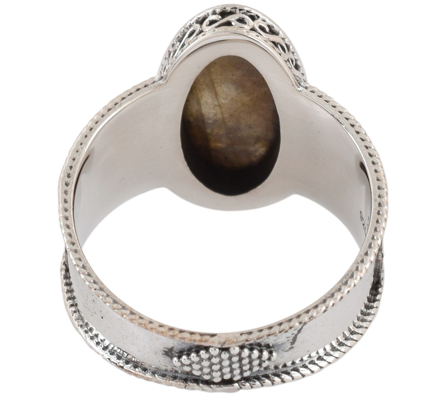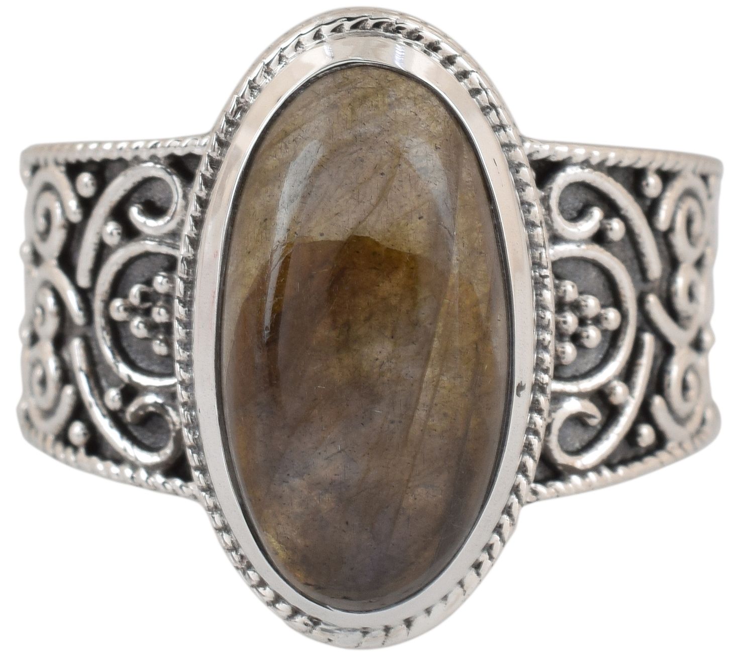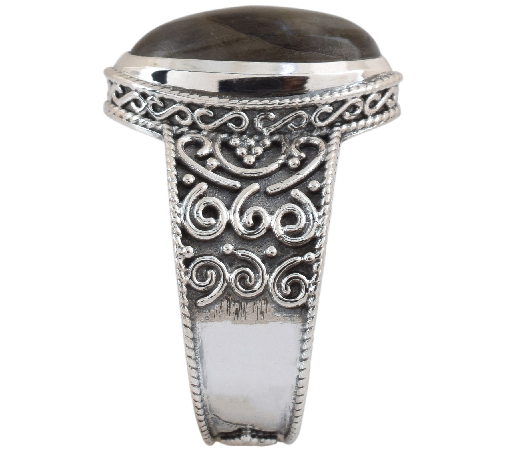 Oval-cut labradorite cabochon in a bezel setting; oxidized finish