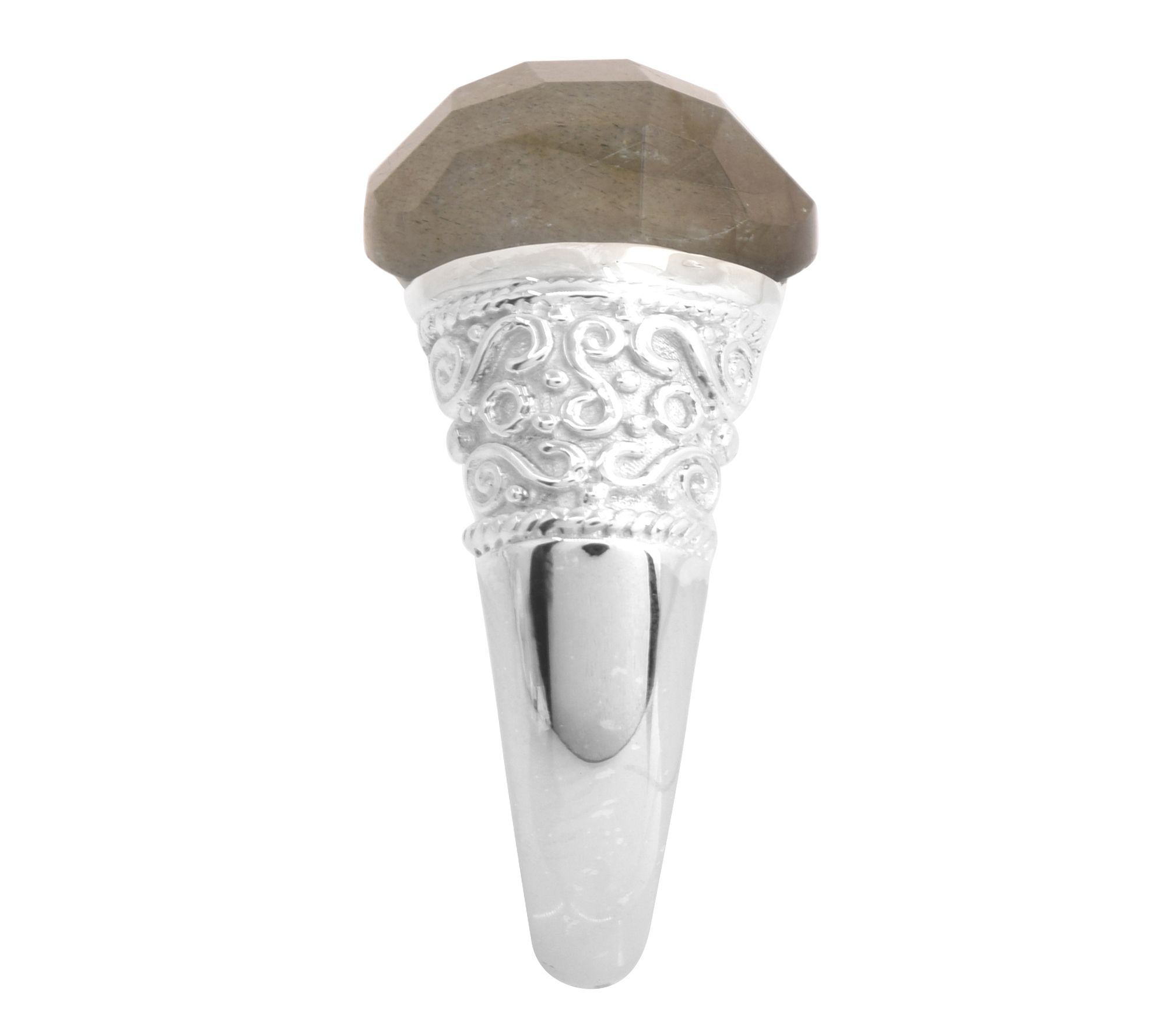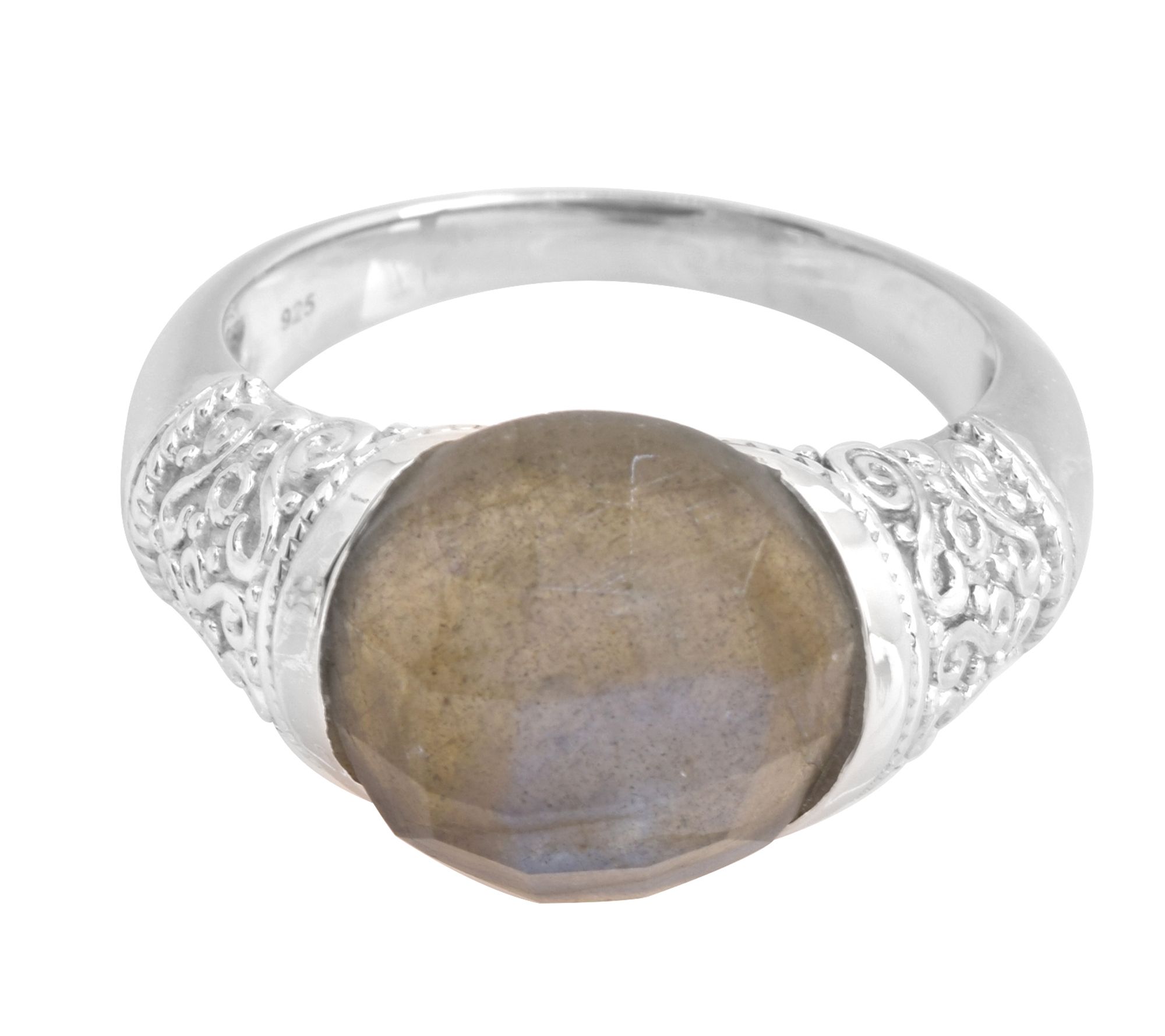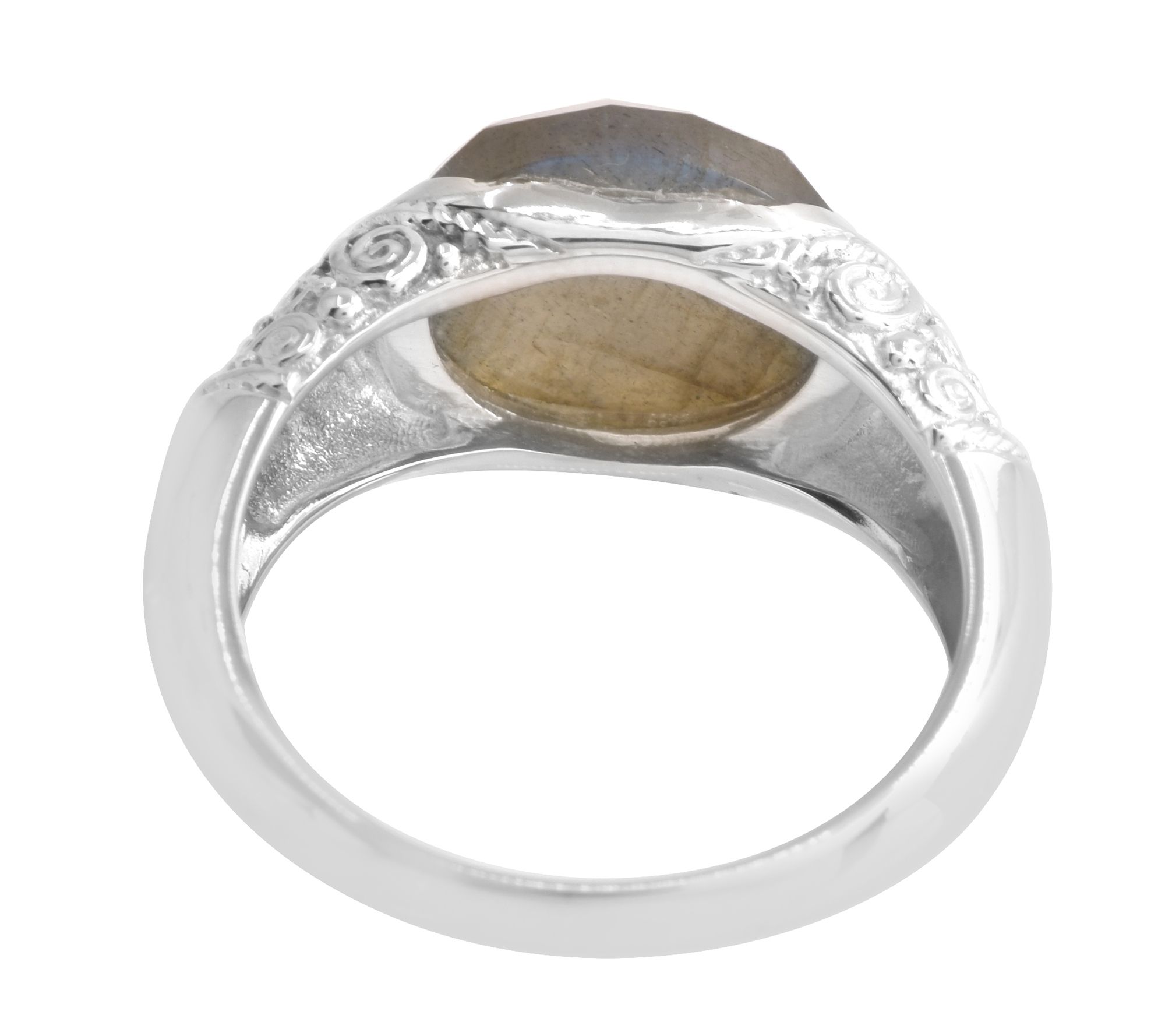 - Bezel-set, checkerboard-cut labradorite in a ring with scrollwork designs