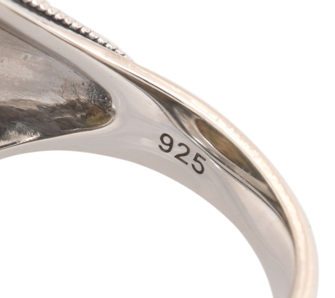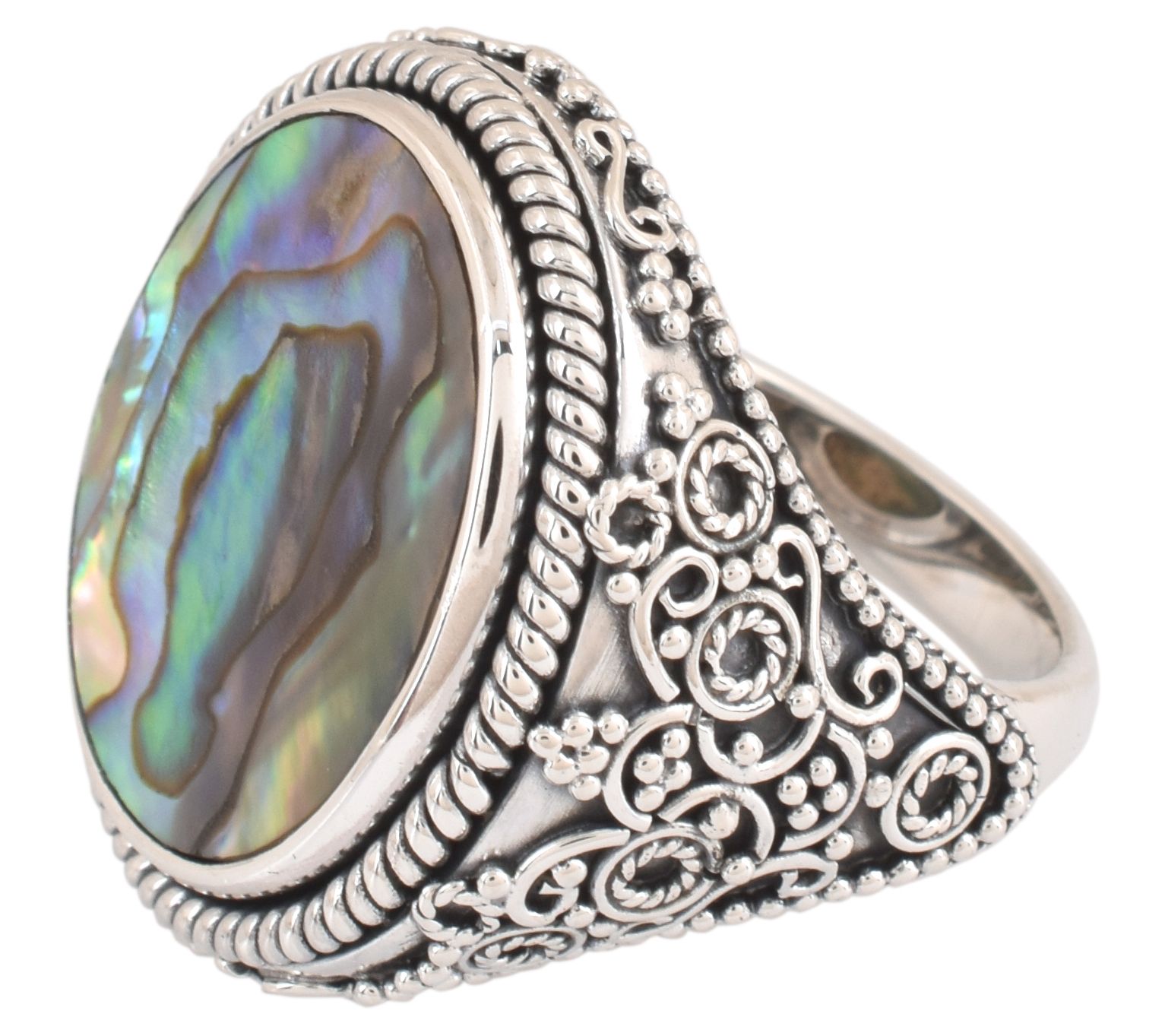 This sterling silver rainbow mother of pearl ring is a stunning piece that captures the essence of elegance with its multicolor oval cabochon stone. Perfect for adding a touch of sophistication to any outfit, the unique design showcases the beauty of rainbow mother of pearl, expertly bezel-set in oxidized sterling silver. From Artisan Crafted.