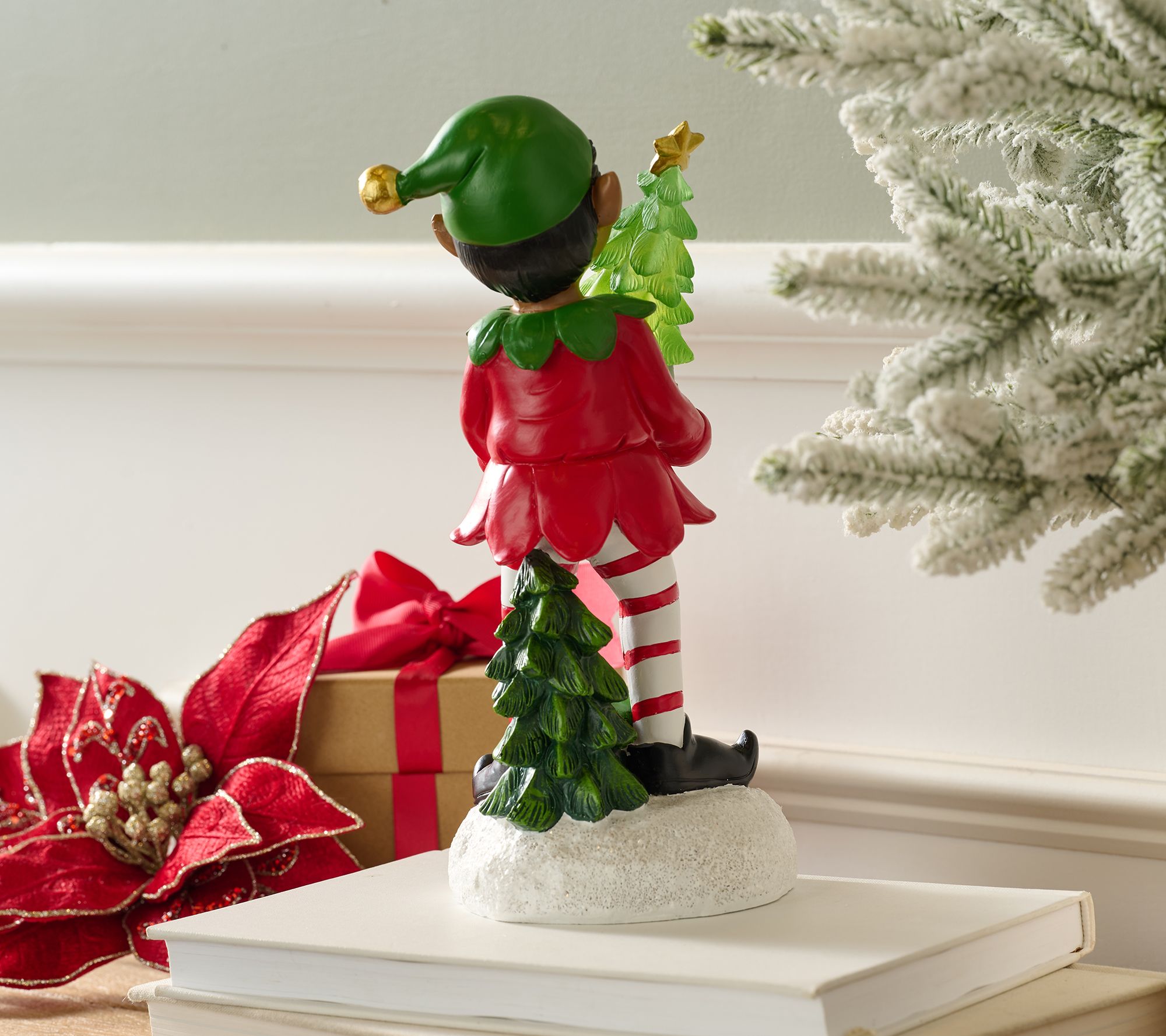 Welcoming holiday spirit feels easy with this merry elf holding a glowing tree and carrying a gift, ready to brighten your entryway or mantel. The classic red and green outfit paired with a sparkling glittered base offers timeless charm. Set the timer and enjoy daily glow, no extra effort needed. From the Valerie Parr Hill Collection.