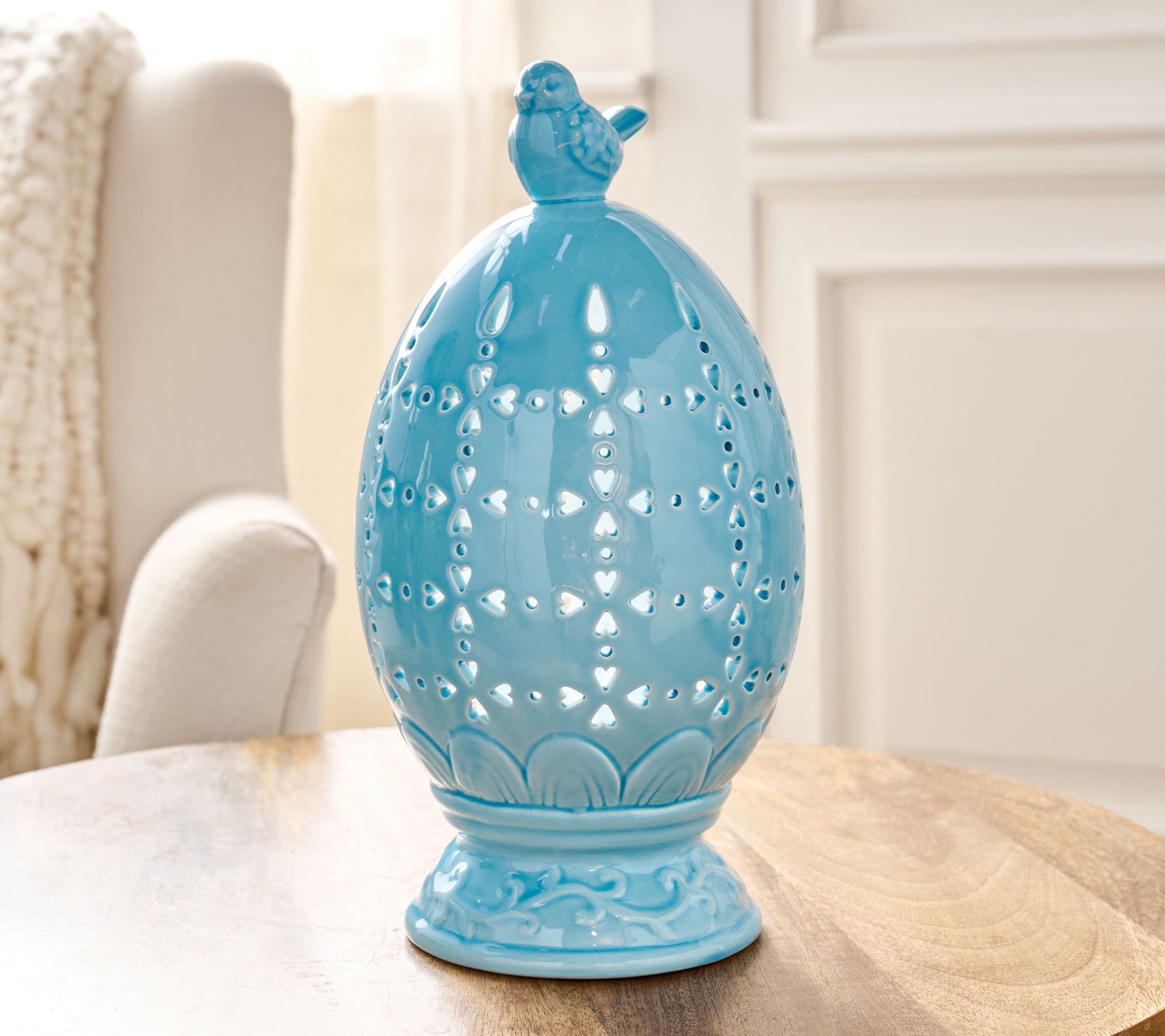 This illuminated ceramic egg's intricate pierced design lets light shine through beautifully, and the bird finial adds a whimsical finish. It creates a cozy ambiance in any room. From the Valerie Parr Hill Collection.