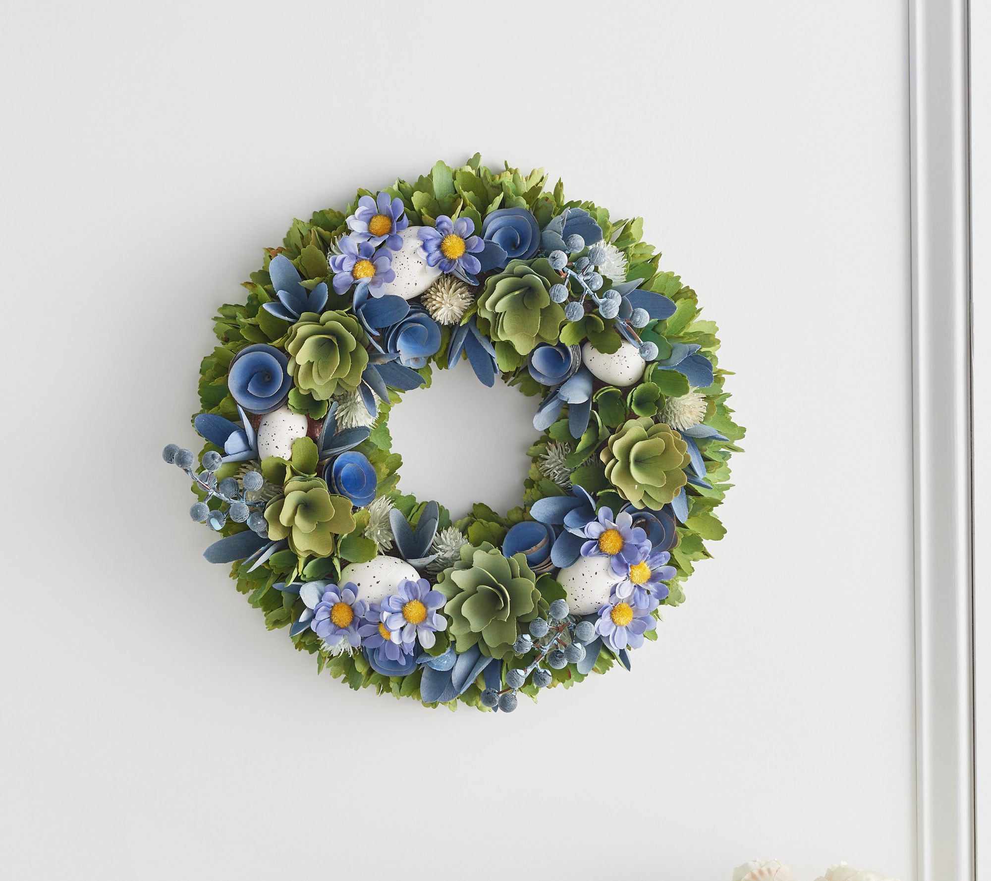 Give your home a touch of springtime spirit with this charming wreath. With wood curls, faux foliage and berries, and egg accents, it makes a welcoming sight on doors or over mantels. From The Valerie Parr Hill Collection.