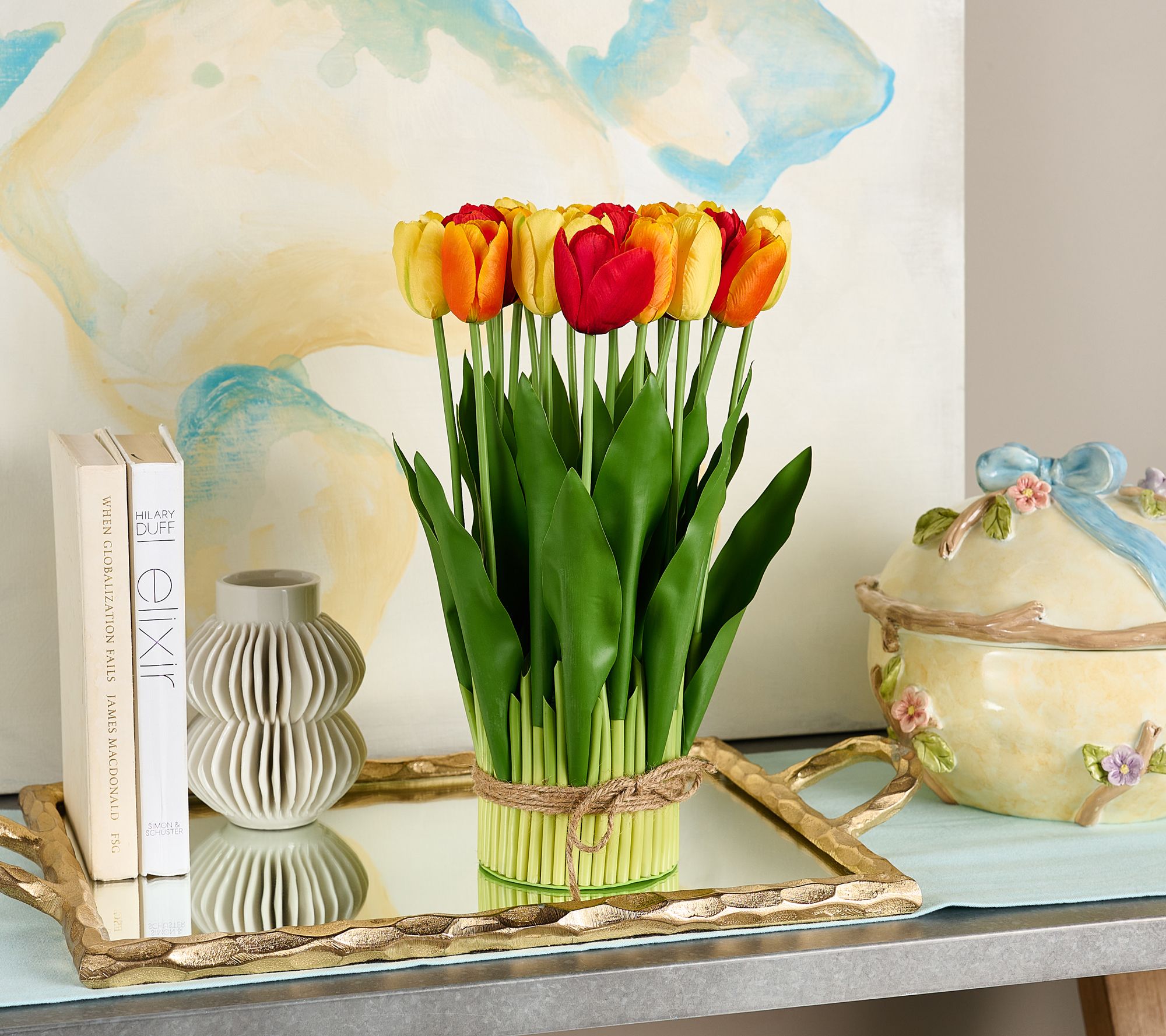 Skip the clippers and decorate your entry or side table with this blooming bunch of lifelike tulips instead. Lush greenery and bright colors bring in spring all season long (without a worry of changing the water). From the Valerie Parr Hill Collection.