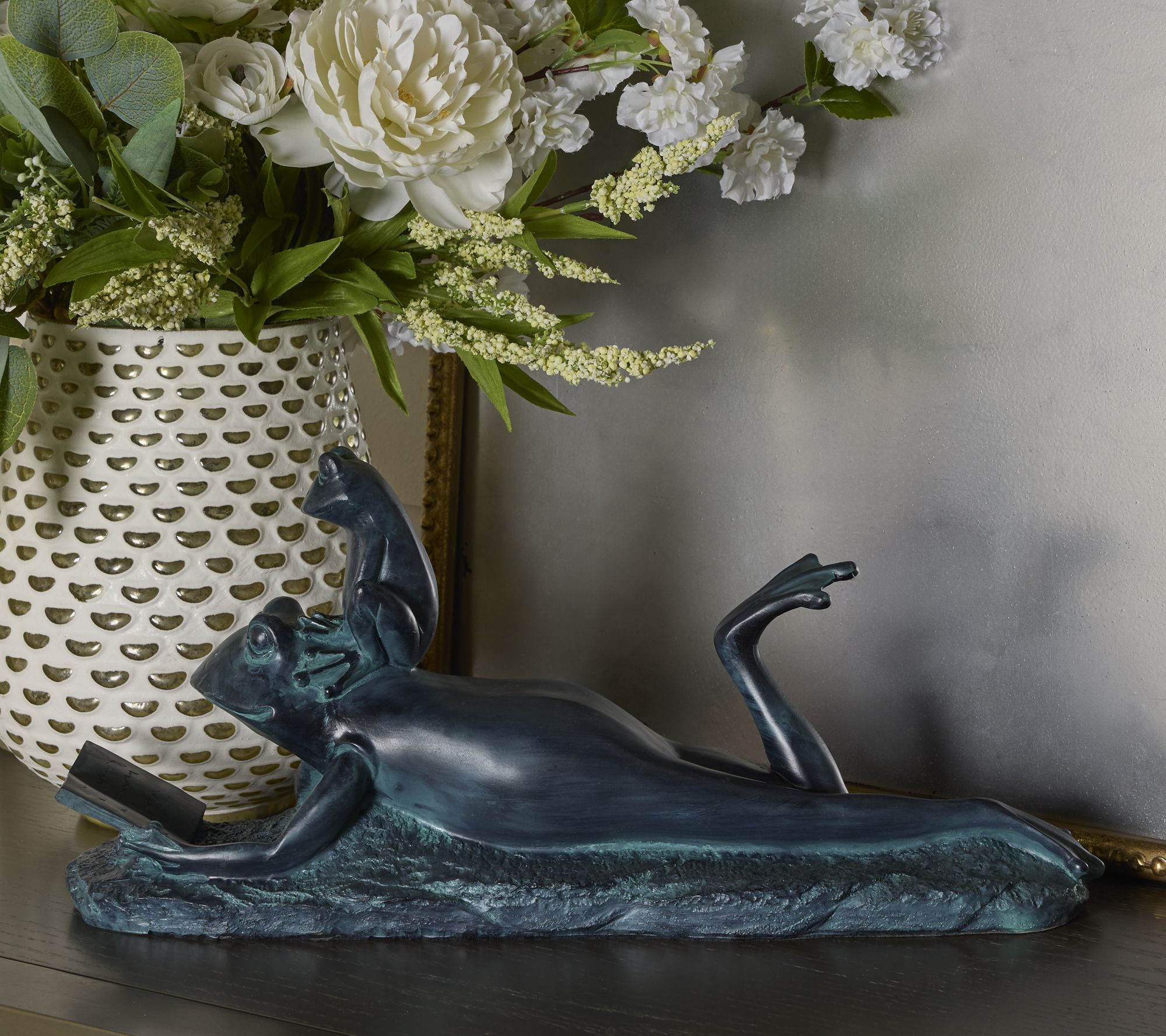 Add a heartwarming accent to your home or garden with this charming reading frog family sculpture, capturing a tender moment between parent and child as they share a story together. Designed with a patina bronze look, this resin figurine brings character to your porch, sunroom, or flowerbed -- delighting both guests and family members. From the Valerie Parr Hill Collection.