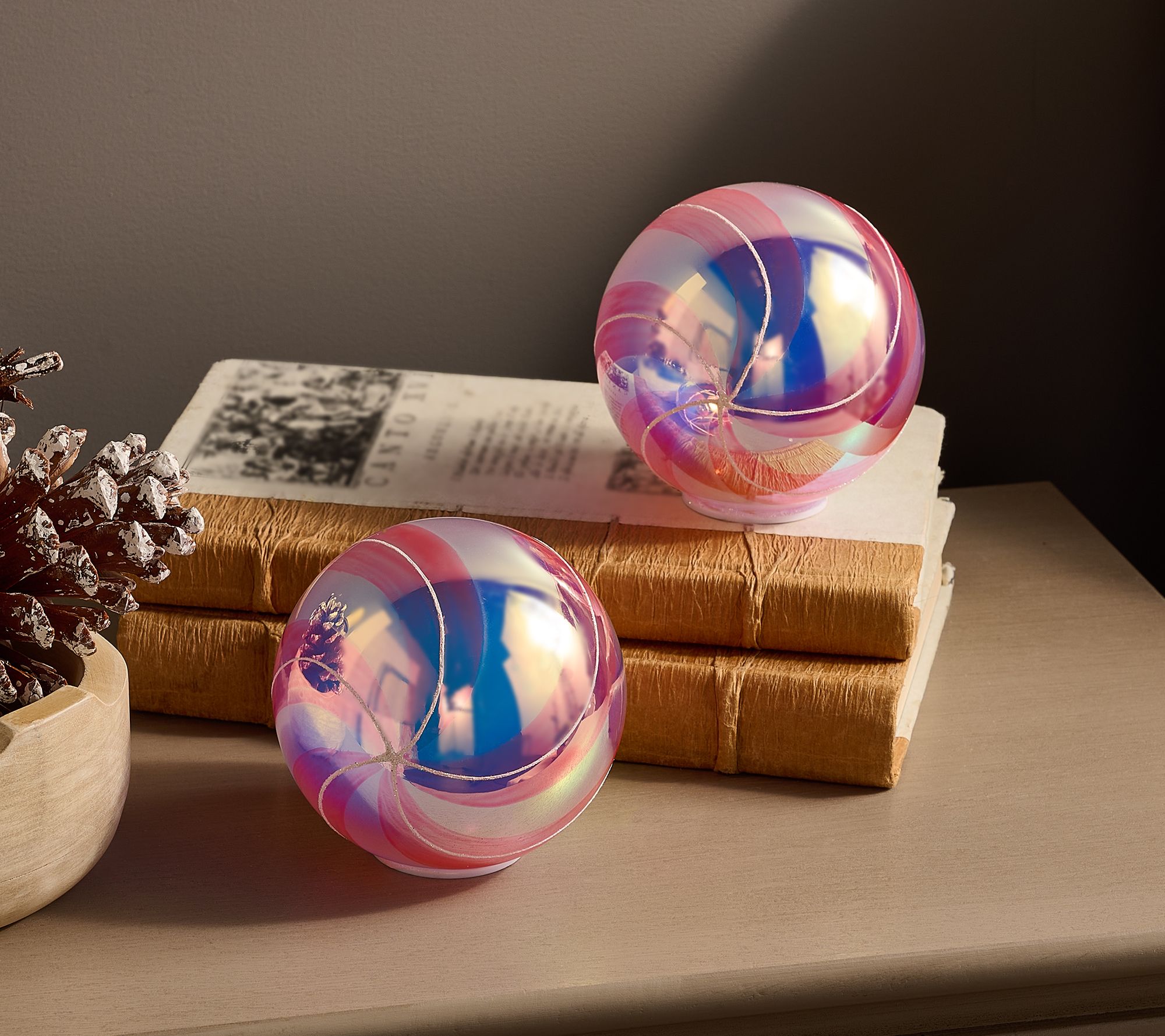 A sweet addition to your holiday home, these peppermint glass ornaments feature an iridescent finish for a lovely sheen. Use the convenient timer function to have them come on and go off at the same time each evening. From the Valerie Parr Hill Collection.