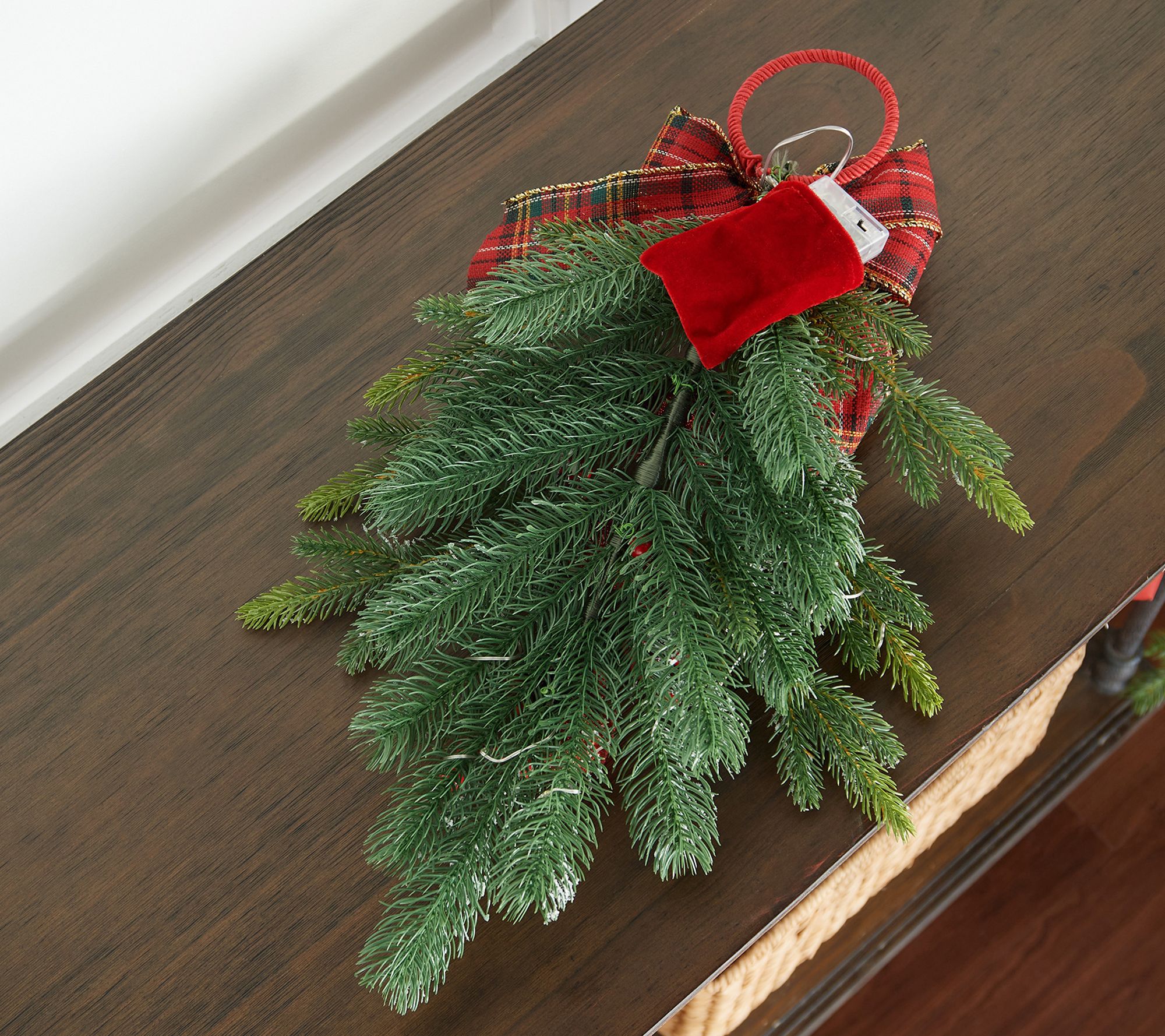 Jingle all the way! This illuminated door hanger features a pine swag adorned with red berries, glittered bells, and topped with a festive plaid bow. From the Valerie Parr Hill Collection.