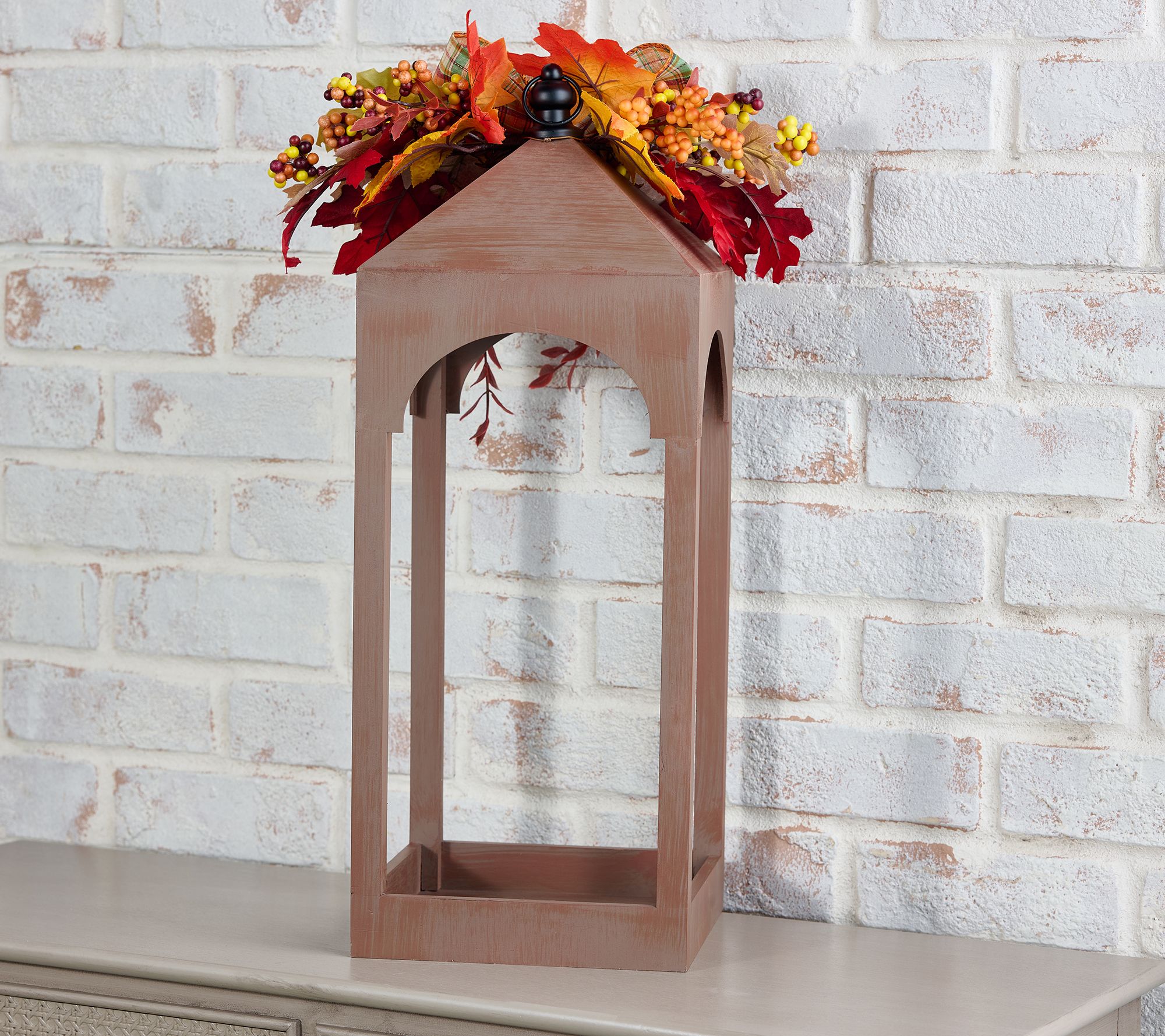 Transform your favorite flameless candle for fall with this 23"H wood lantern. The open design and matte brown finish -- that complements so many aesthetics -- let you show off seasonal accents inside, while cheery leaves, berries, and a plaid bow dress it up for autumn gatherings or everyday enjoyment. From the Valerie Parr Hill Collection.
