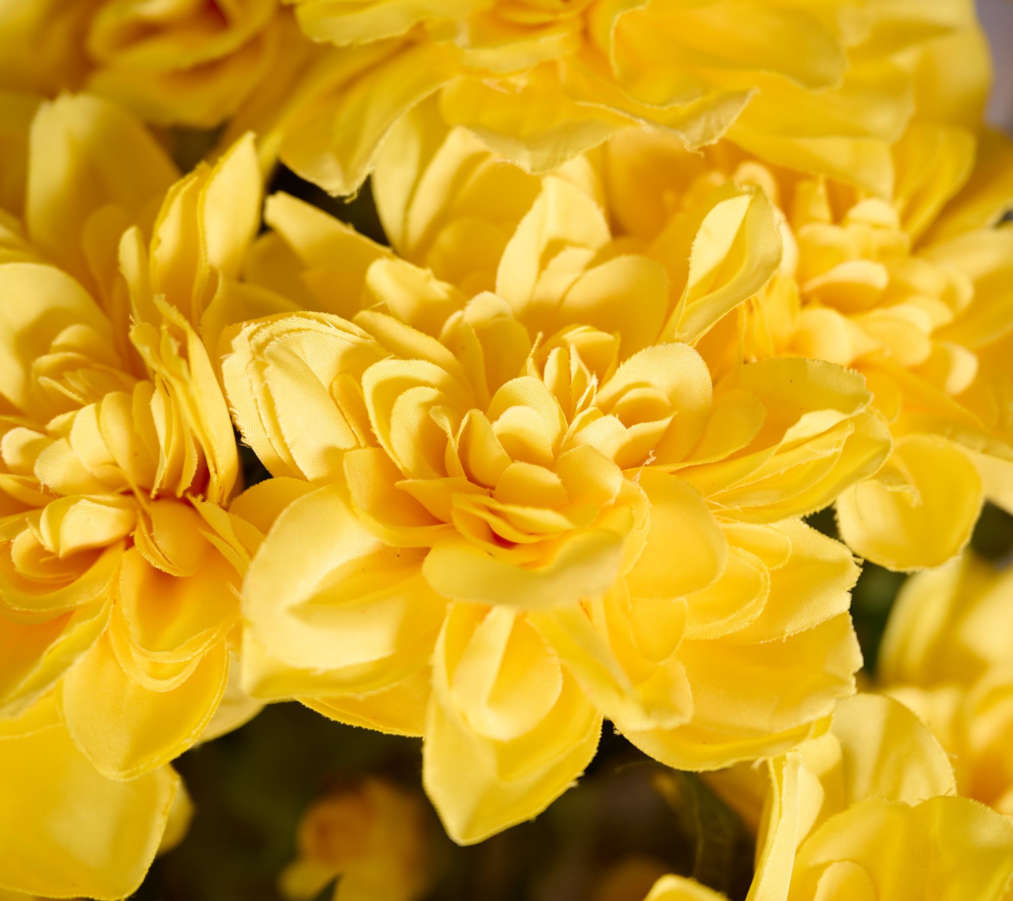 • 23 lifelike mum blooms intermixed with faux green leaves, new buds, and moss