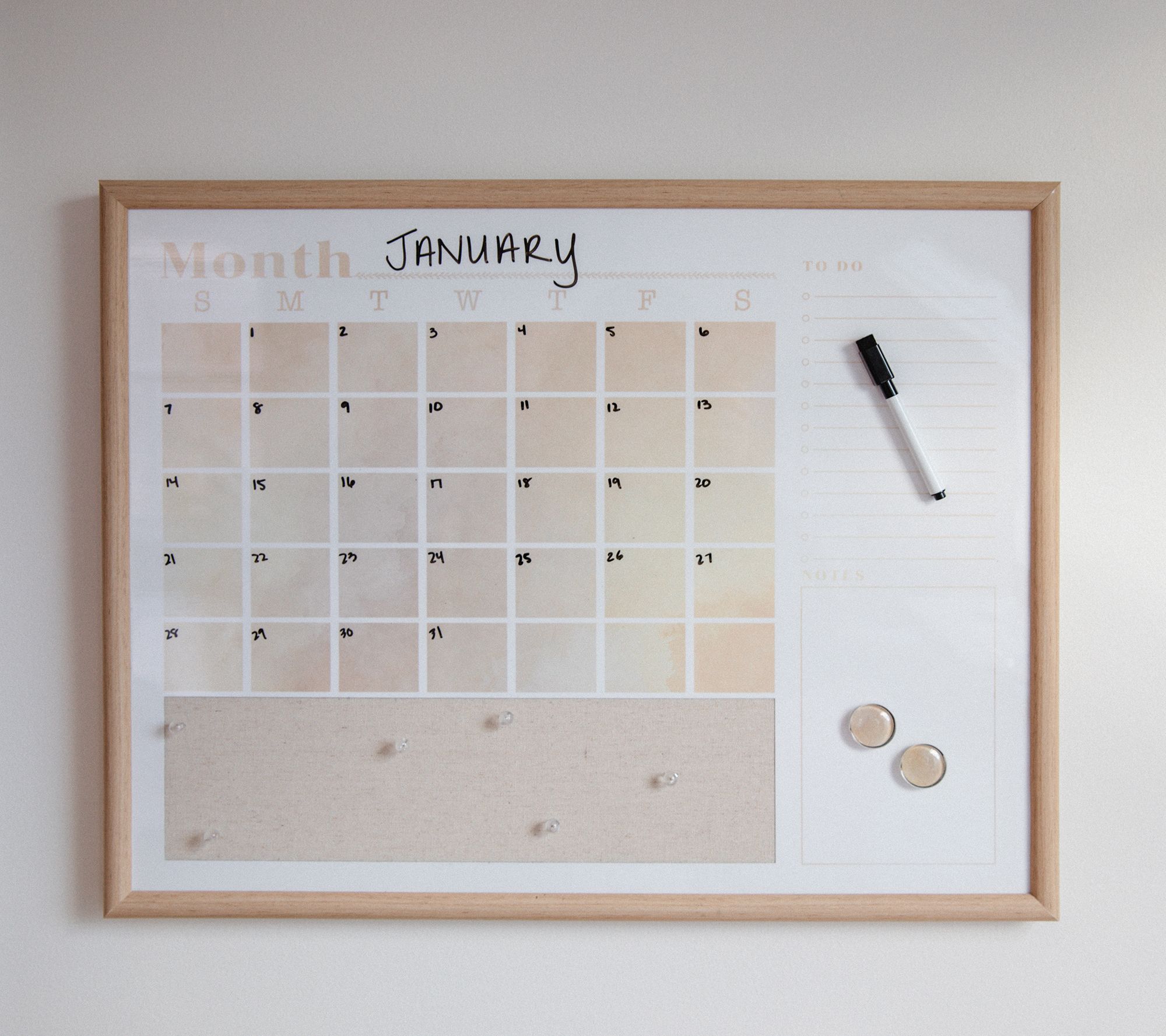 • Includes calendar, six push pins, two magnets, whiteboard marker, and hanging hardware