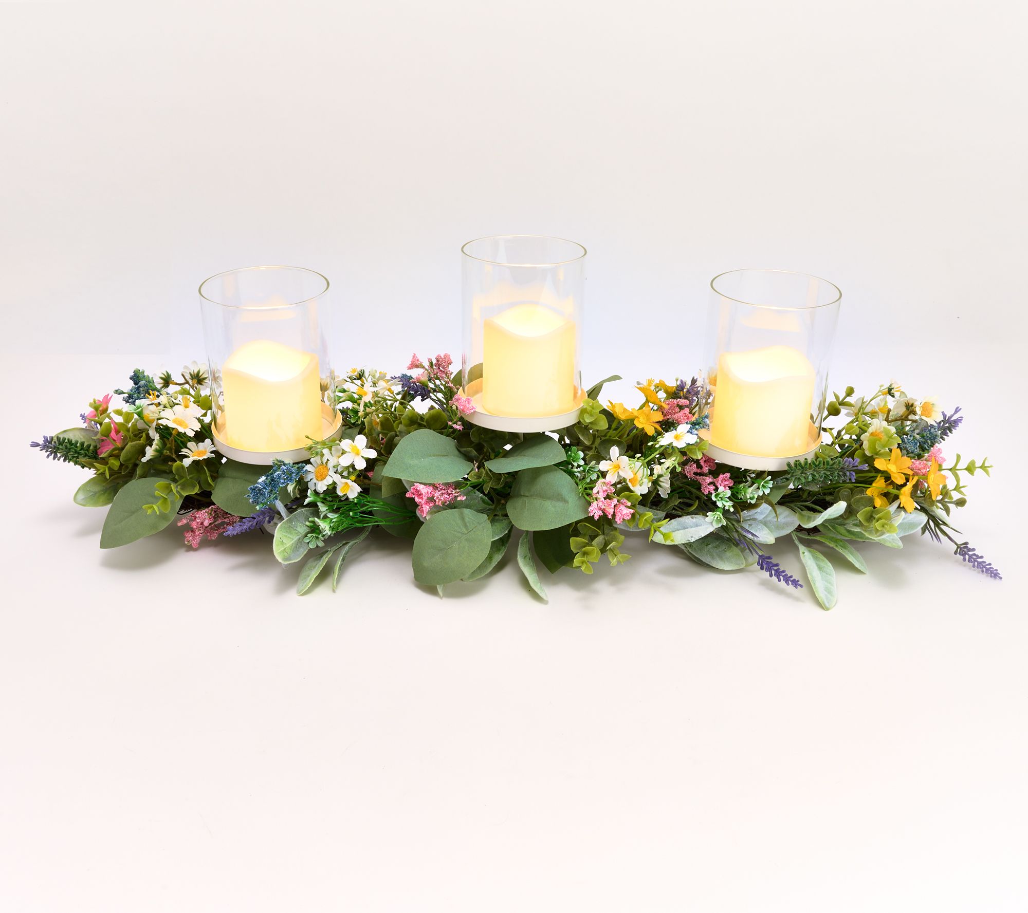 Illuminate the room with this stunning centerpiece featuring three flameless candles surrounded by lifelike wildflowers. From the Valerie Parr Hill Collection.