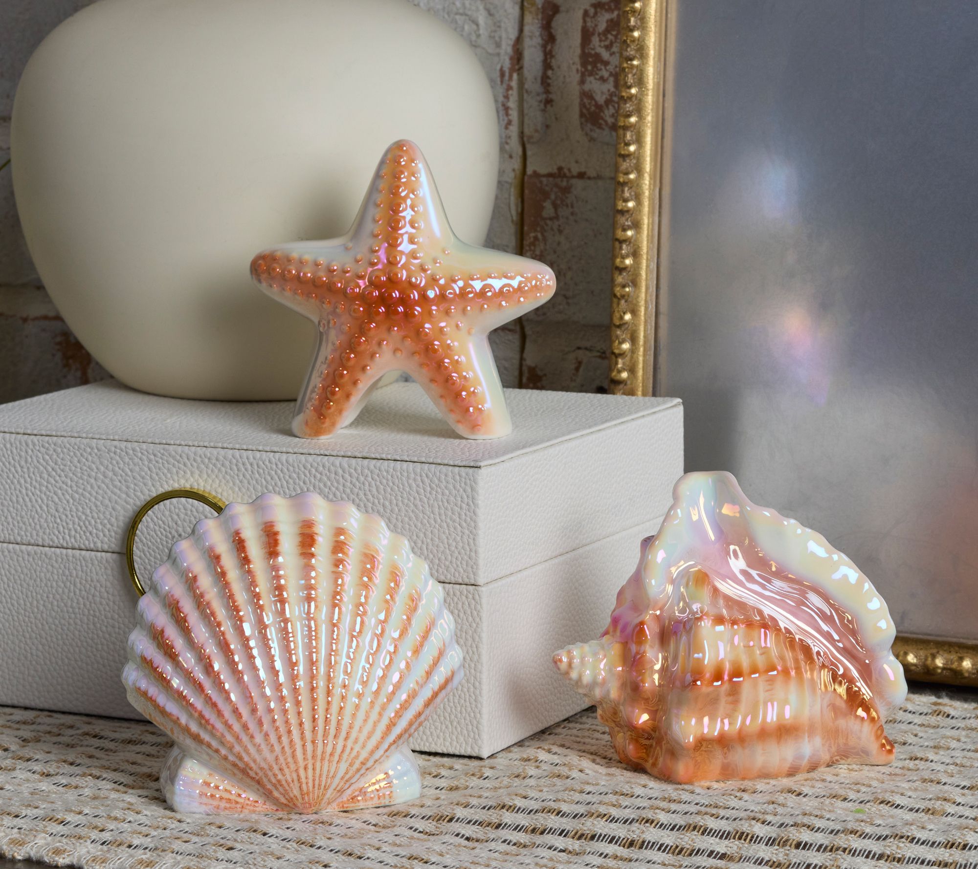 Bring a gentle glow and coastal charm to your space with this set of illuminated porcelain seashells. Featuring a starfish, conch, and scallop shell with an iridescent finish, these decorative accents softly light up your shelf, mantel, or centerpiece, creating a serene ambiance you'll love. From the Valerie Parr Hill Collection.