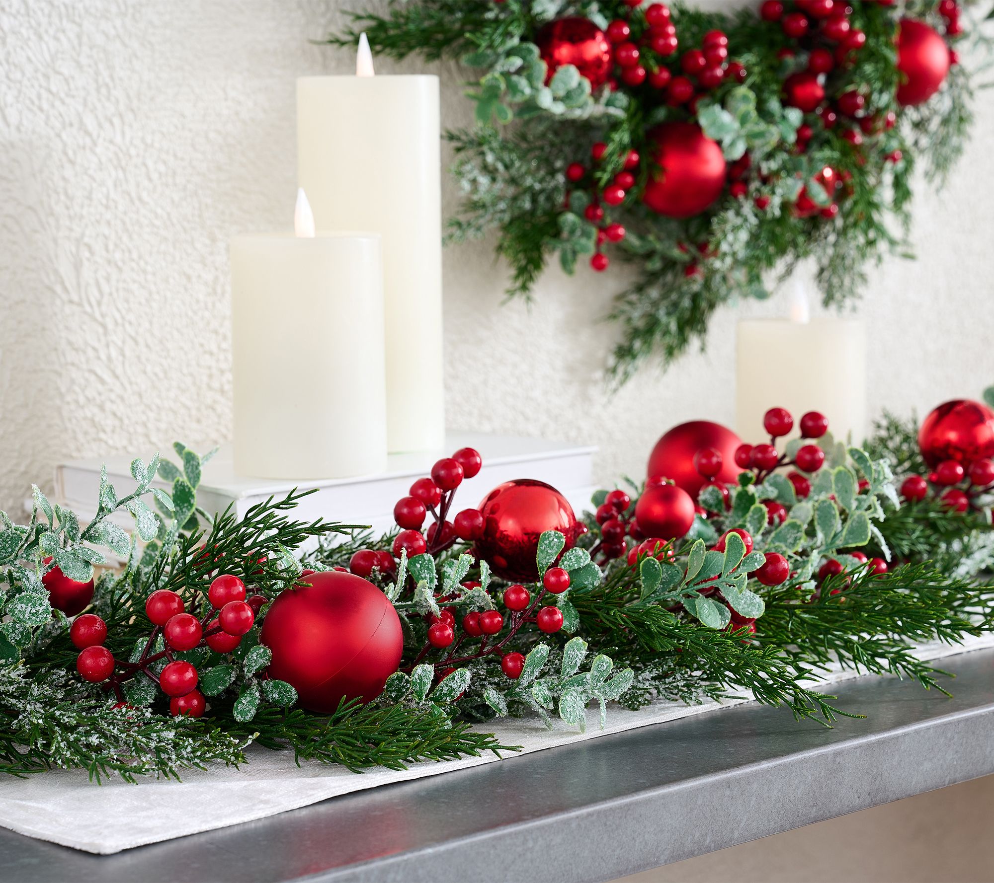 • Lifelike cedar branches intermixed with eucalyptus leaves, red berries, and red ornaments
