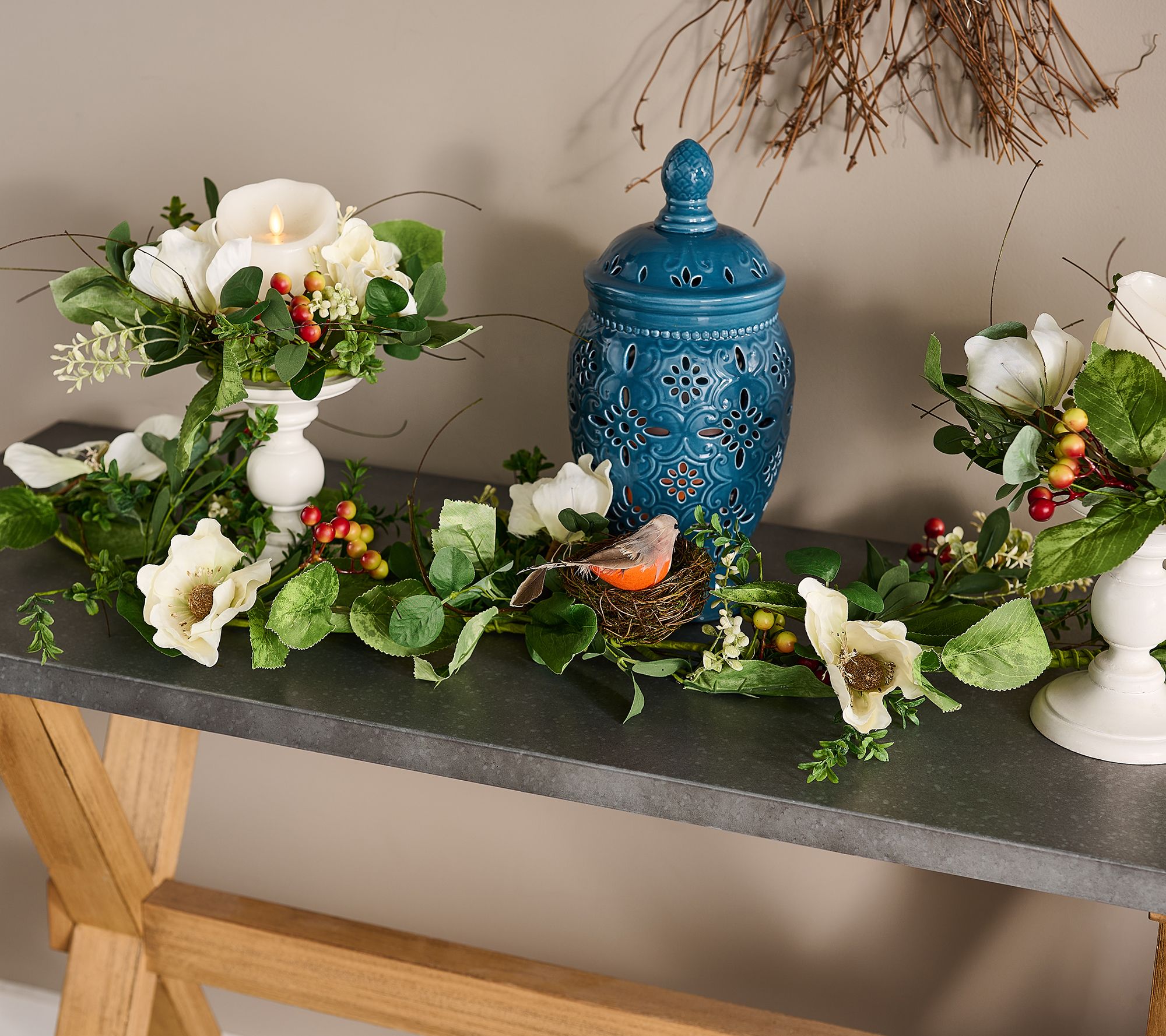 Weary of winter? Shed the duller days with the promise of spring this garland brings. The delightful design overflows with white magnolias, leaves, and berries. Perched amid the foliage, a robin's nest (complete with bird and eggs!) adds a welcoming and whimsical touch. From the Valerie Parr Hill Collection.