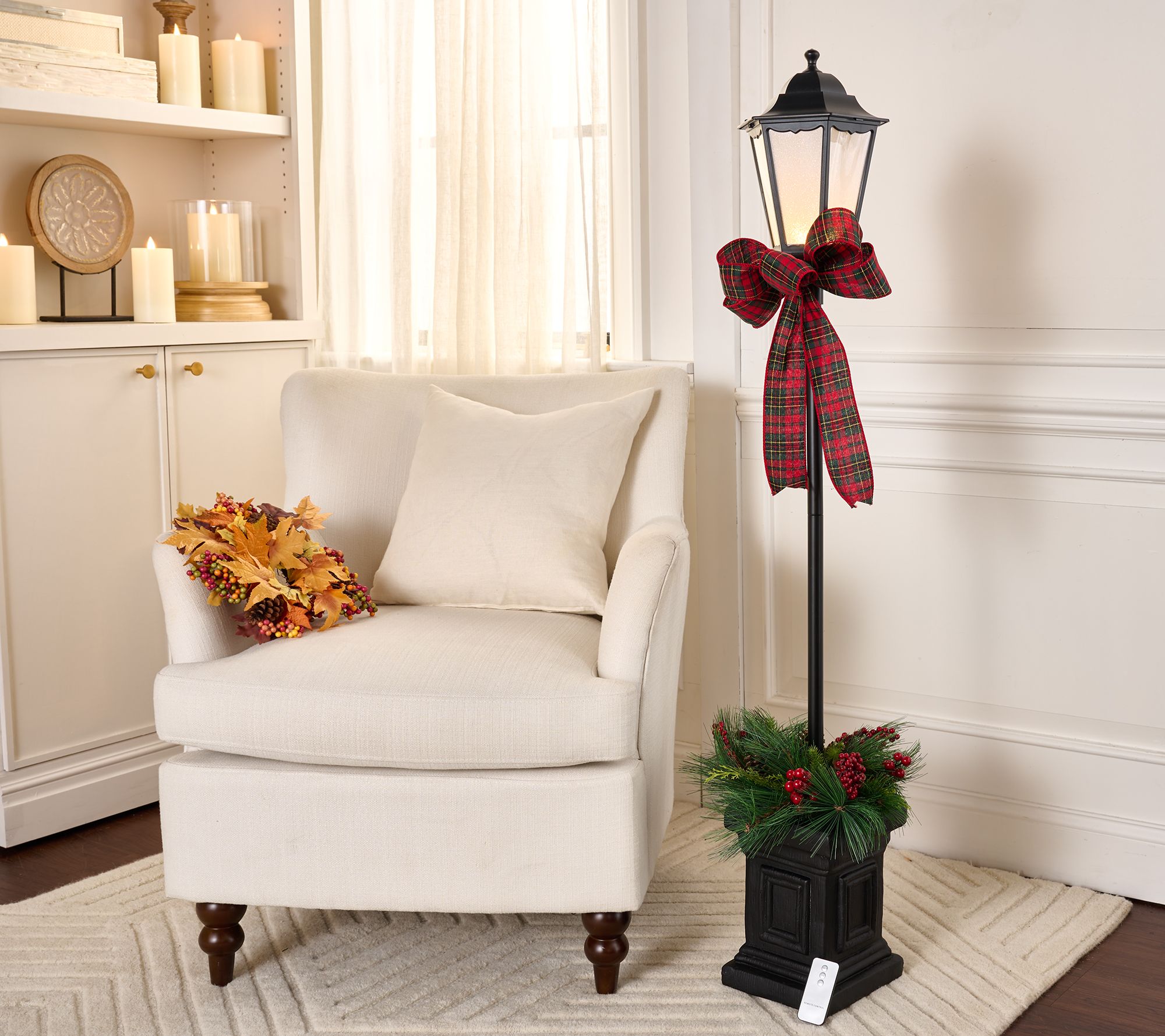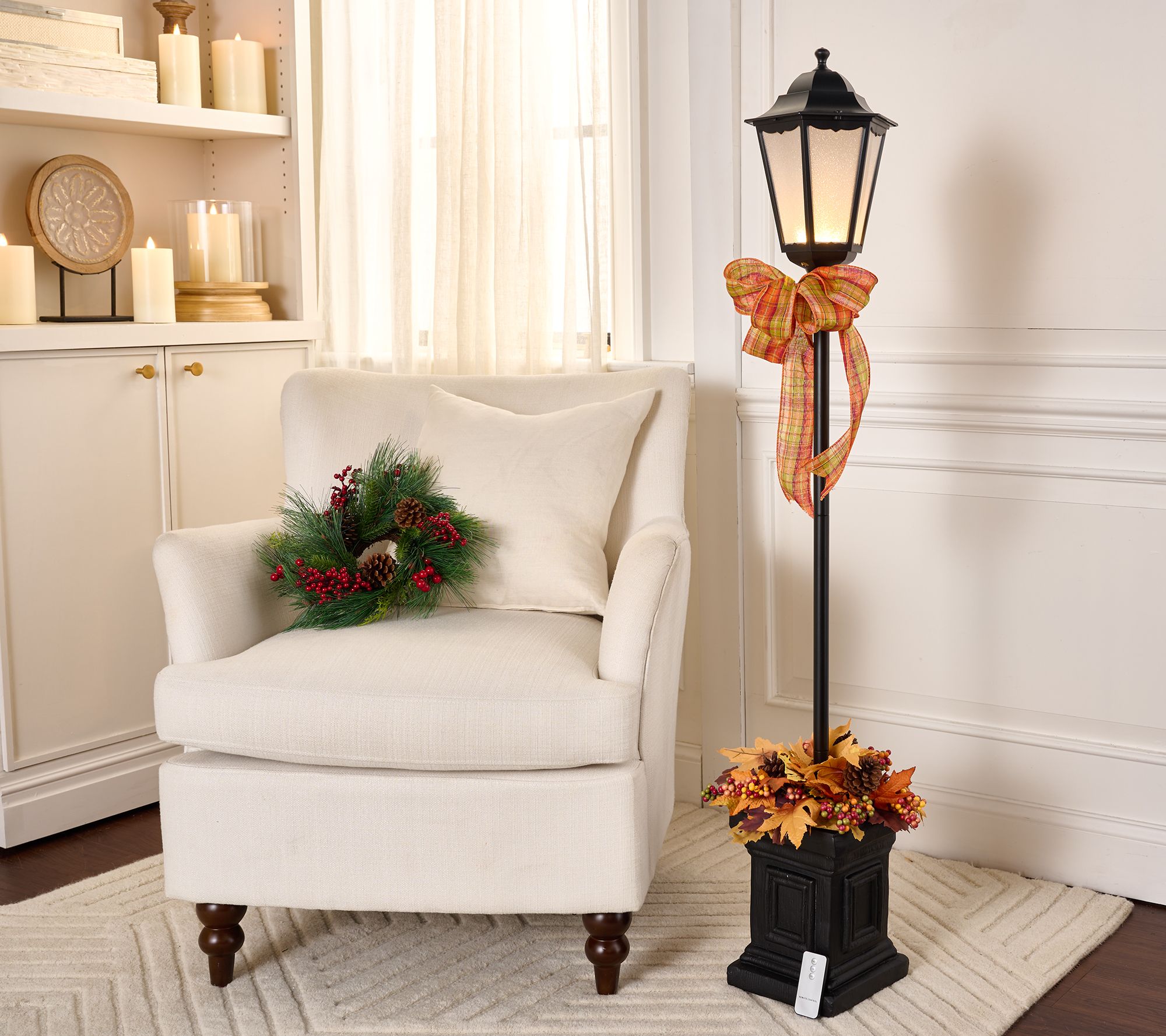 Accent your entryway or complete a festive display with this 4.5' illuminated lamp post. The charming indoor/outdoor design comes with its own square urn and includes two seasonal mini wreaths, holiday and harvest. From the Valerie Parr Hill Collection.