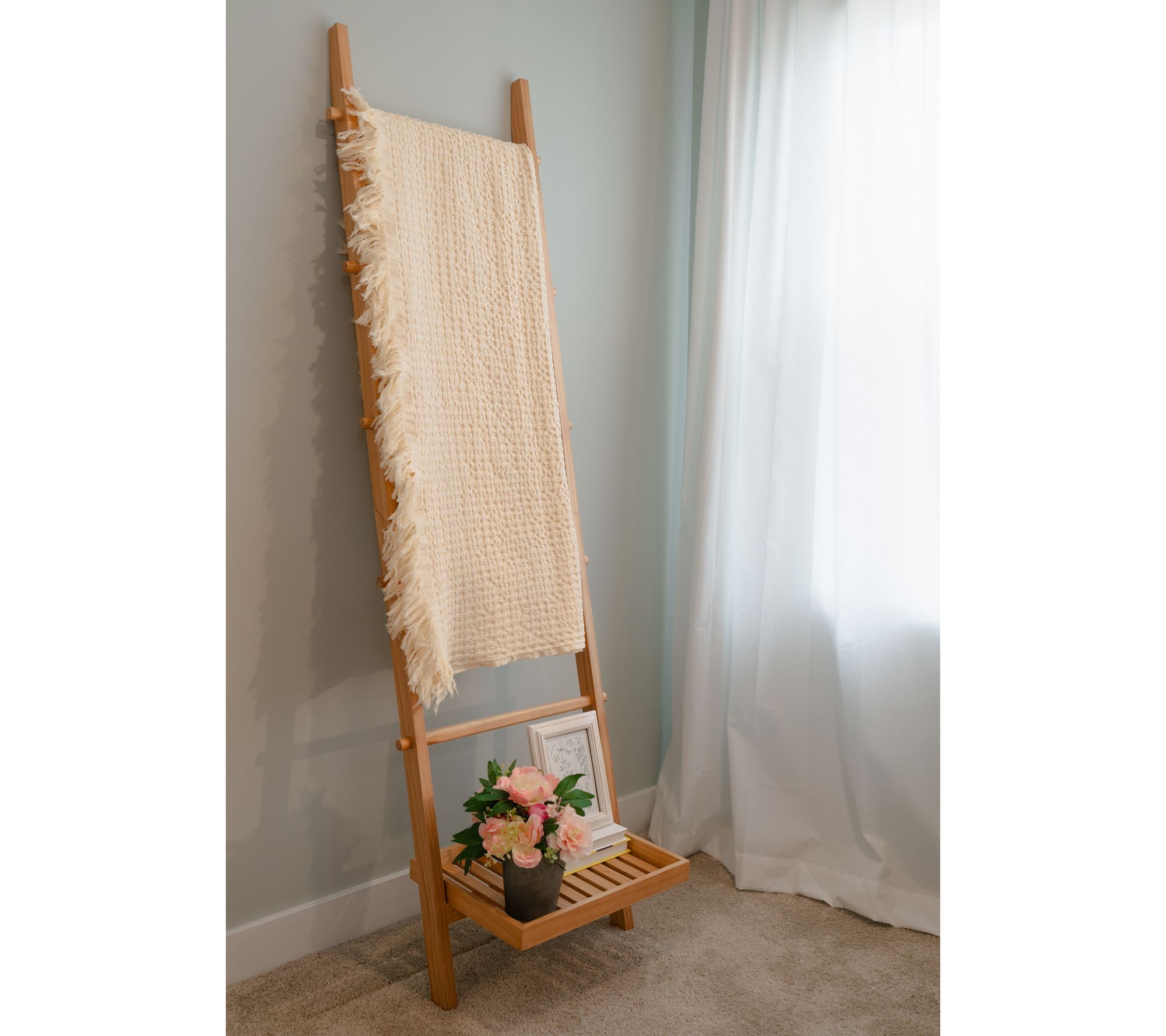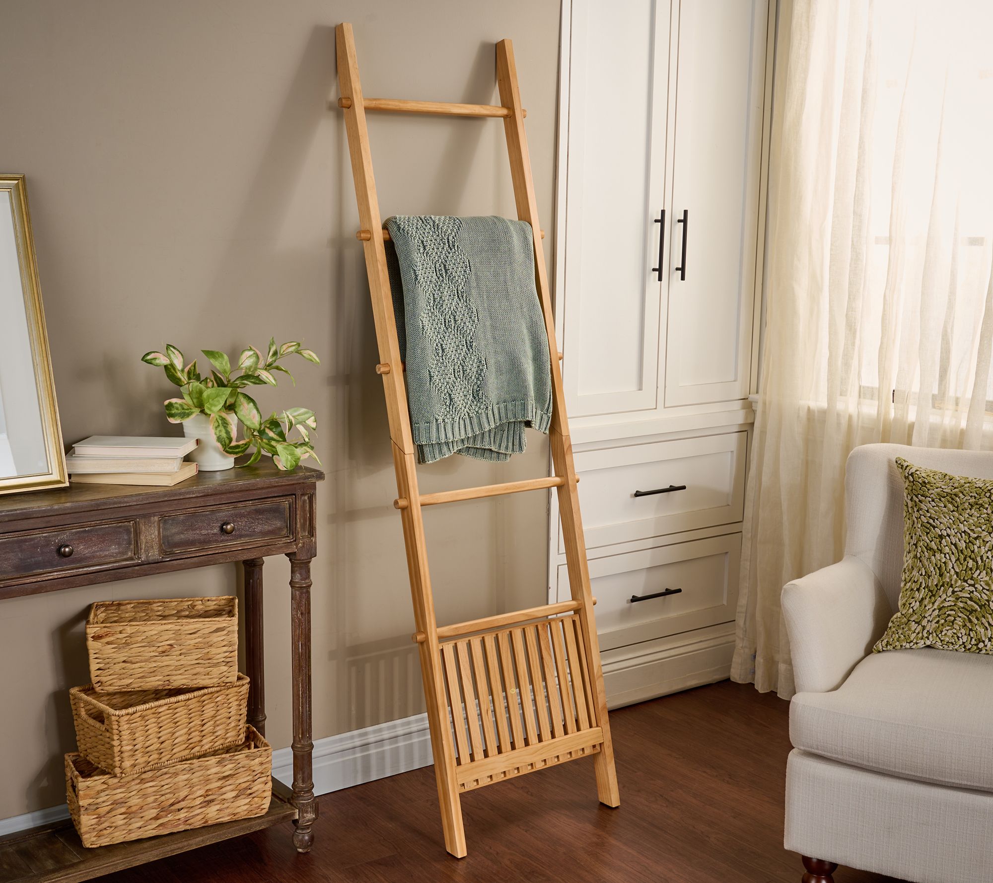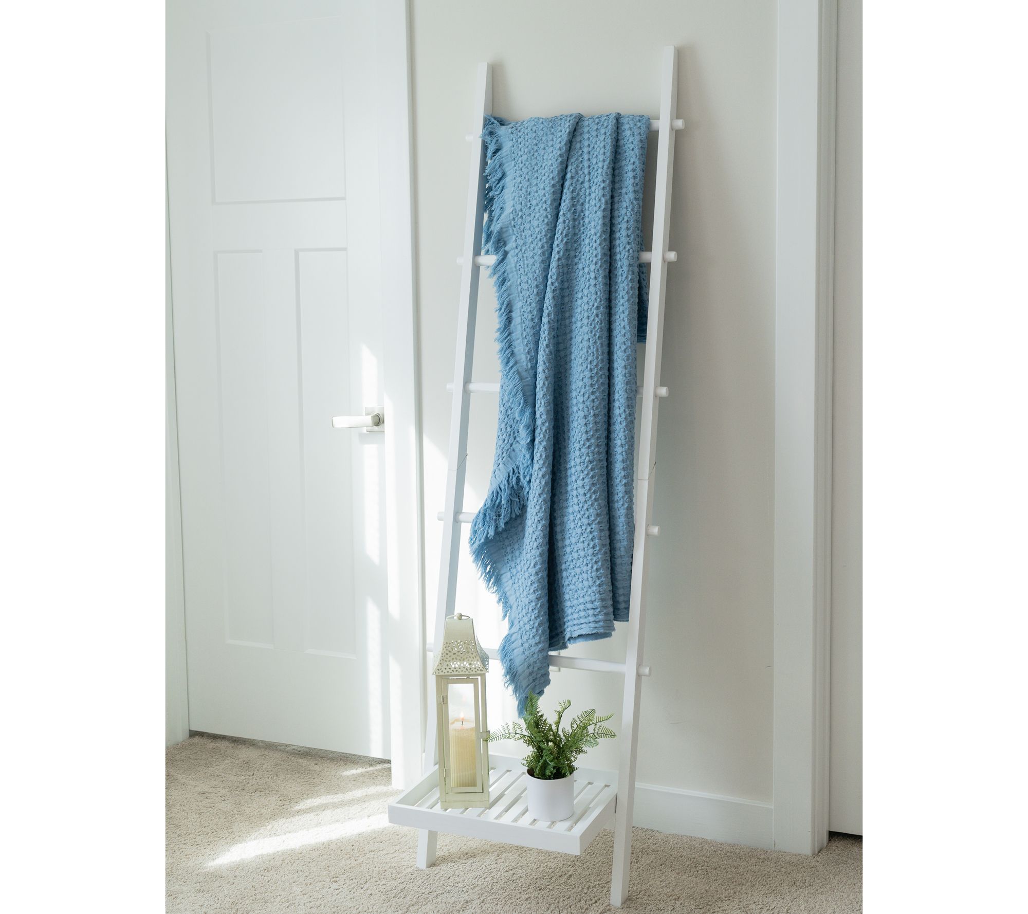 Ladder up! Give your favorite throws the perfect place to perch with Kim Gravel's blanket ladder. With five rungs and a bottom tray, it's the perfect solution for neatly draping and displaying your cozy cover-ups while adding farmhouse-chic charm to any room. From Kim Gravel.
