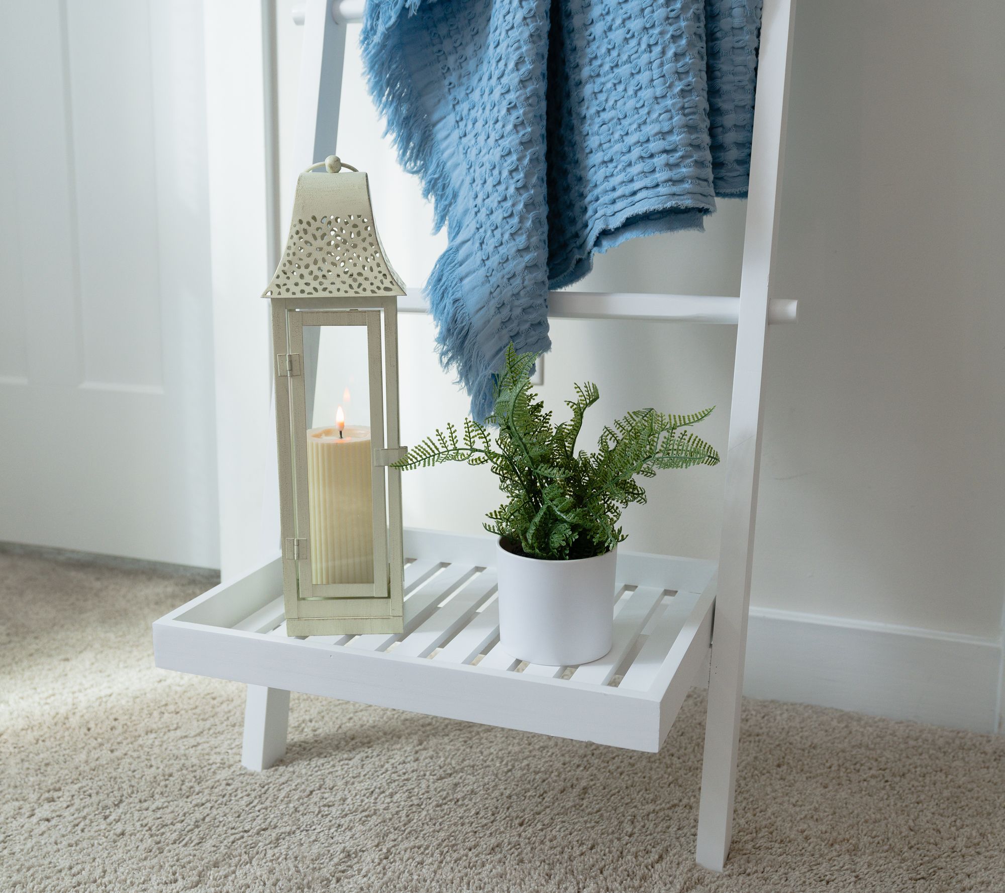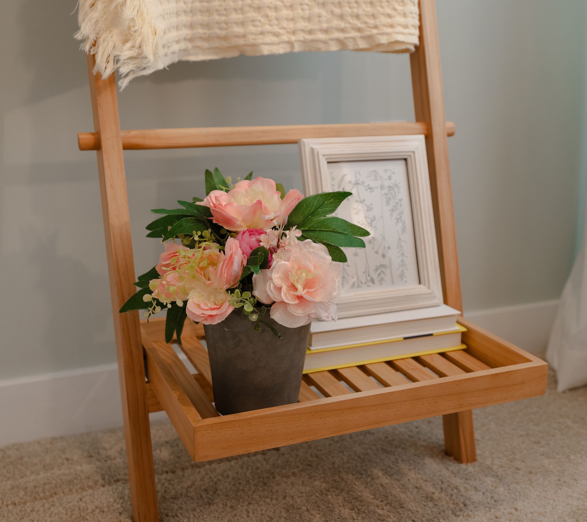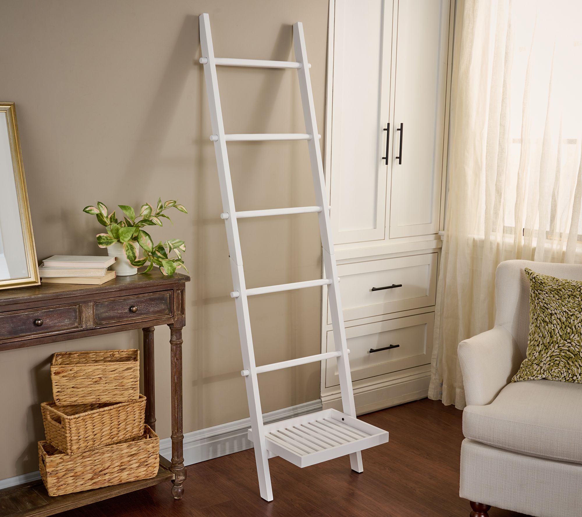 Ladder up! Give your favorite throws the perfect place to perch with Kim Gravel's blanket ladder. With five rungs and a bottom tray, it's the perfect solution for neatly draping and displaying your cozy cover-ups while adding farmhouse-chic charm to any room. From Kim Gravel.