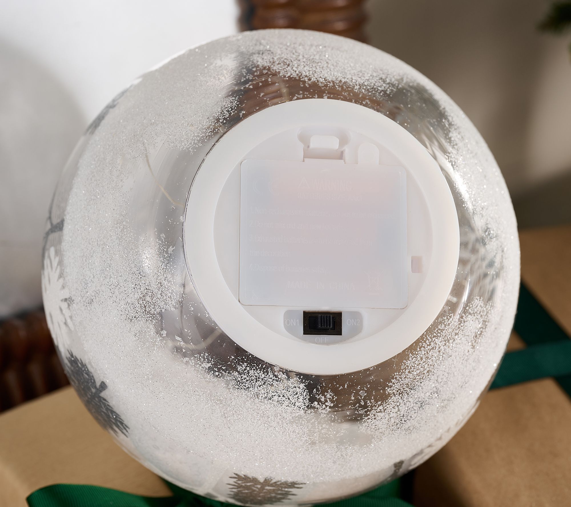 Invite winter's magic indoors with this illuminated glass sphere, featuring silvery, snow-dusted trees and filled with faux snow and warm white lights. Whether glowing steadily or gently twinkling, the decorative accent brings a cozy, festive charm to a mantel, table, or shelf all season long. From the Valerie Parr Hill Collection.