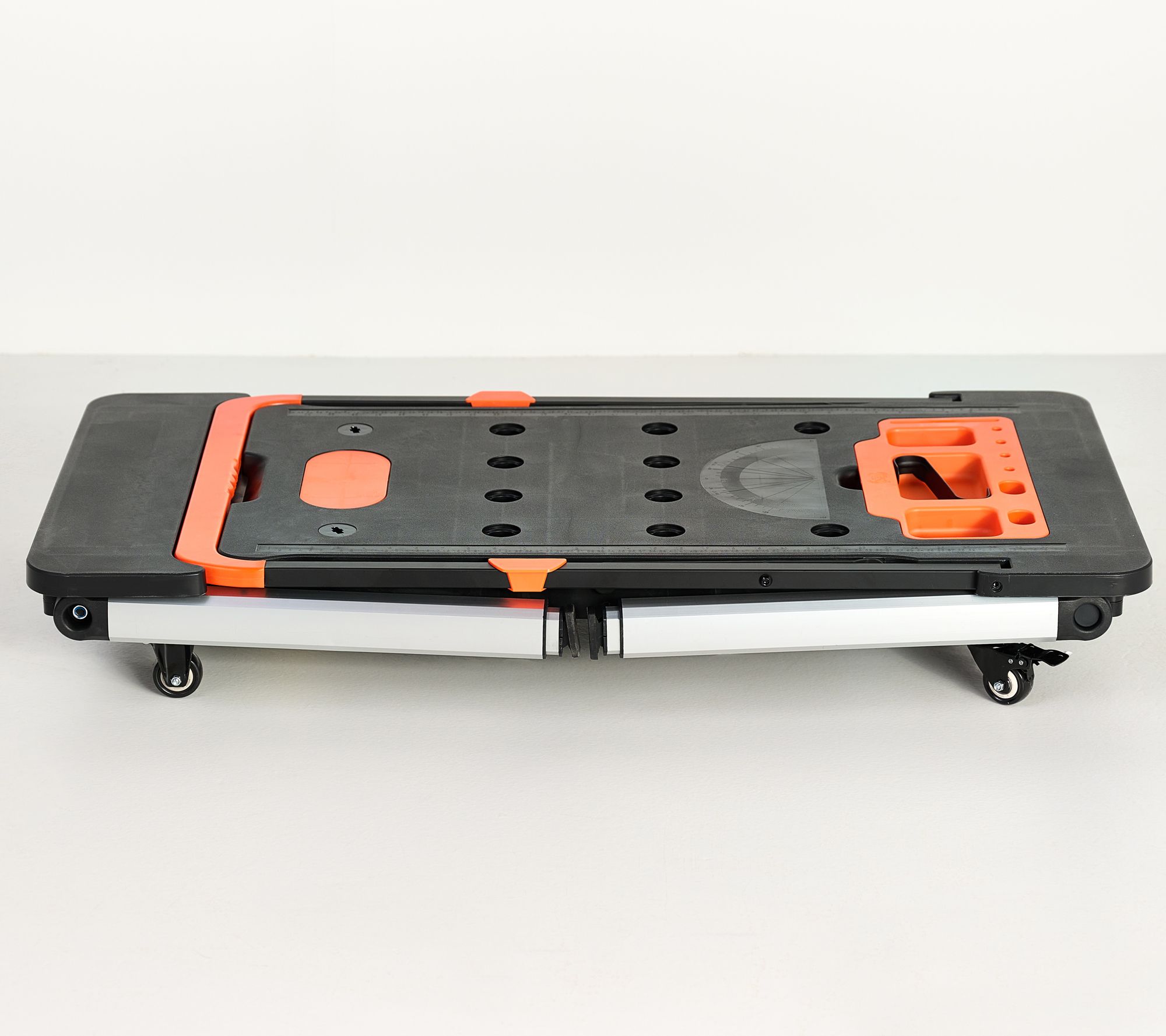 • Towing hole, tool tray, compass, sawhorse holes, 2-in-1 handle, ruler, fixed wheels, and universal wheels with brakes