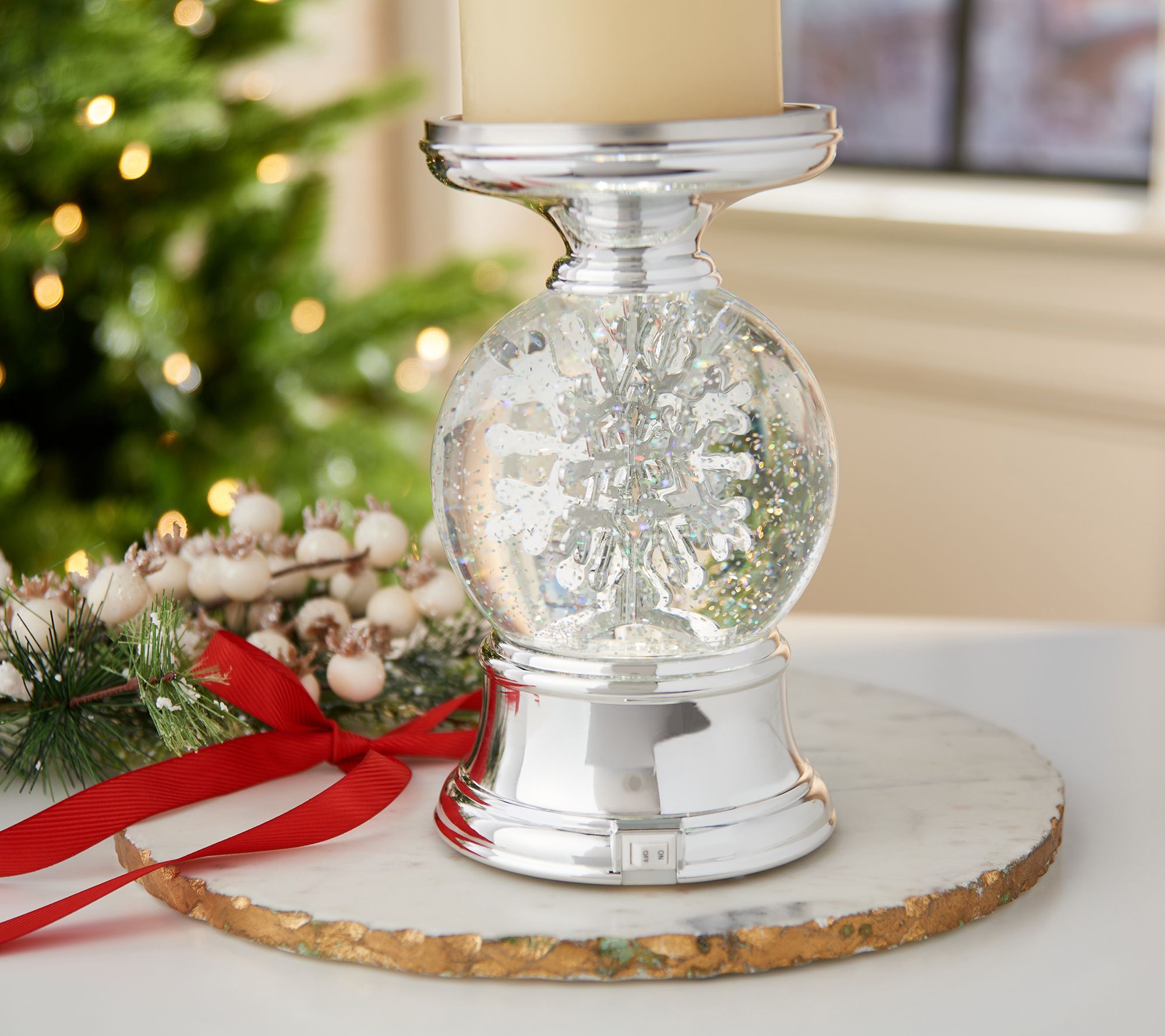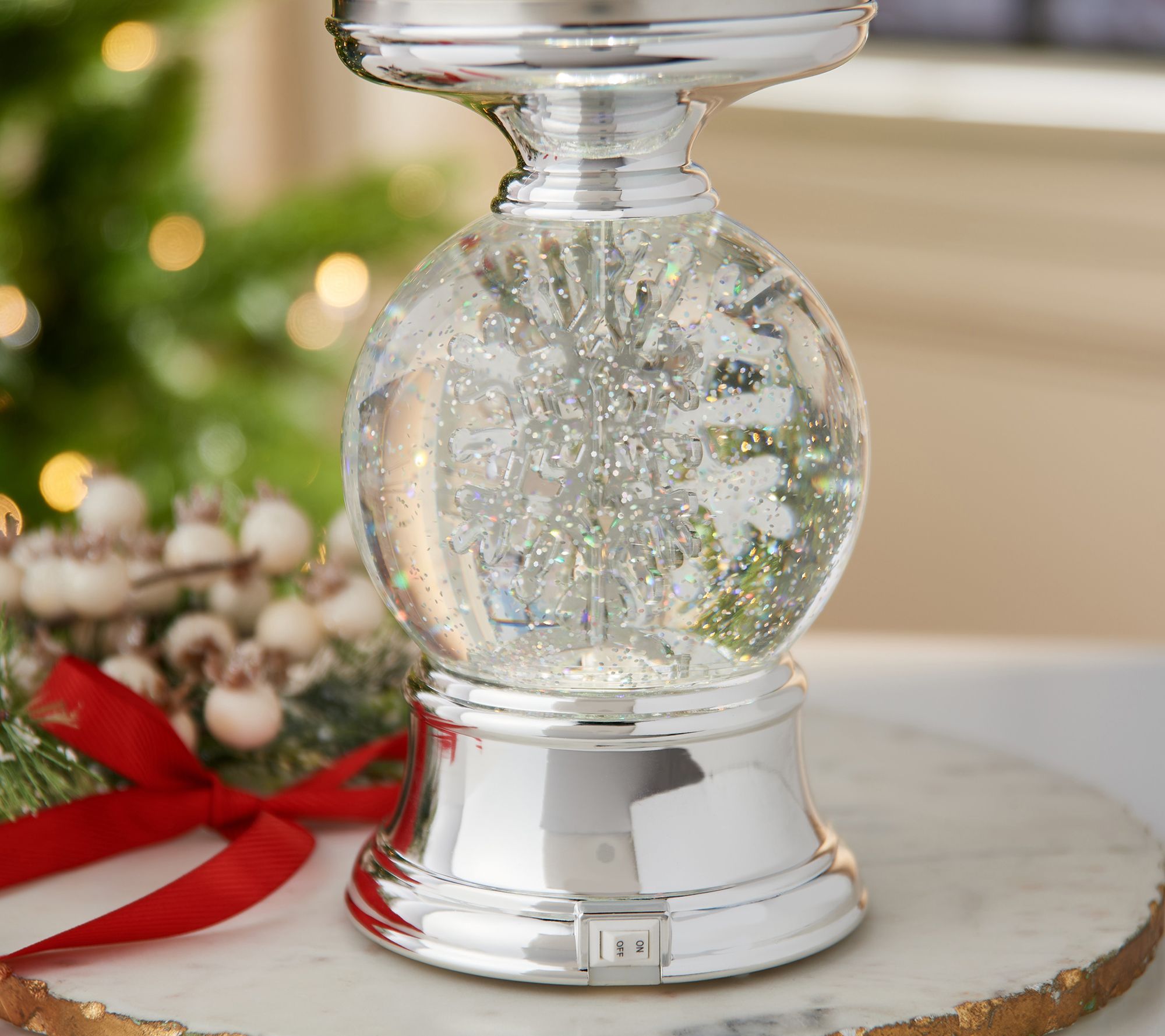 Sleek and elegant, this illuminated pedestal with swirling glitter and a revolving snowflake adds the beauty of winter to any holiday home. From the Valerie Parr Hill Collection.