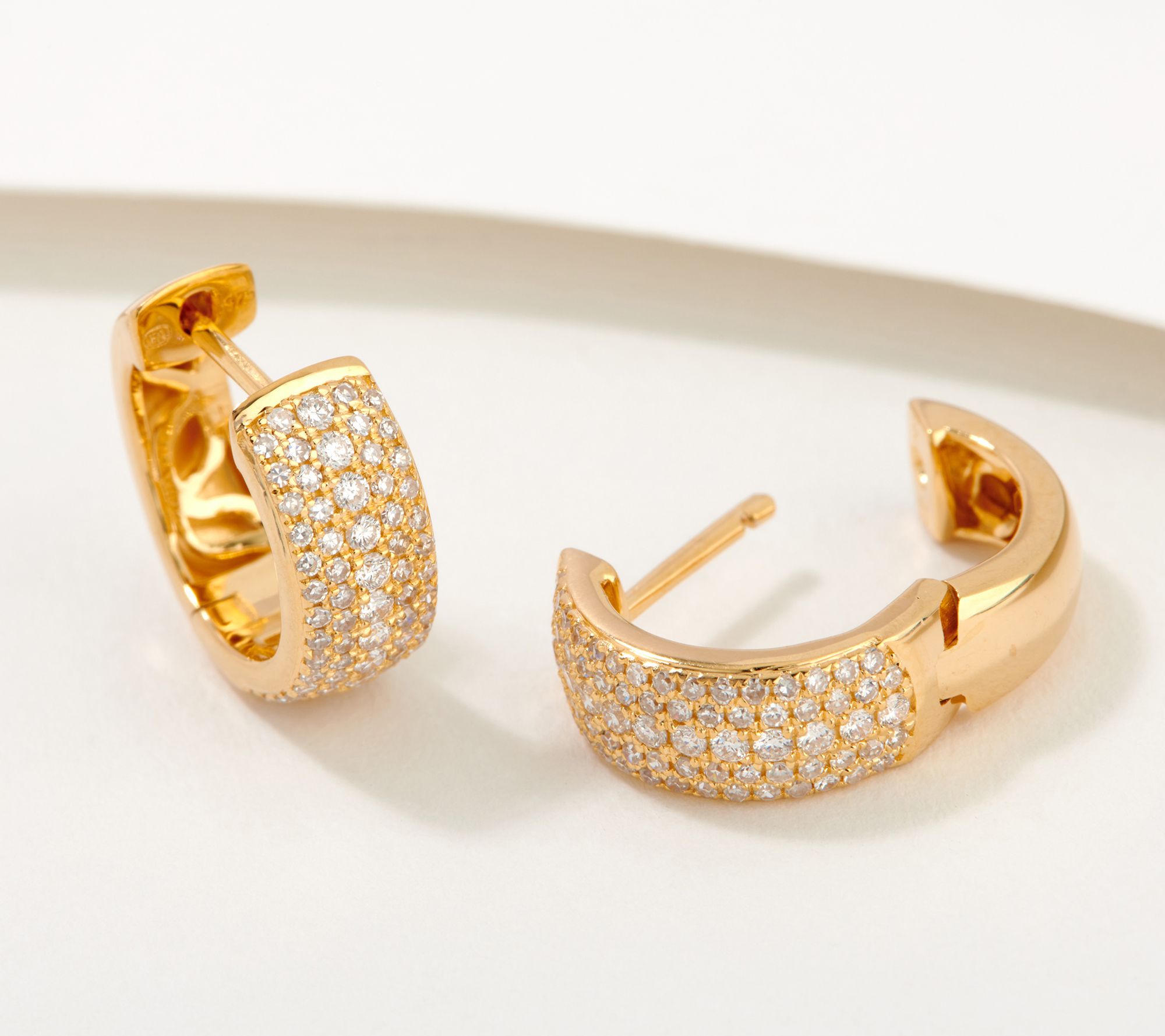 • Huggie hoop design with full- and single-cut diamonds; polished finish