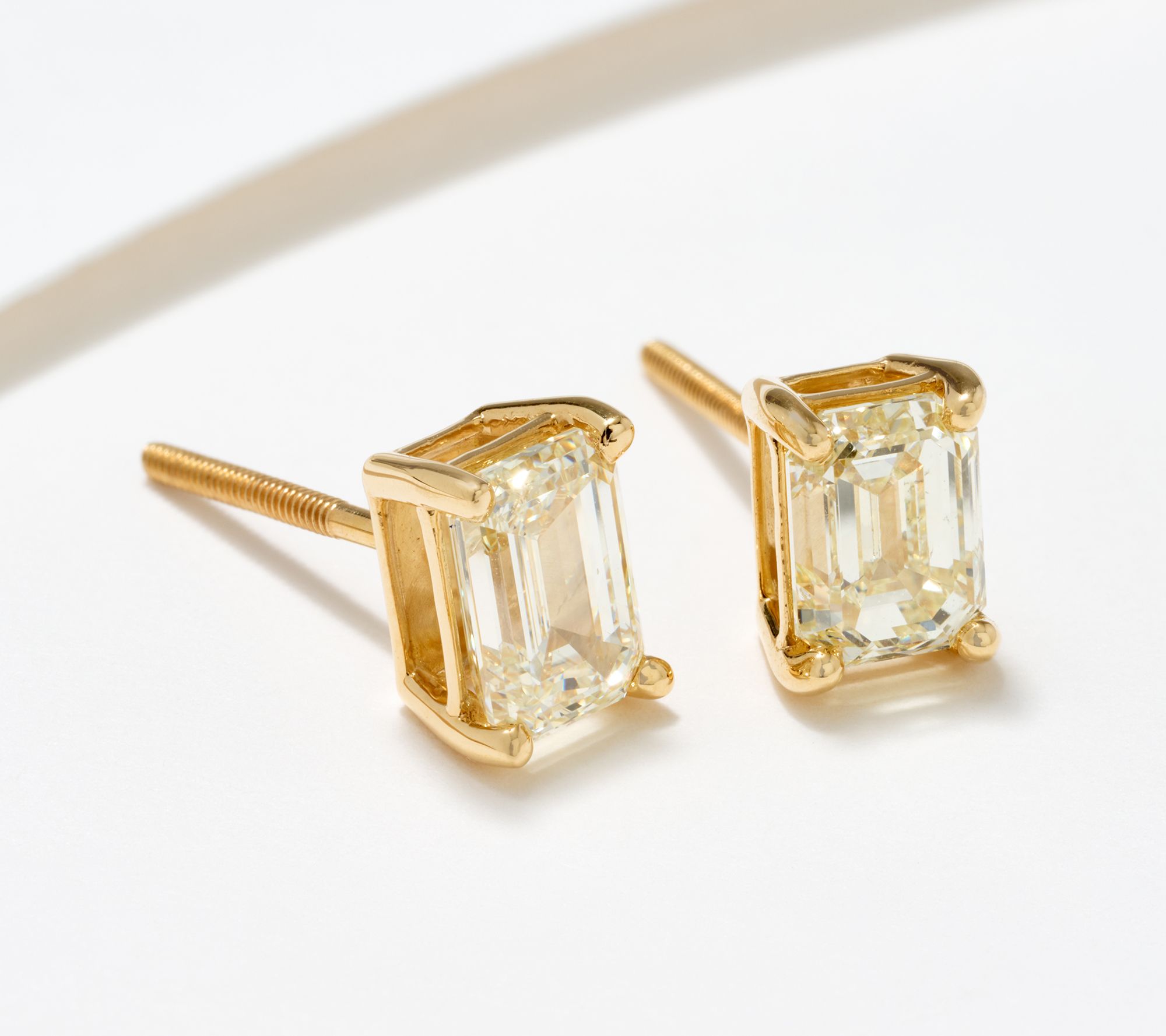 • Stud design in choice of shape; fancy-cut diamonds in choice of yellow or white; rhodium plating on diamond settings; polished finish