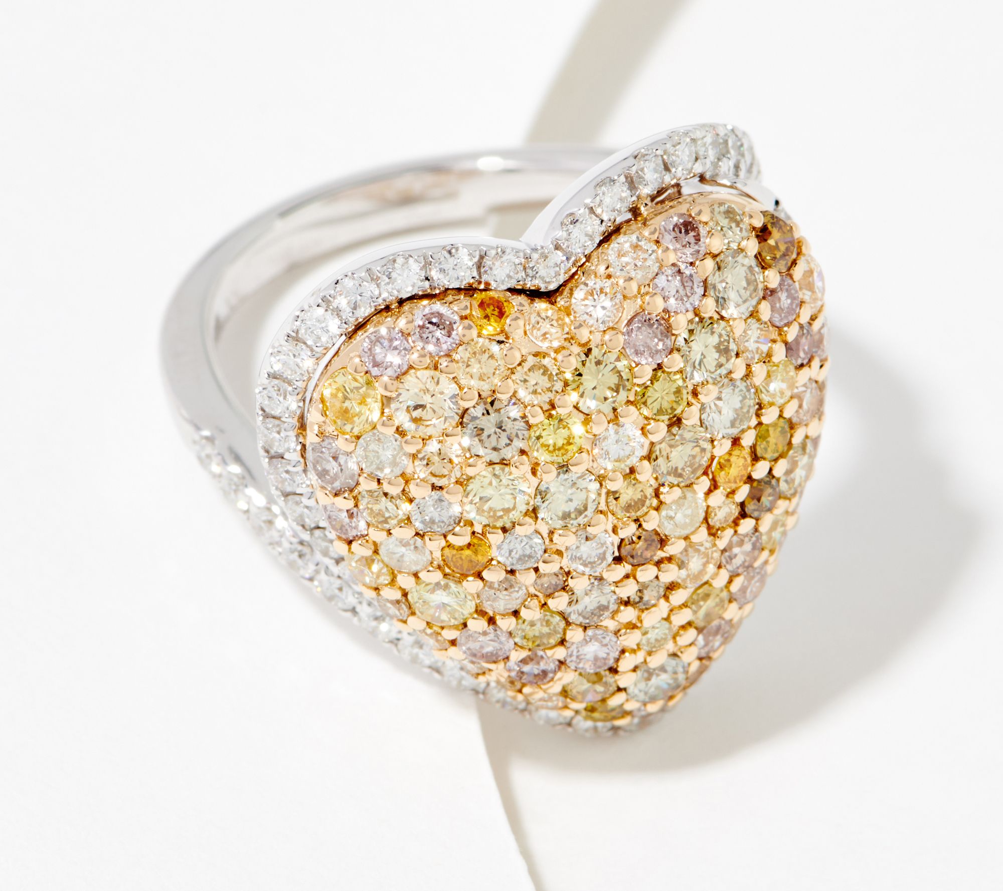 • Heart with green diamonds and yellow diamonds in a random pave-set design; borders with round white diamonds; polished finish