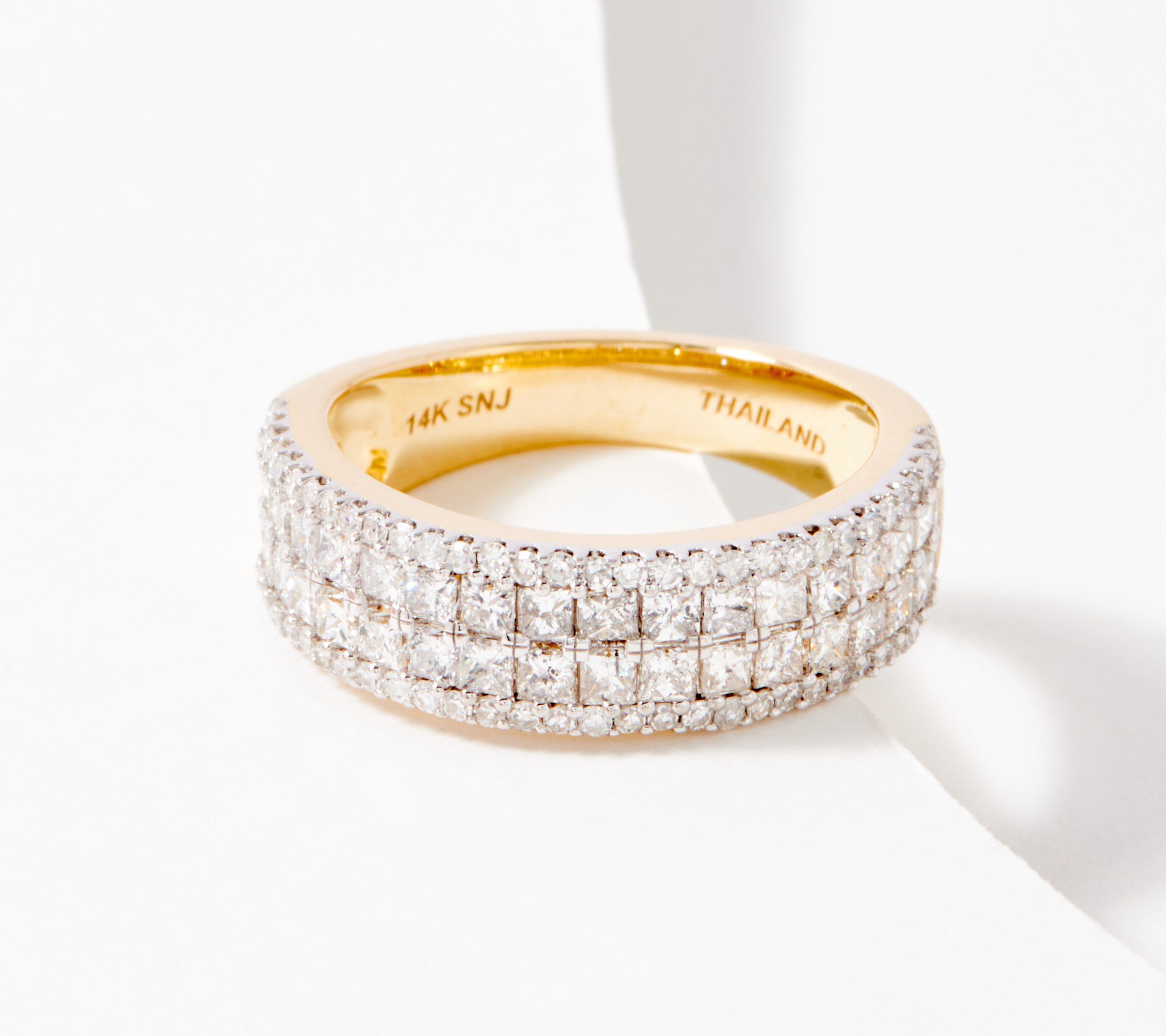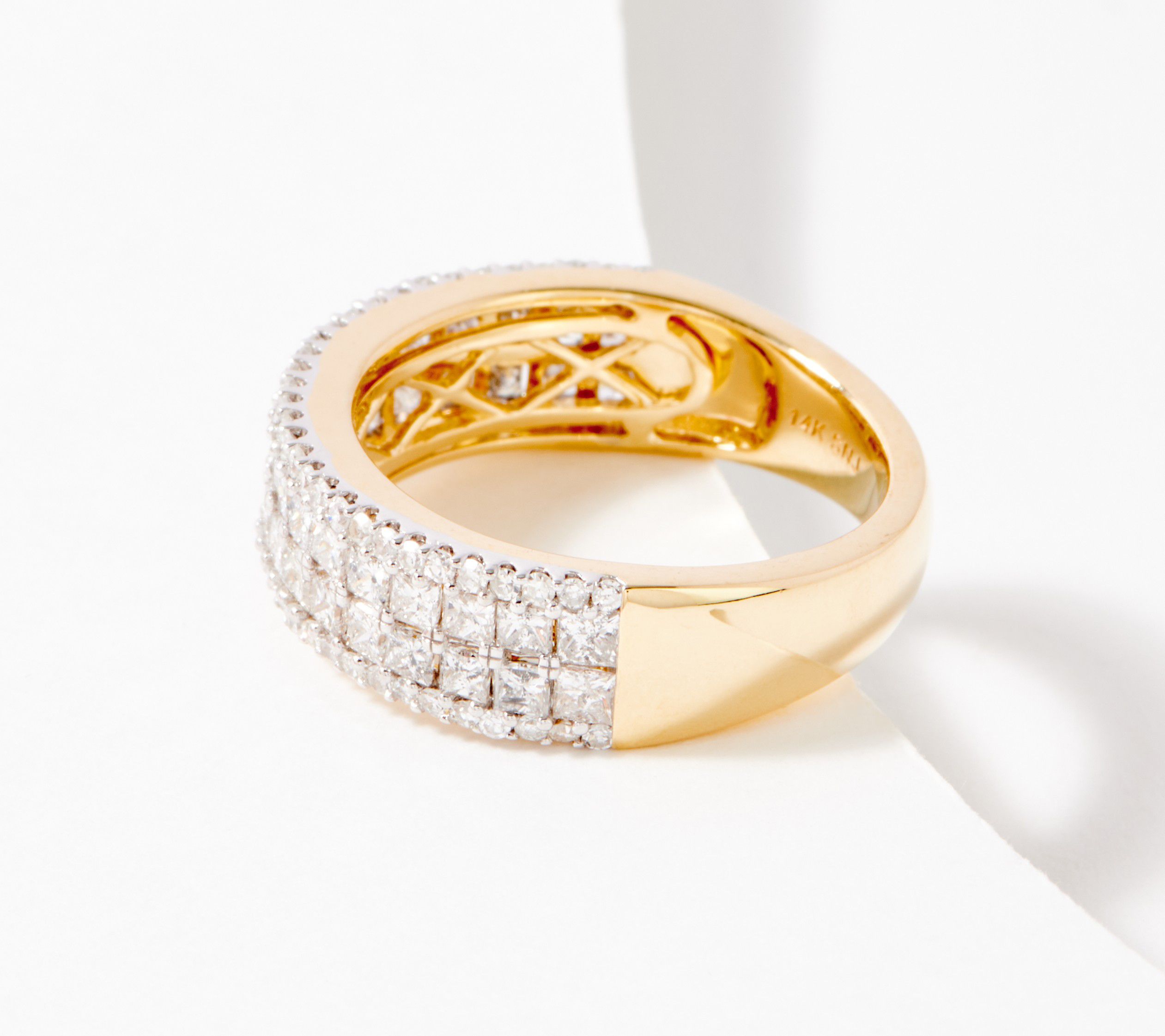 • Double row of prong-set princess-cut diamonds bordered top and bottom by round diamonds; rhodium on prongs; polished