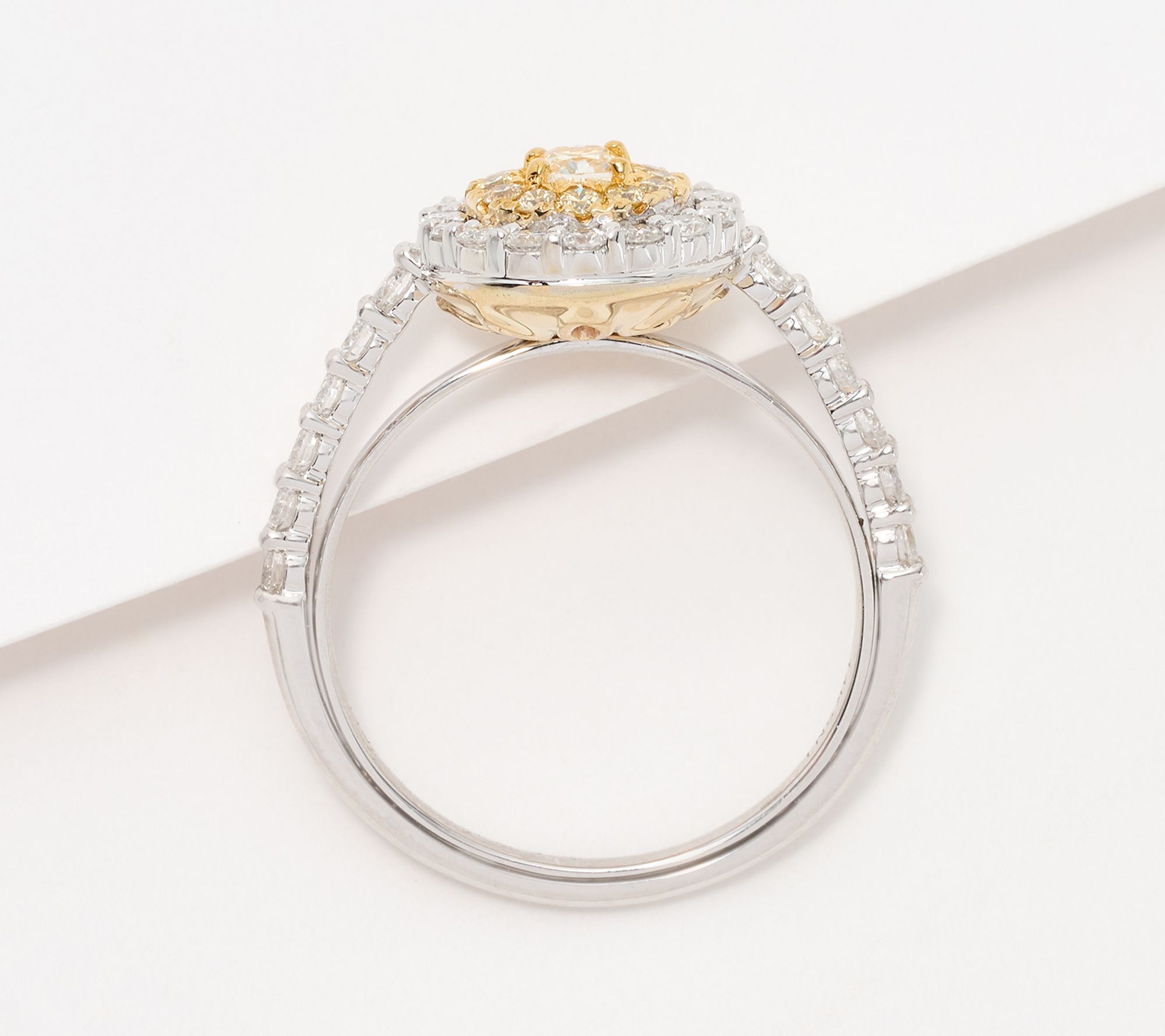 • Cushion-cut yellow diamond; halo of round-cut yellow diamonds and round-cut white diamonds