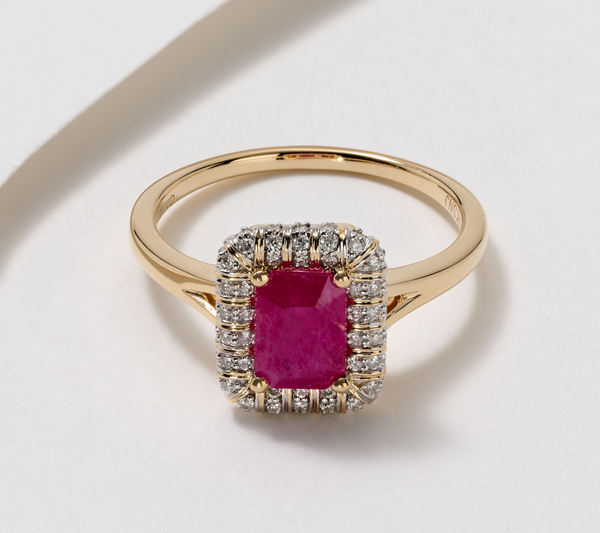 • Emerald-cut gemstone; halo of round, white diamonds