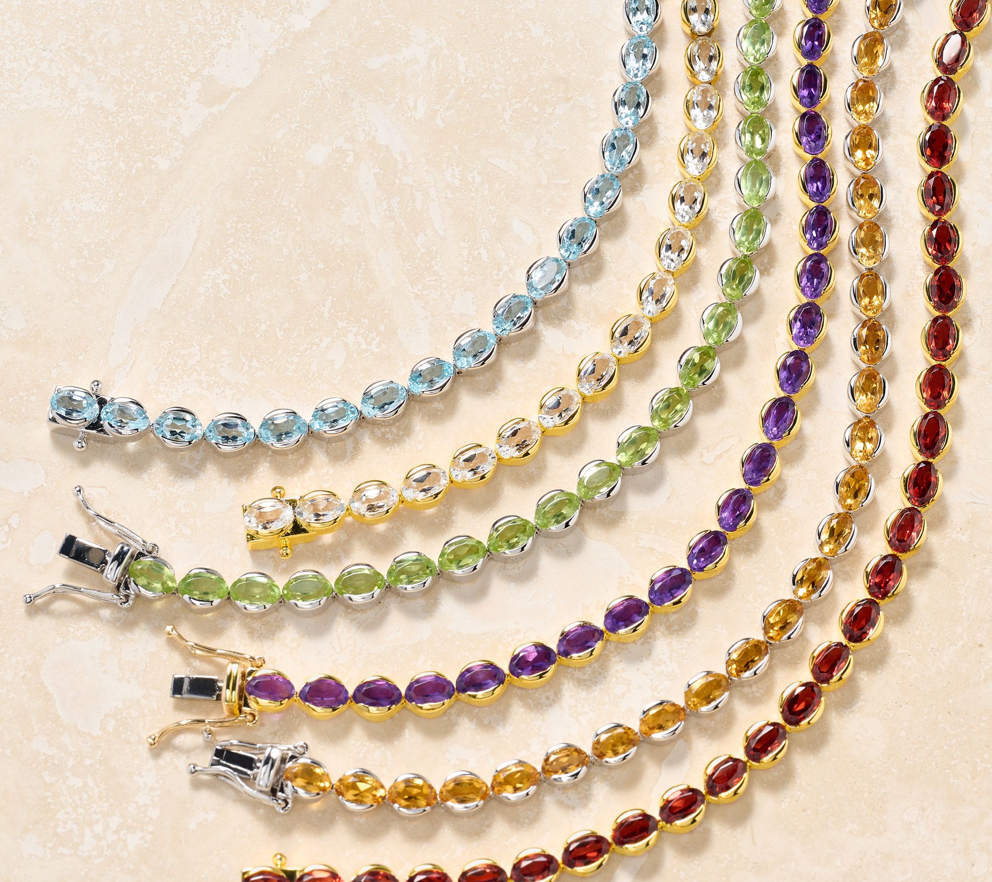 • Semi-bezel-set, oval-cut gemstones in tennis-style design