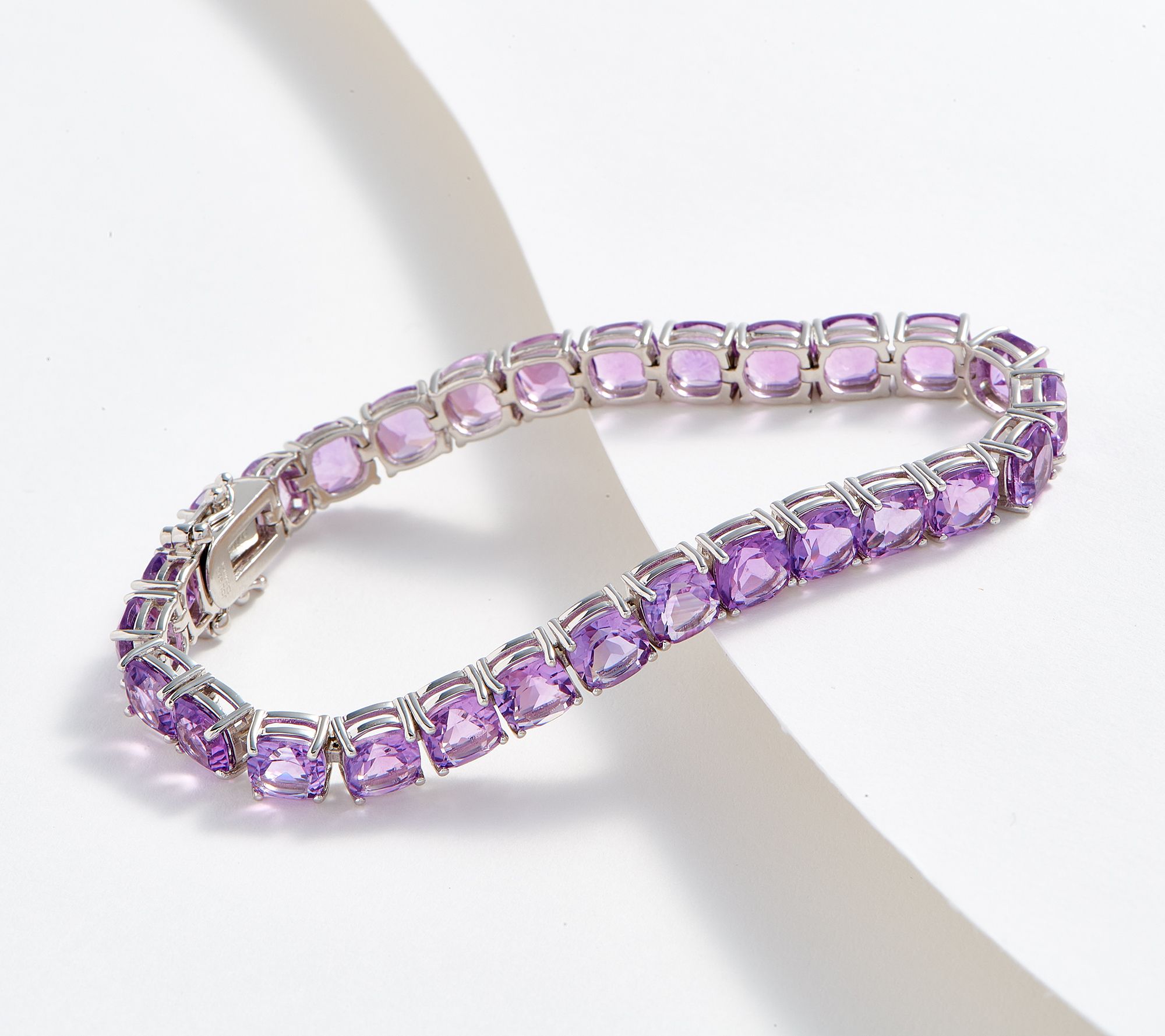• Prong-set, cushion-cut gemstones; white rhodium plating; polished finish