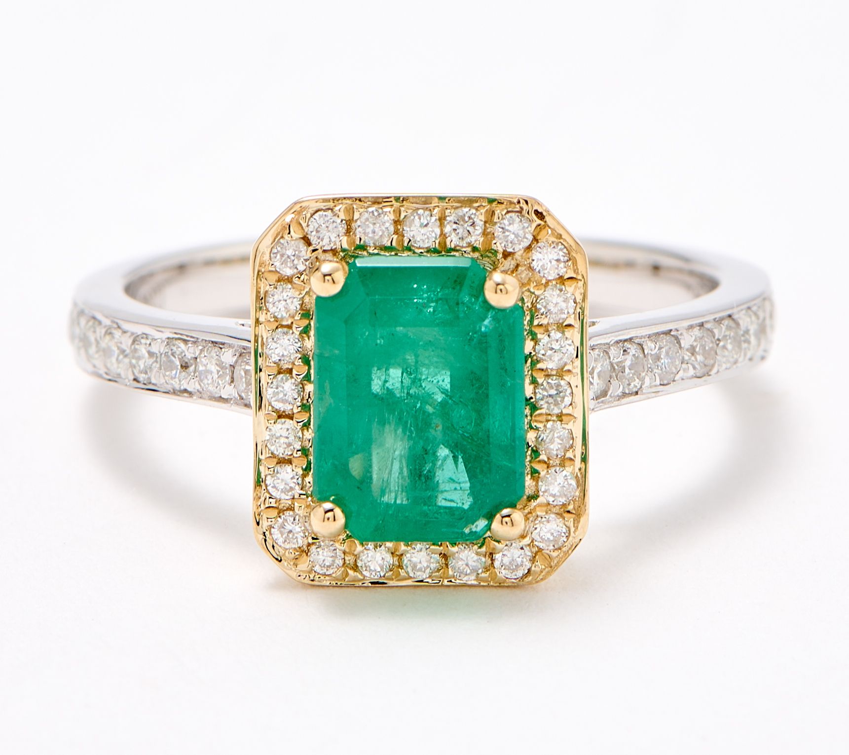 • Emerald-cut emerald center gemstone; halo of round diamonds around center gemstone and on shank; polished finish