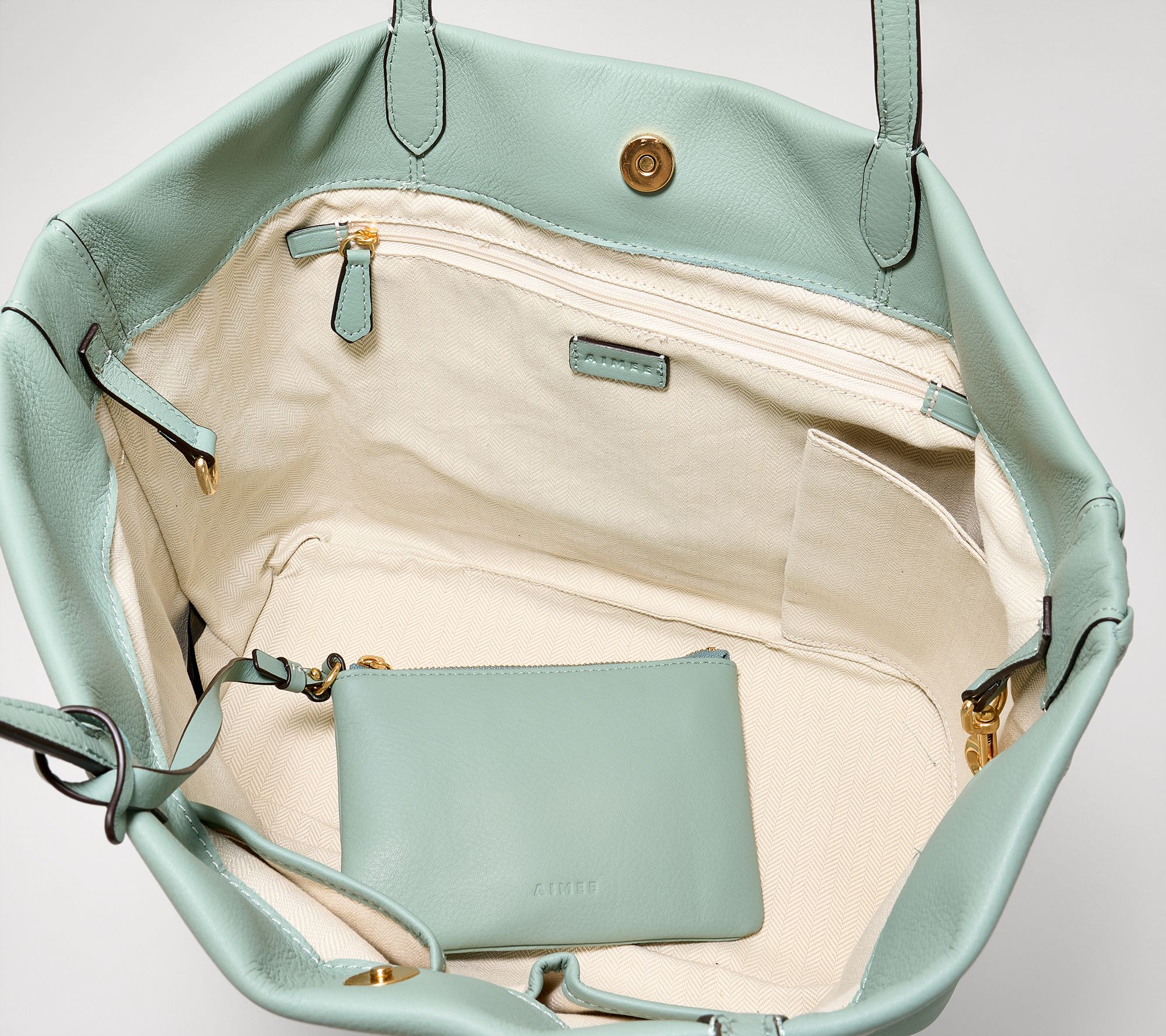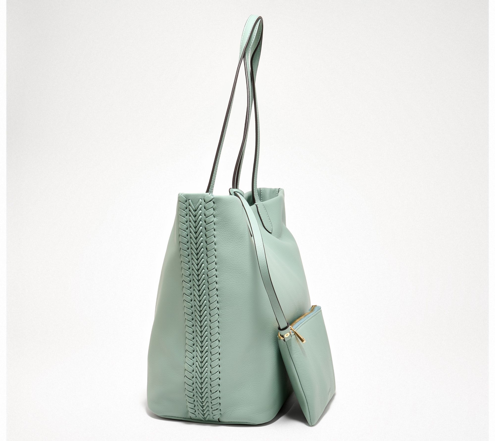 A stylish companion for busy days, this convertible leather shopper easily transitions from workplace commutes to weekend outings with a detachable pouch that keeps essentials close at hand. Decorative whipstitch braiding and gleaming dome stud feet bring that unmistakable Aimee flair, while an interior water bottle holder and pockets help keep must-haves neatly stowed for every adventure. From Aimee Kestenberg.