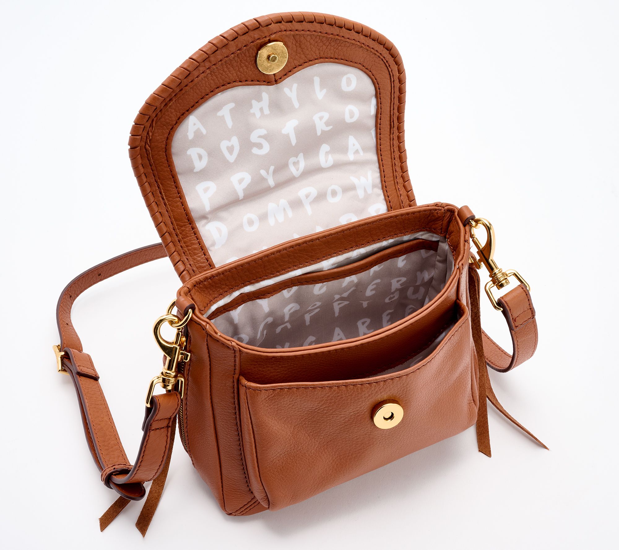 This soft and slouchy crossbody bag is made to wear on the go. With woven leather detailing on the flap, a bit of flair is added to the compact-yet-functional sized carryall. An adjustable and removable shoulder strap brings versatility and comfort, keeping you prepared for whatever the day brings. From Aimee Kestenberg.