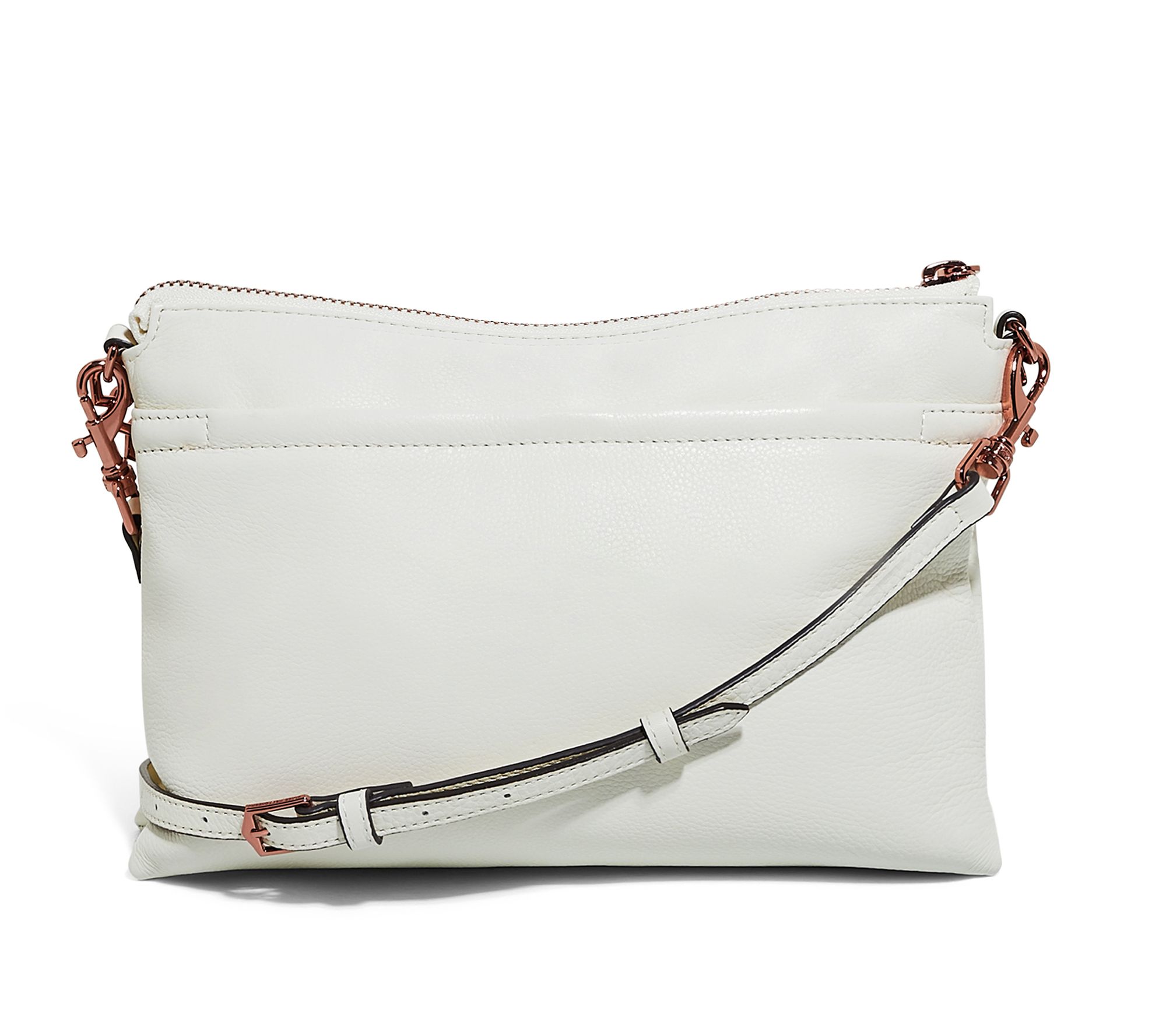 • Heart link chain handle, adjustable crossbody strap, back slip pocket, top zip and snap closures