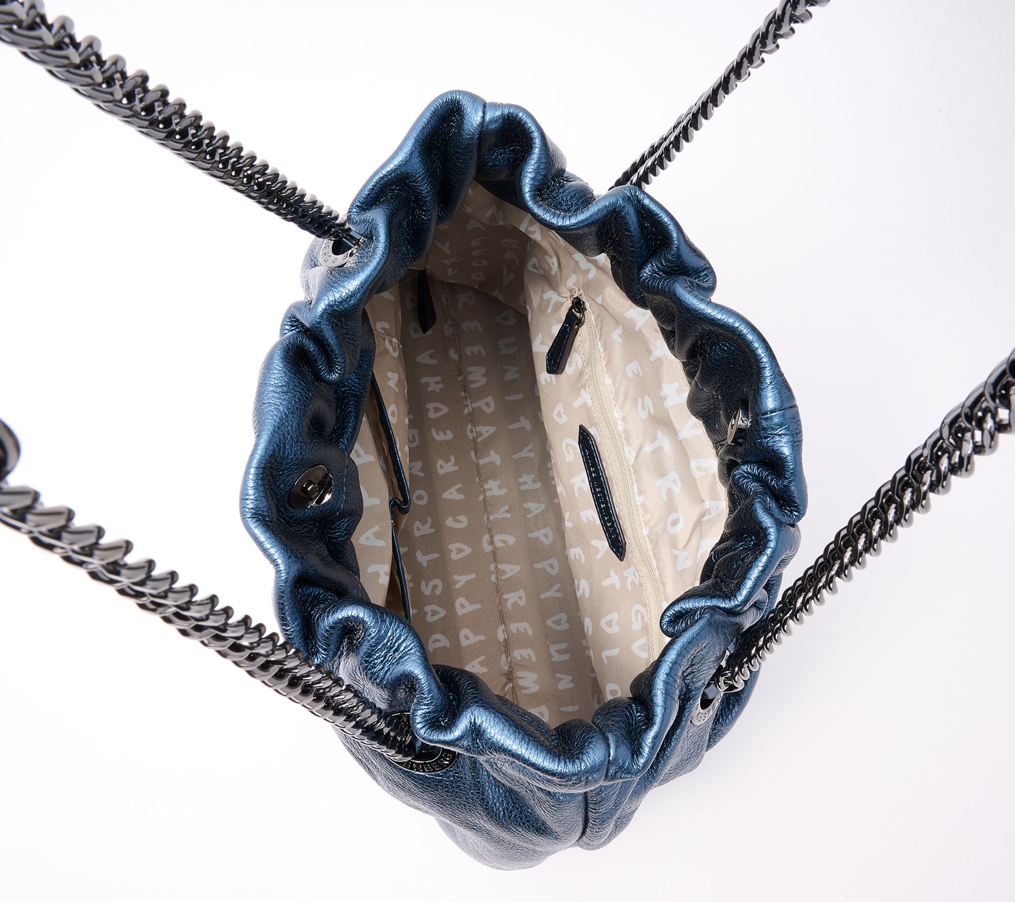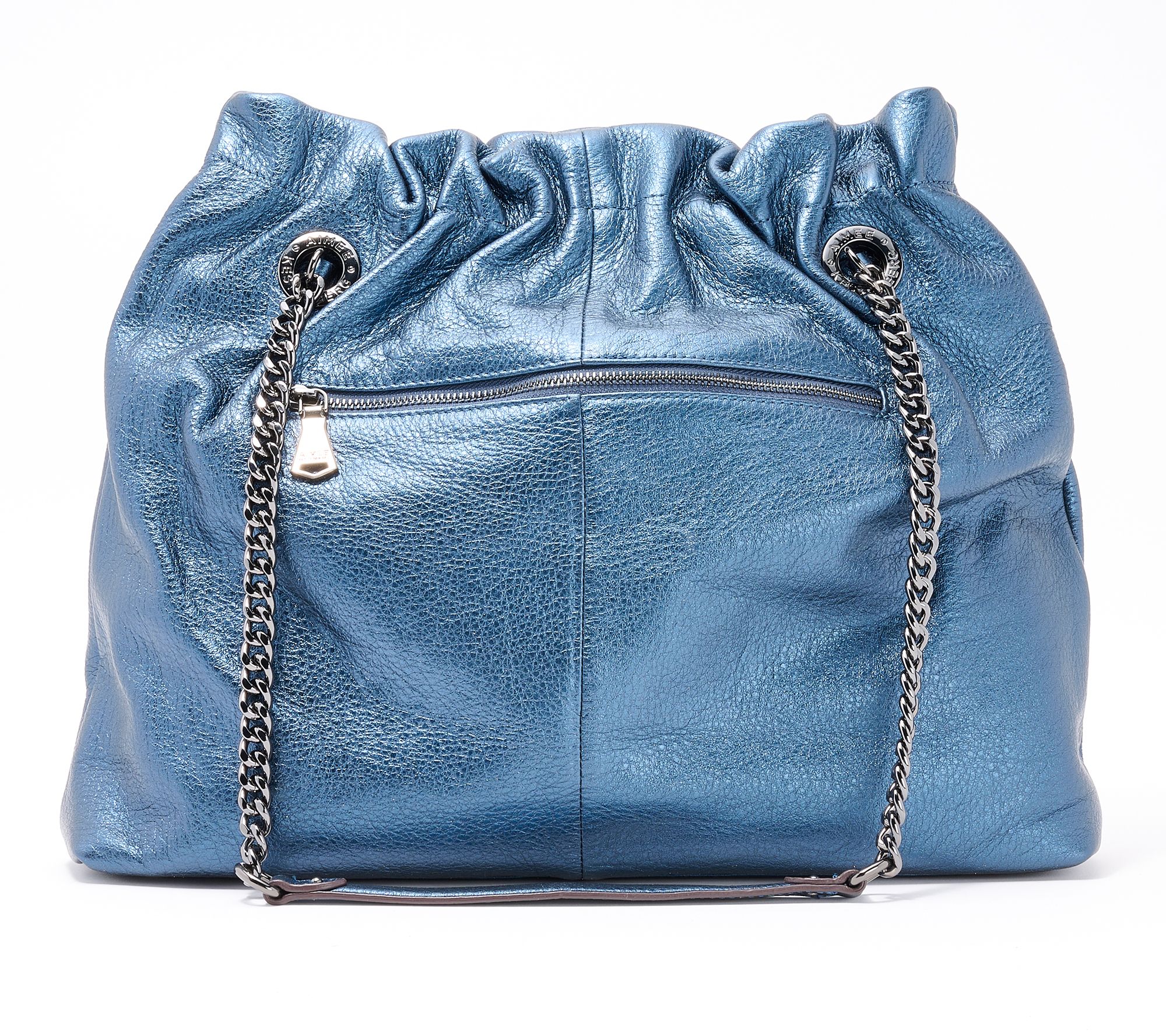 With a feminine rouched closure and a chain strap to double or go long, this tote does it all with style and ease. Enjoy the convenience of multiple pockets while flaunting custom hardware and oversized grommets. From Aimee Kestenberg.